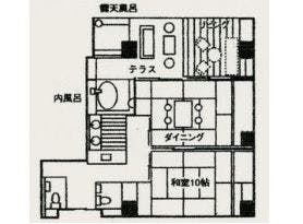 エントランス+和室(10帖)+掘り炬燵風ダイニング(10帖)+ミニキッチン+洗面+トイレ+内風呂+テラス(客室露天風呂+リビング)