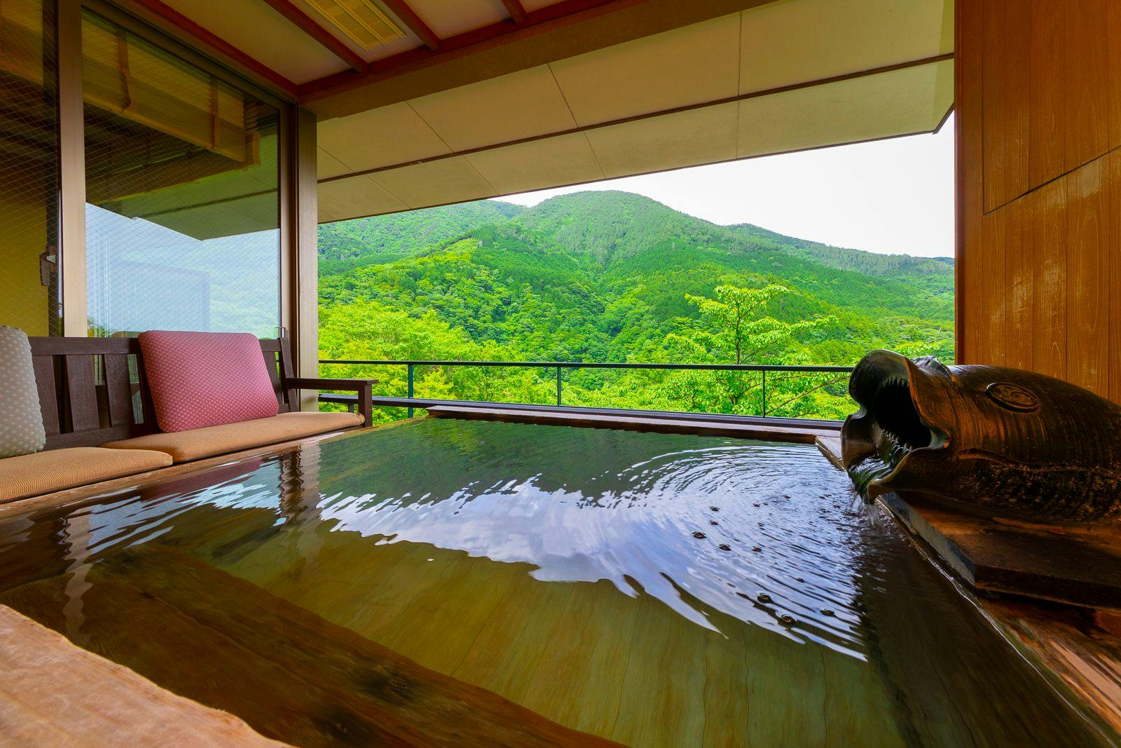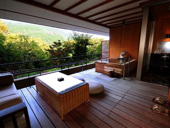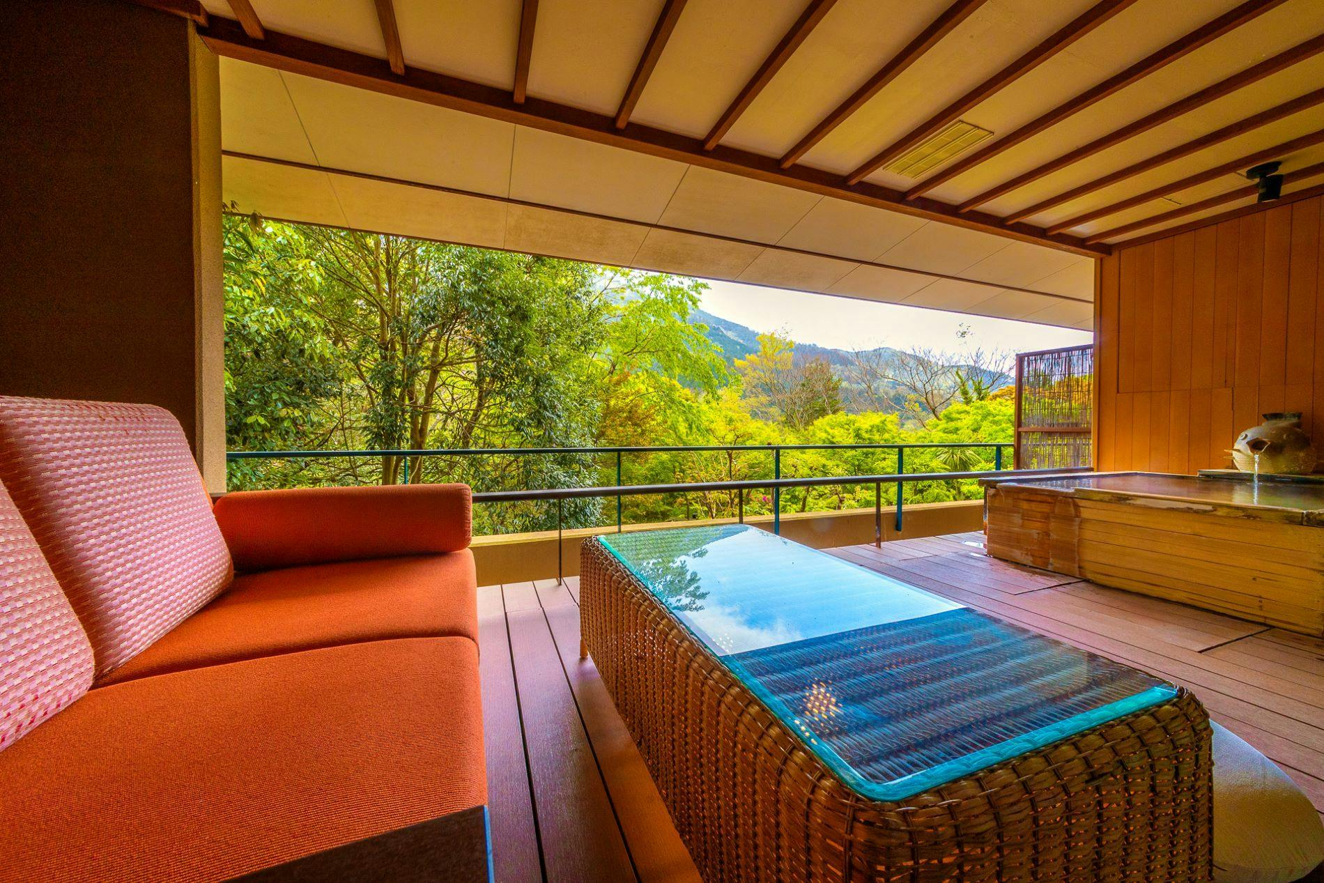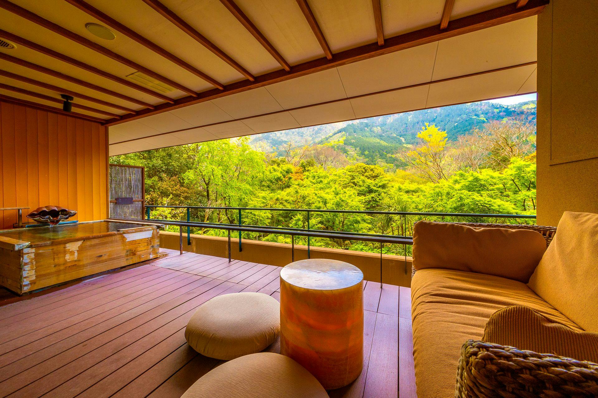 風タイプは4Fに1室のみのお部屋です。オープンテラスの露天風呂と内風呂を備えます。客室露天風呂や展望リビングから箱根連山の絶景を望めます。