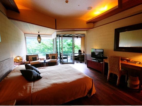 エントランス+ダブルベッド(クイーンサイズ)ルーム+ダイニングルーム+ミニキッチン+洗面+トイレ+内風呂+テラス(露天風呂+リビング)