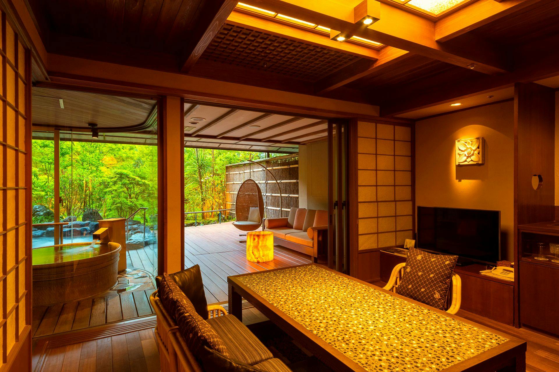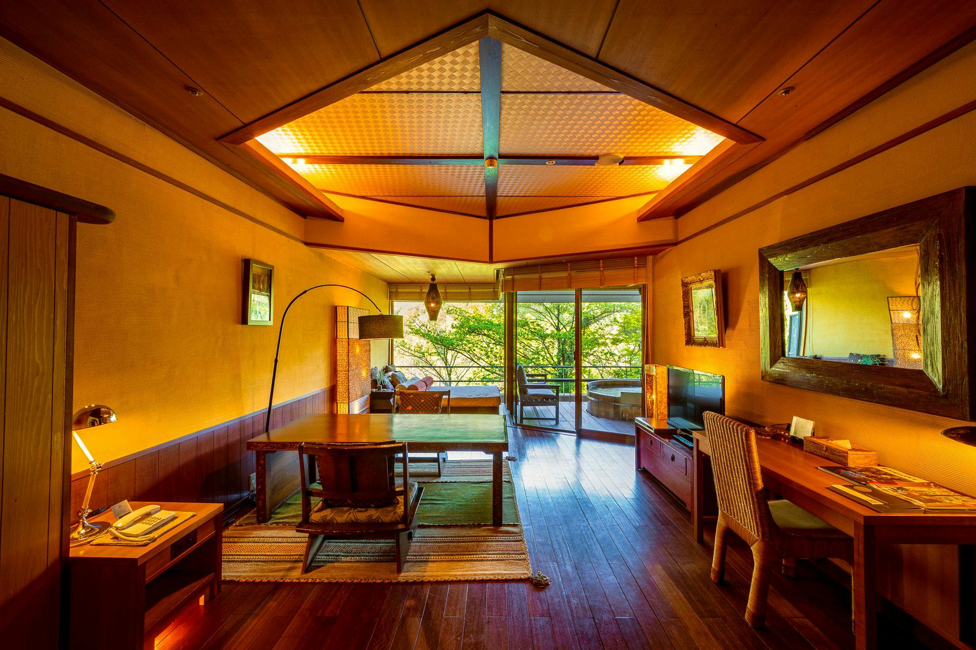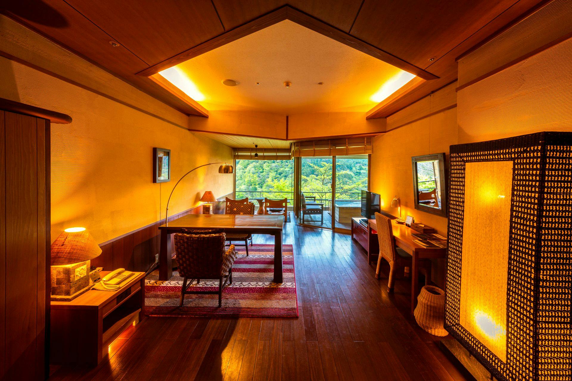 和室タイプは、ご家族や小グループでのご利用も可能です。畳敷きの和室でゆっくり横になってお寛ぎください ませ。 ご夕食、朝食共に、お部屋までお運びいたします。和室ですが、ダイニングは掘り炬燵式になっておりますので、足元も楽に伸ばせます。ラウンジ・バーからお飲み物もお運びしますのでお申し付けください。