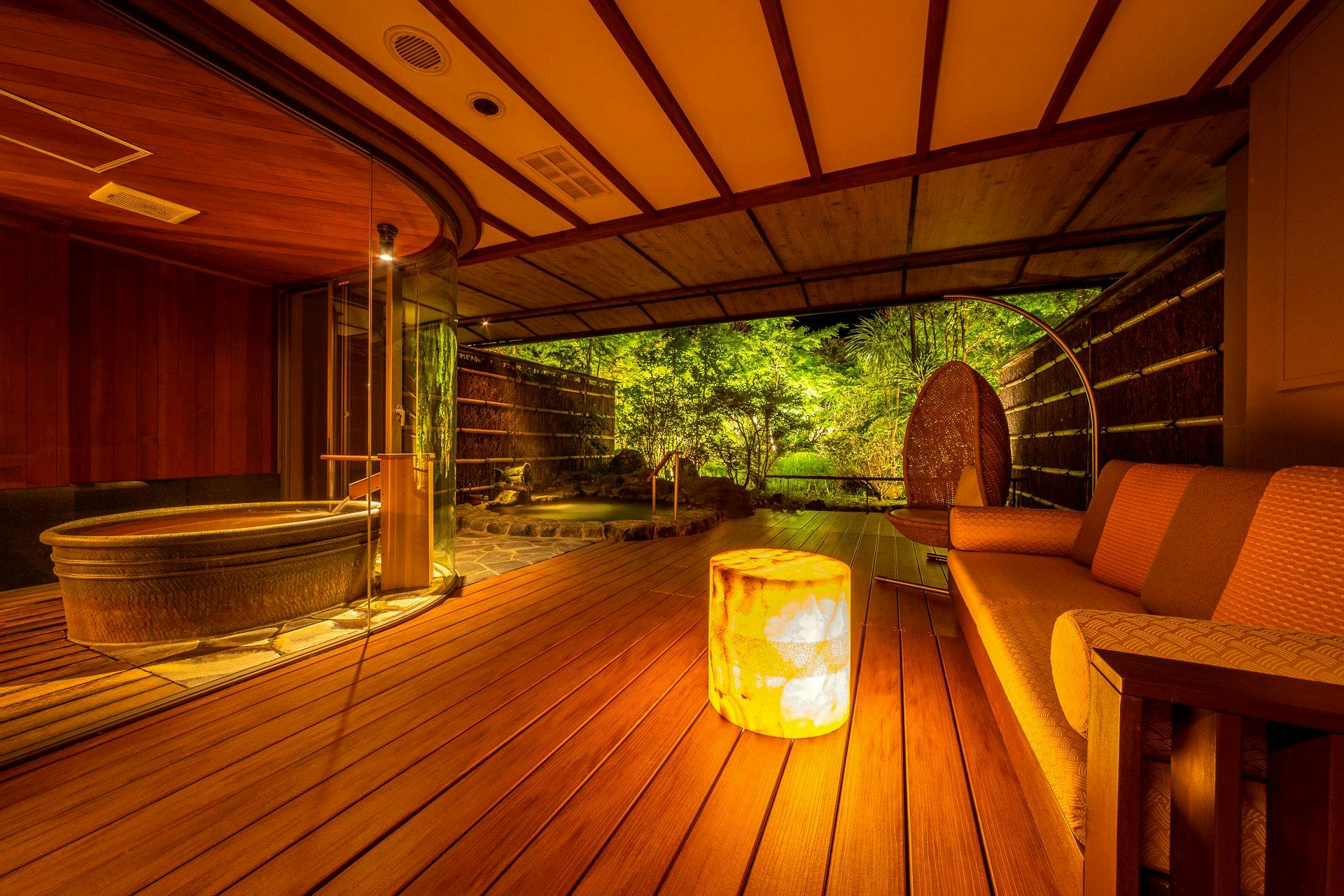 月タイプは一番下の階(1F)にあり、広いオープンテラスに、箱根の森に包まれながらご入浴いただける、野趣あふれる温泉露天風呂が備わります。 リビング続きになったオープンテラスにはソファーやリクライニングチェアを配しました。またテラスに面した内風呂も備えております。自然と一体につながりながら、天候に依らず快適にお寛ぎいただけるラグジュアリースペースでリゾート気分を満喫してください。和室タイプと洋室タイプの2タイプご用意しております。