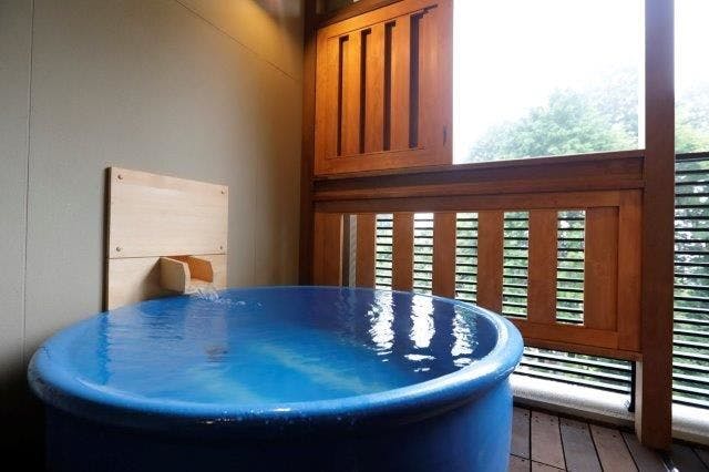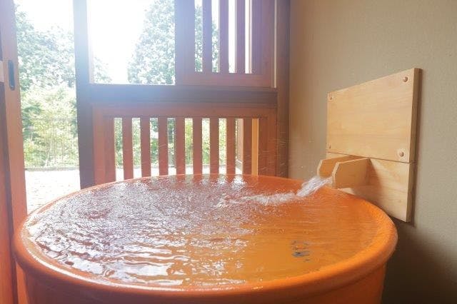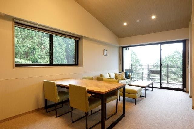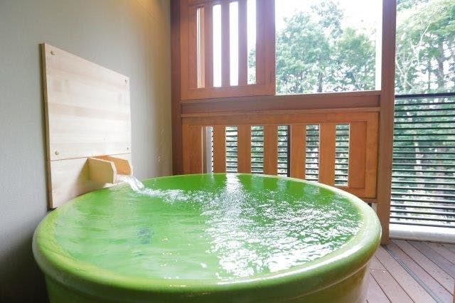 大涌谷から引湯した白濁の温泉大浴場。気兼ねなく愛犬との時間を過ごすお部屋食と静寂の森