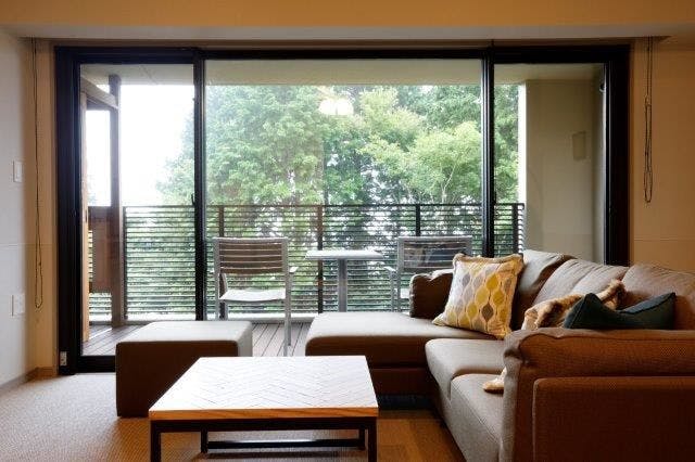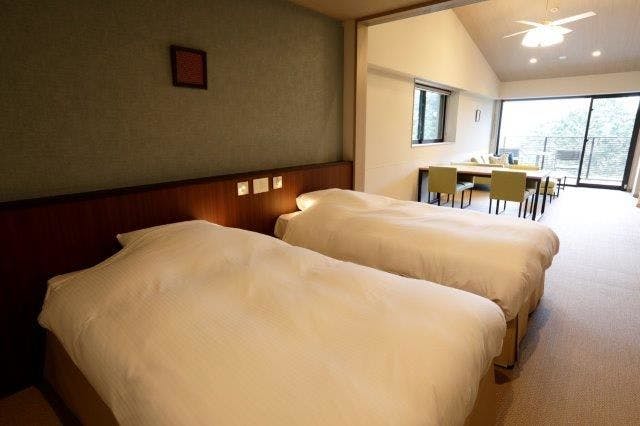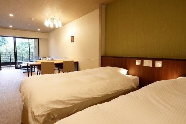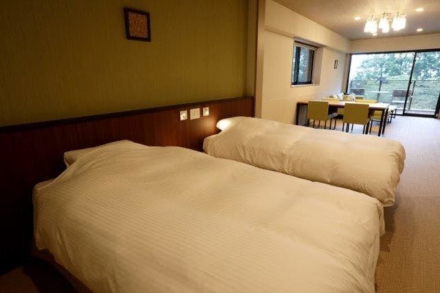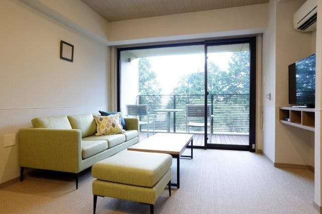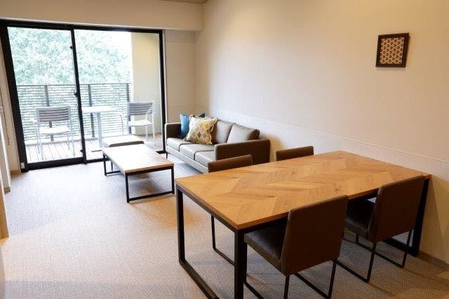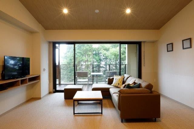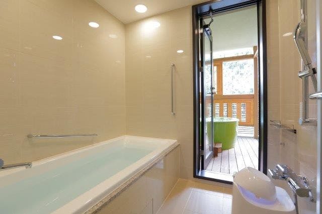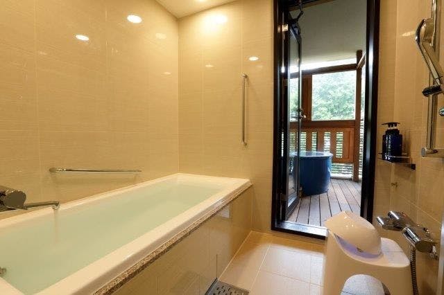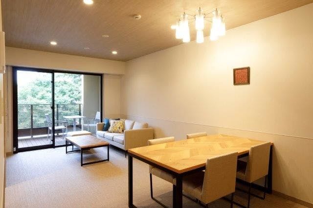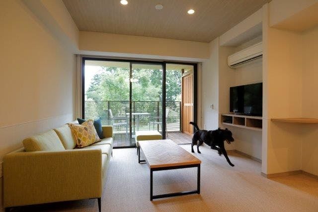 全室を一体的に利用できるお部屋のため愛犬に目が届きやすく、初めての場所で不安になりがちな愛犬も安心して過ごせます。・バリアフリー・23m平米のプライベートドッグラン付 (人工芝)・愛犬用シャワー付広さ46平米+露天風呂付テラス8平米(温泉ではありません)