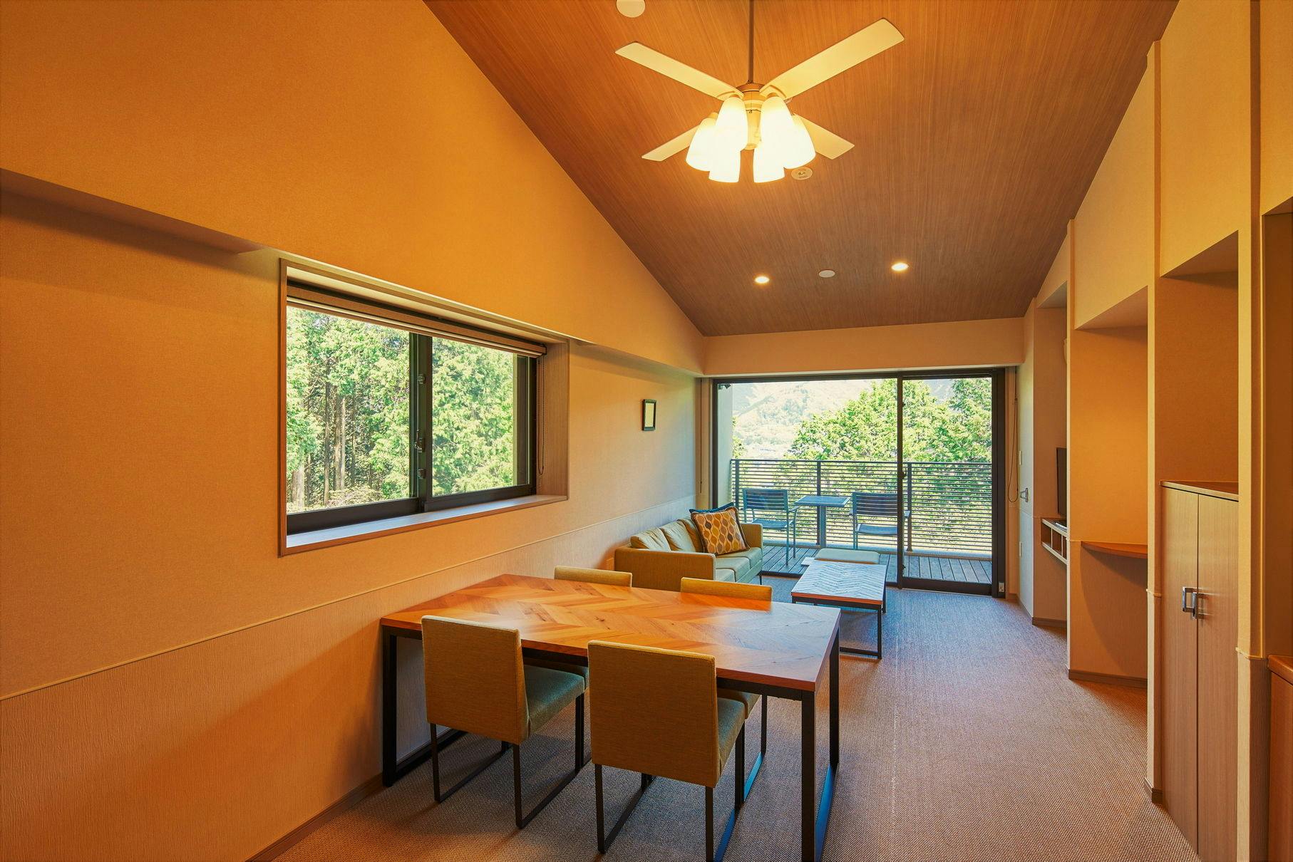 <特長>全室を一体的に利用できるお部屋のため愛犬に目が届きやすく、初めての場所で不安がちな愛犬も安心して過ごせます。【コンフォートルーム限定サービス】チェックインの後、お茶とお菓子をお部屋にお持ちいたします。・バリアフリー・露天風呂テラス11平米・コーナールーム・開放感のある最大3.6Mの勾配天井