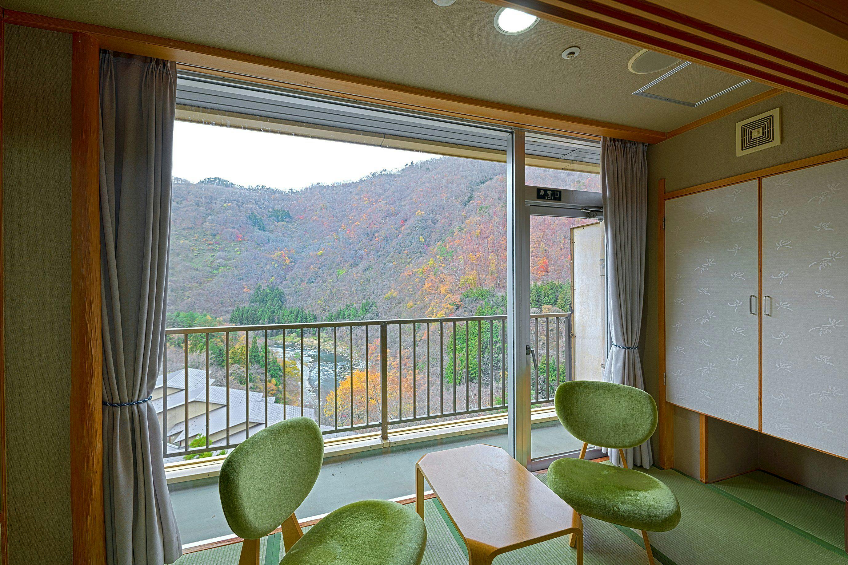 渓谷を望む、高層階、和室12畳+広縁、40平米の広々タイプ。<設備などのご案内>風呂/洗面/洗浄器付トイレ/冷房/暖房/電話/金庫32インチ液晶テレビお茶セット/湯沸かしポット/冷水ポット/タオル/バスタオル/歯ブラシ/石けん/ドライヤー/くし/浴衣/丹前/スリッパ大浴場にシャワーキャップ/かみそり/綿棒がございます。<お部屋定員> 2~5名