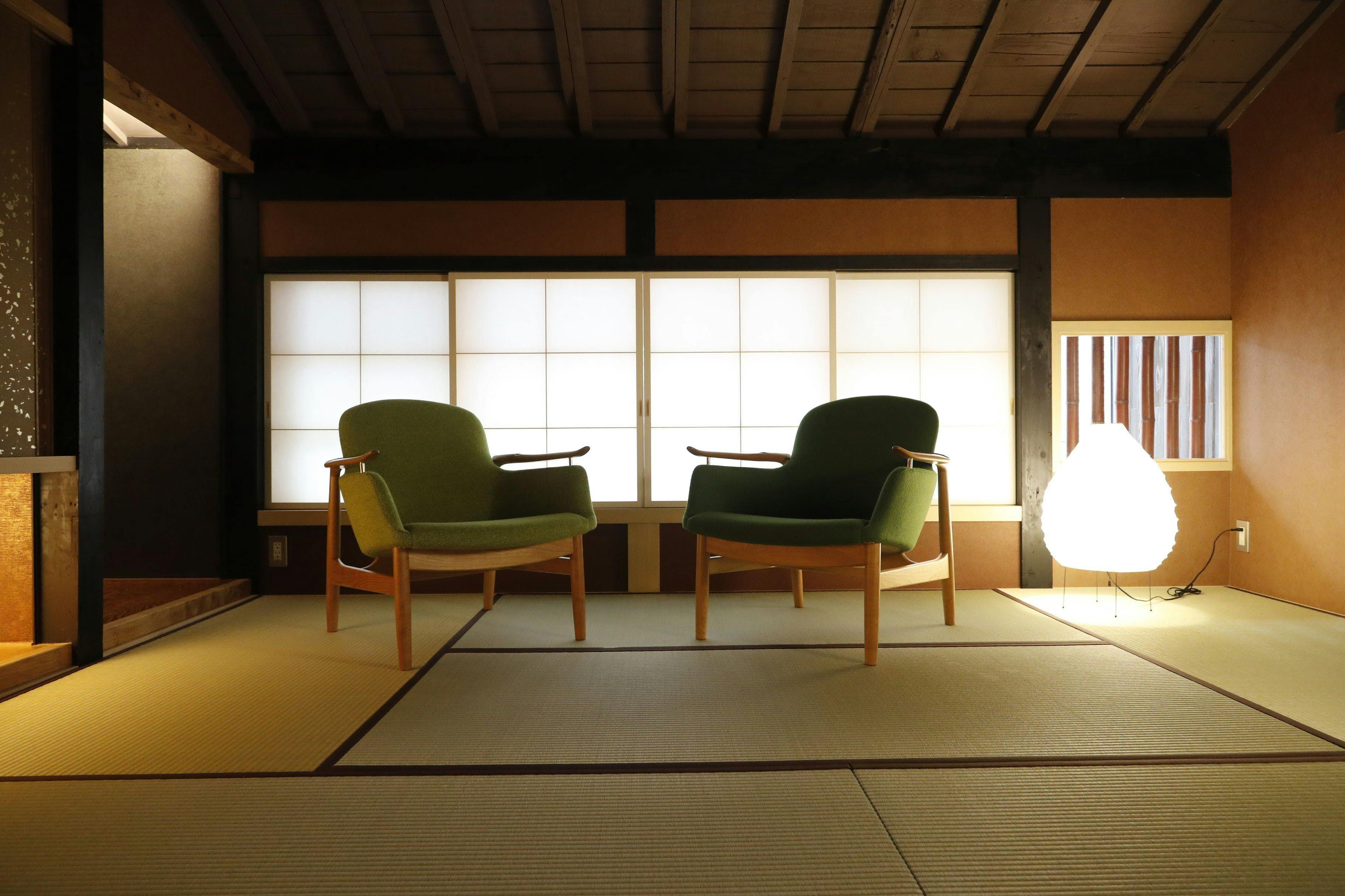 京都で数々の実績を持つ荻野寿也氏が作庭した風情あふれる庭を2階から見下ろします。さらにこの客室は土間の吹き抜けに面したセカンドリビングがあるのも特徴。家具もアルネヤコブセンの「スワンチェア」などが配置された贅沢な客室です。ひとり旅でもご利用いただけます。