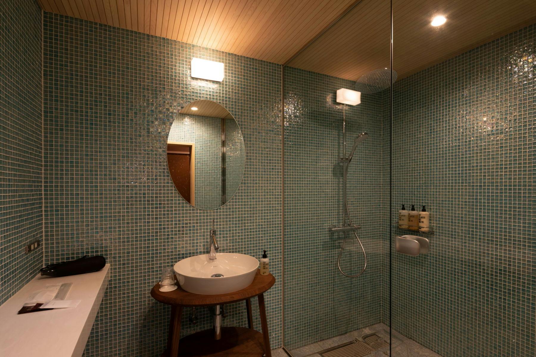 旧東海道に面した客室。出格子からは旧東海道を行き交う人々を眺めることができます。あえてバスタブを付けず、シャワールームにしています。ひとり旅にもおすすめです。