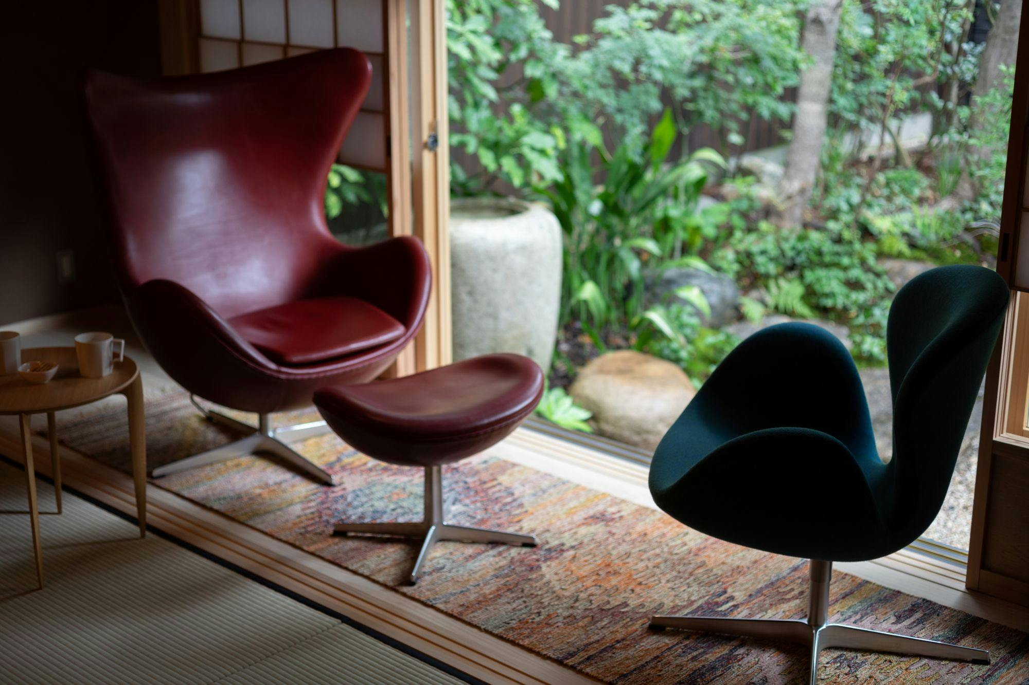 この庭に1階で面しているのは101のみで、茶会を開くこともできる風情あふれる和室です。家具もアルネ・ヤコブセン「エッグチェア」など、グレードの高い家具が置かれています。ひとり旅でもご利用いただけます。