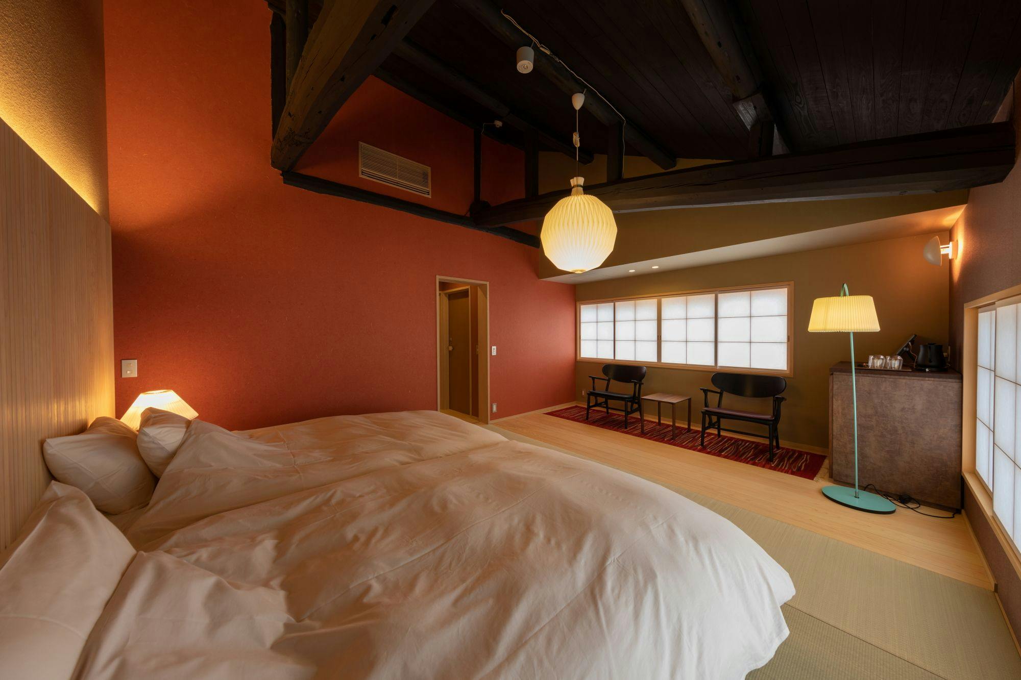 スタンダードタイプながら天井が高く、古材の梁が印象的な客室。「鍵屋」へ続く、車の通らない路地に面している静かな客室です。小さいながらもリビングスペース、デスクがありリモートワークにもお勧めです。ひとり旅にもおすすめです。