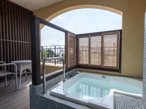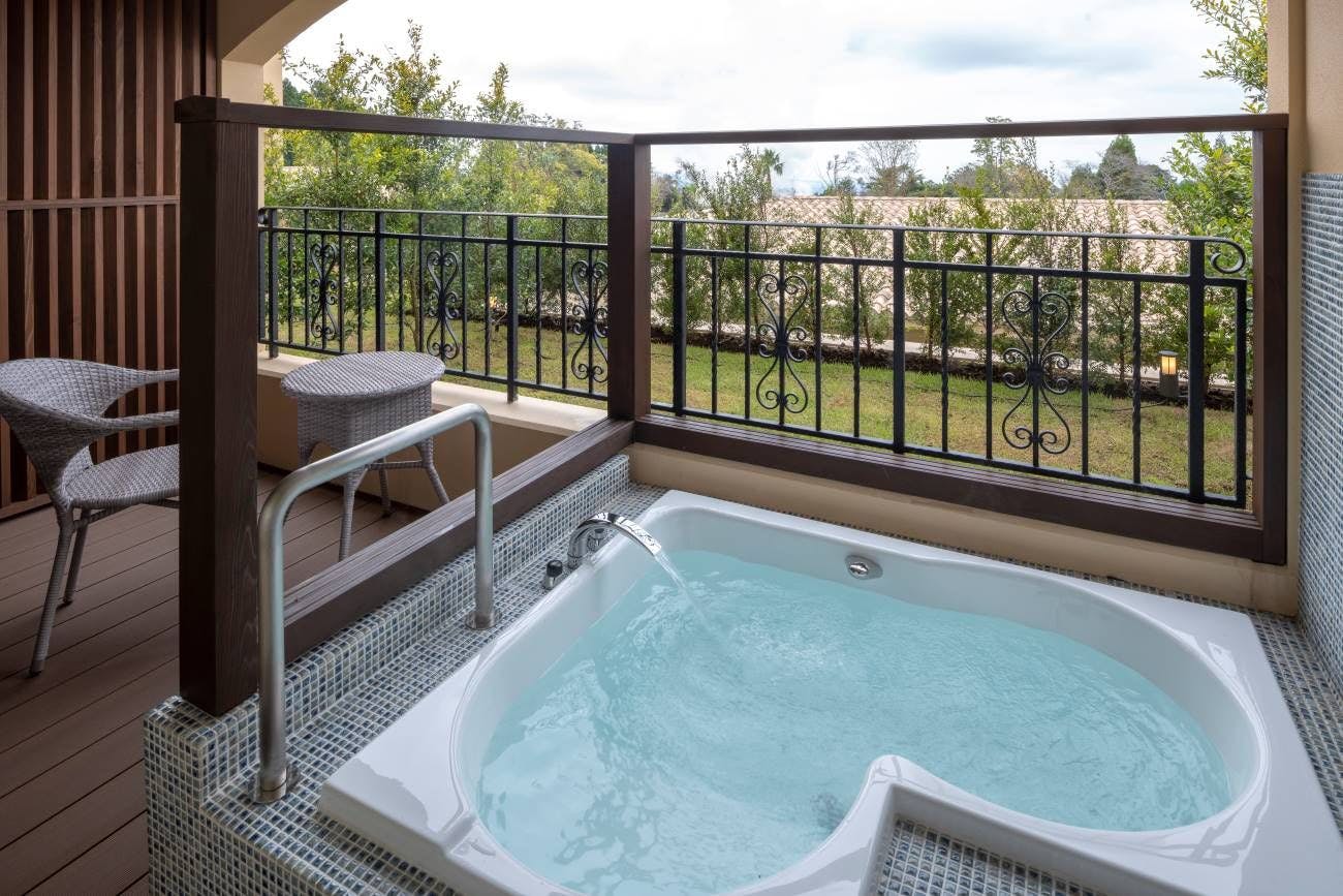 快適性と機能性、リゾート感を兼ね備え、室内は南欧調の設え、テラスには半身浴も愉しめる天然温泉を引き込んだハート形の