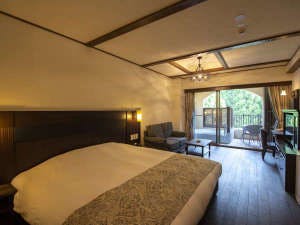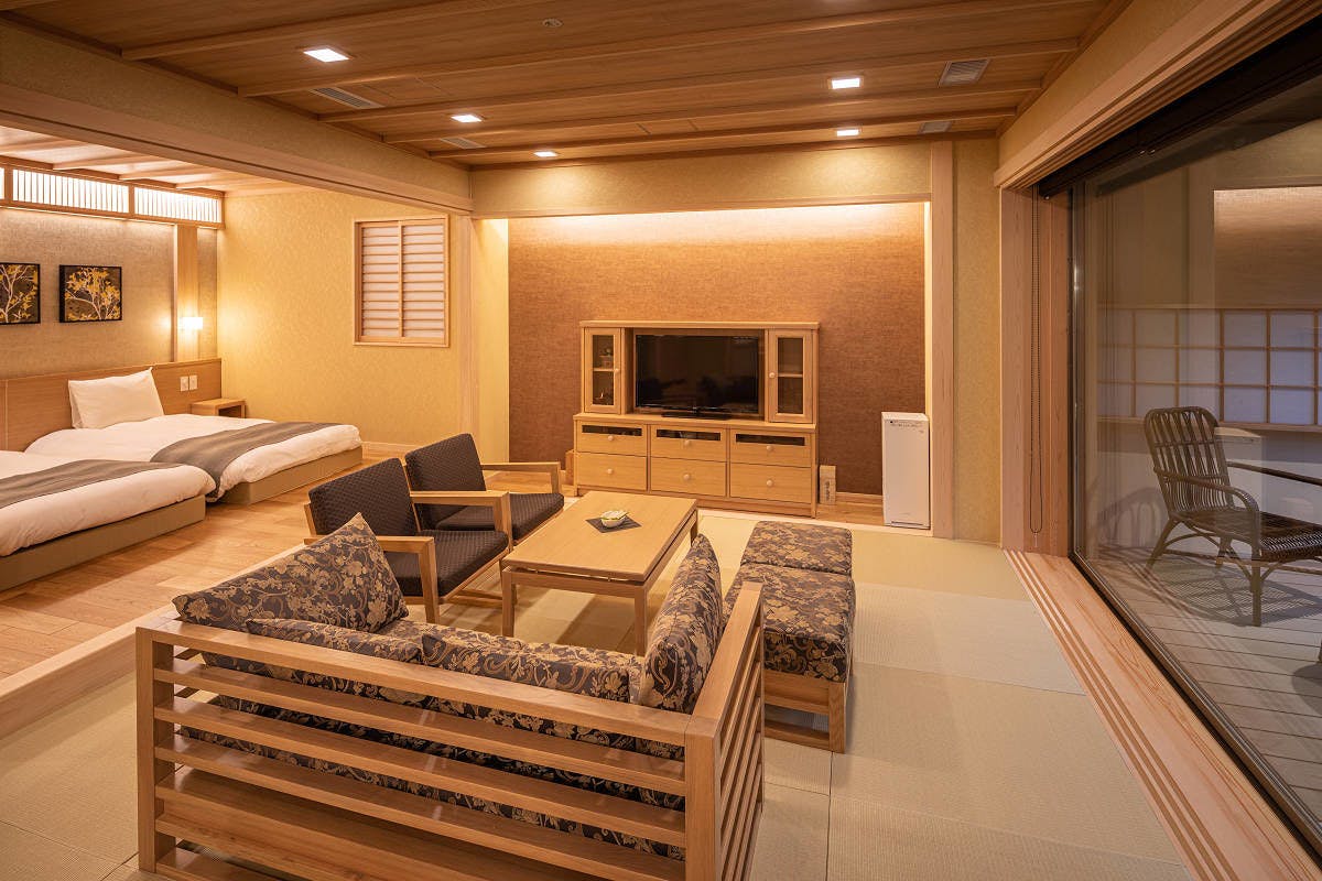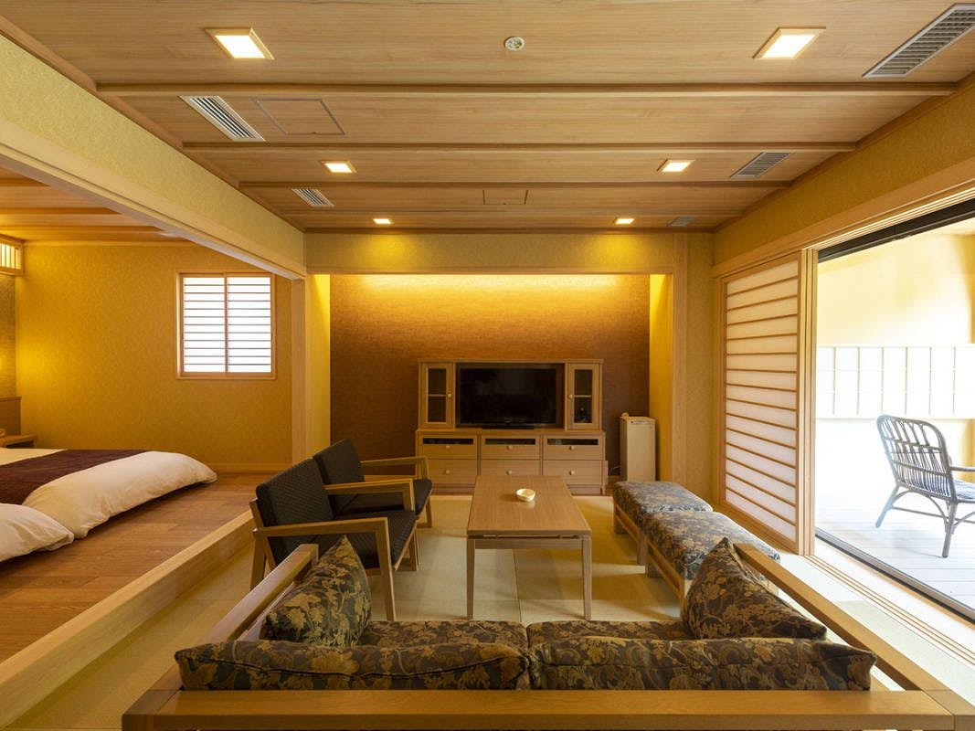 畳敷きの和洋室に檜の露天風呂を備え、和の温もりと寛ぎを感じさせる「特別和洋室」。