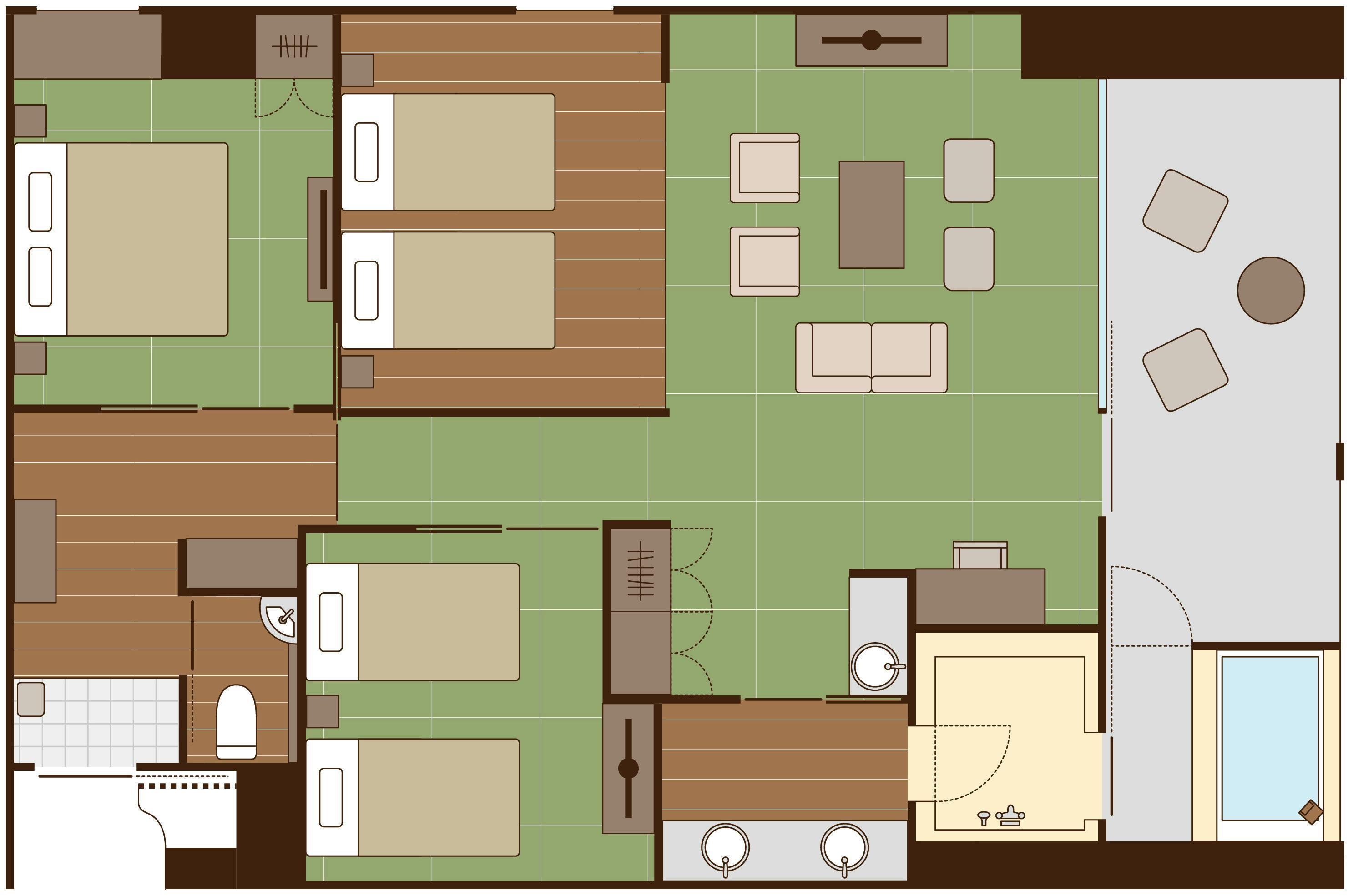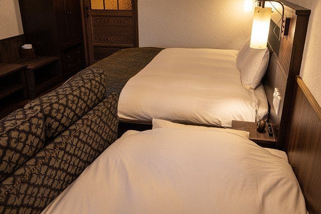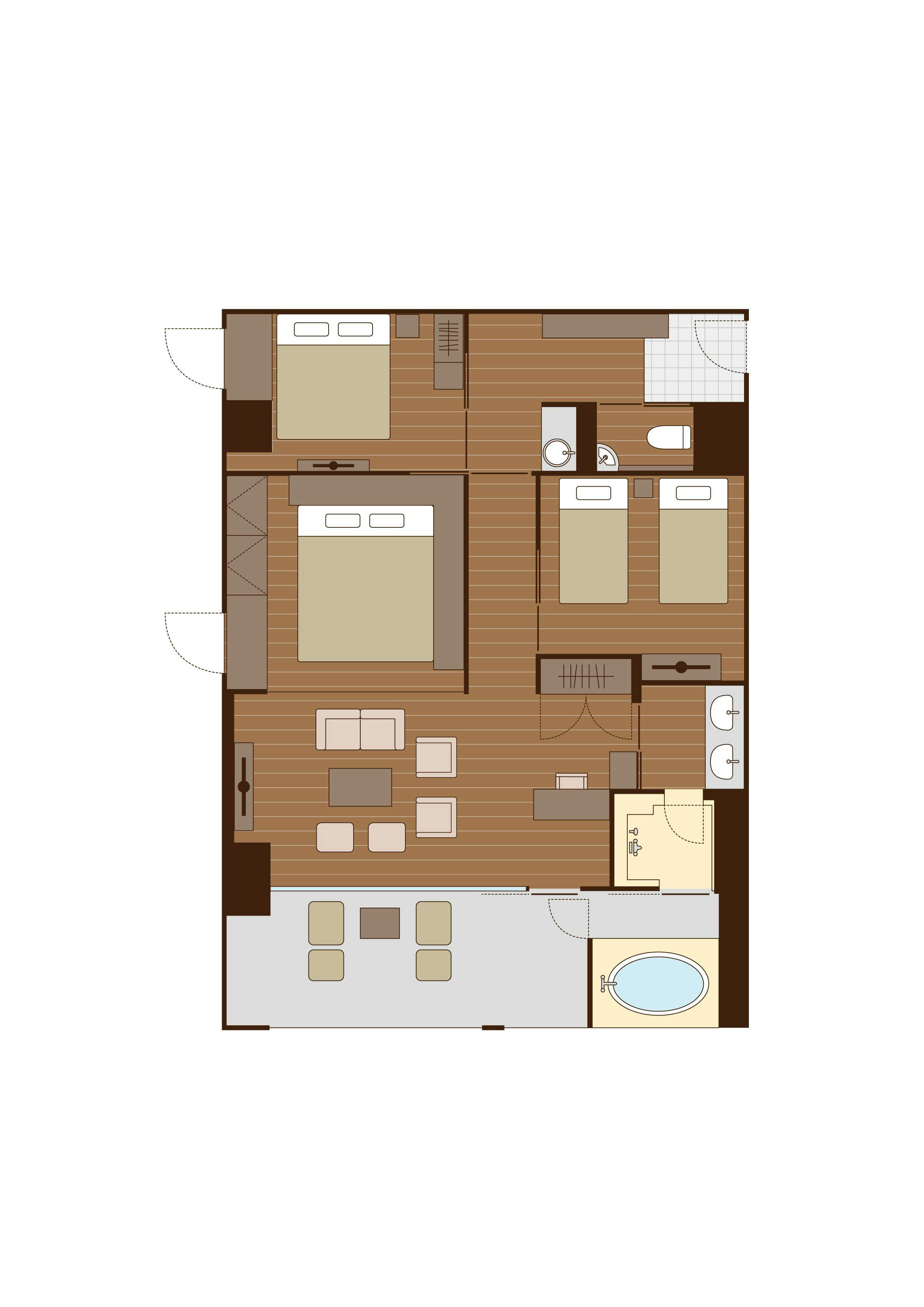 リビングに併設された「ツイン」のベッドと、独立した寝室には「ハリウッドツイン」のベッドで4名様までゆったりとお泊り頂けます。
