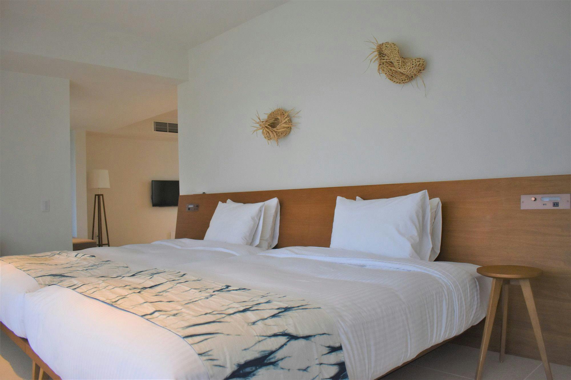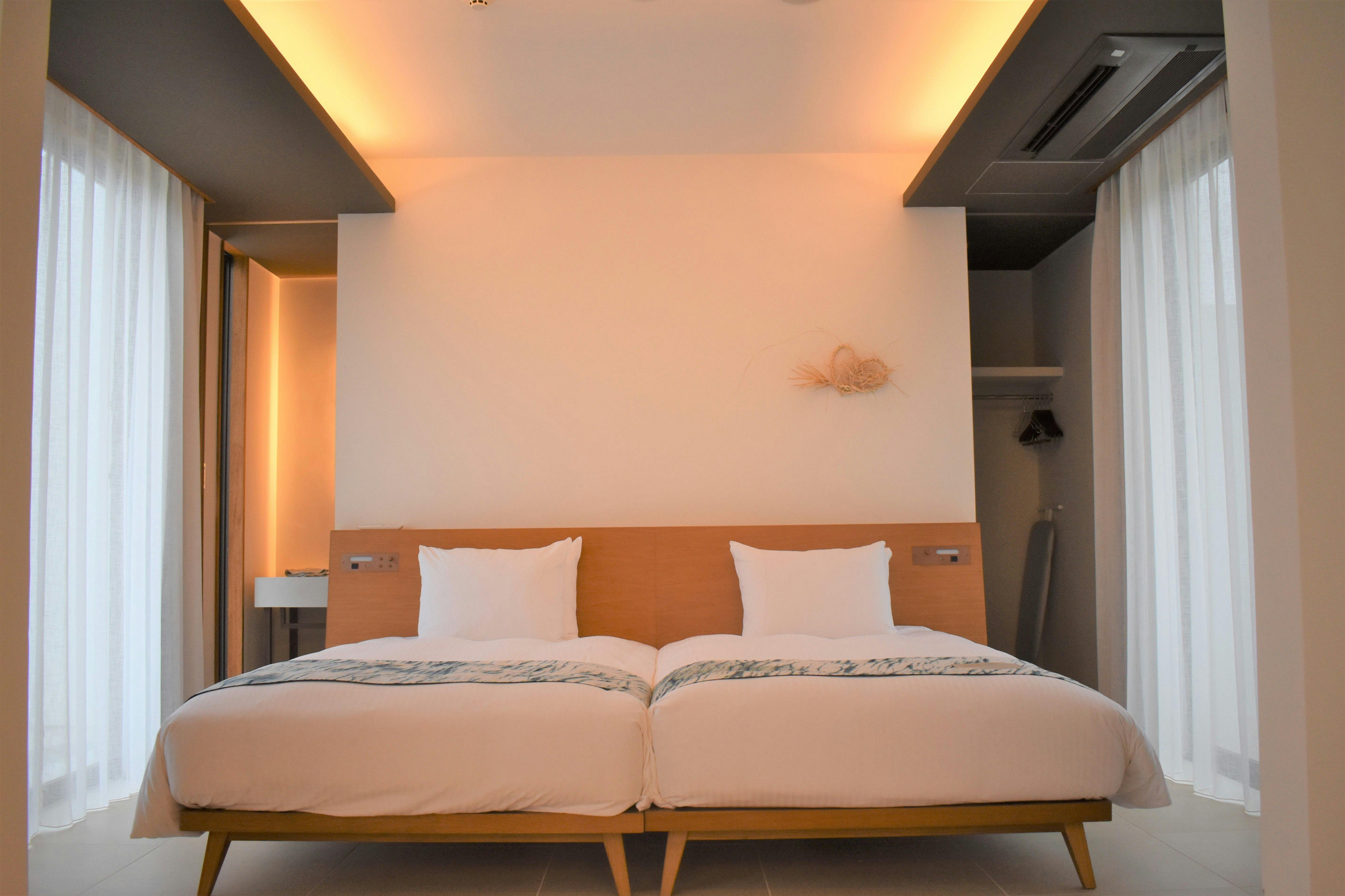 基本の2名様はクイーンベッド2台 (120 cm x 2台) のツインをご用意。