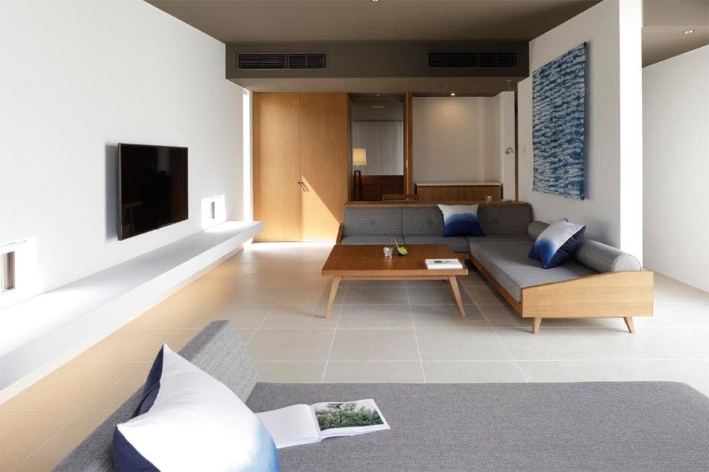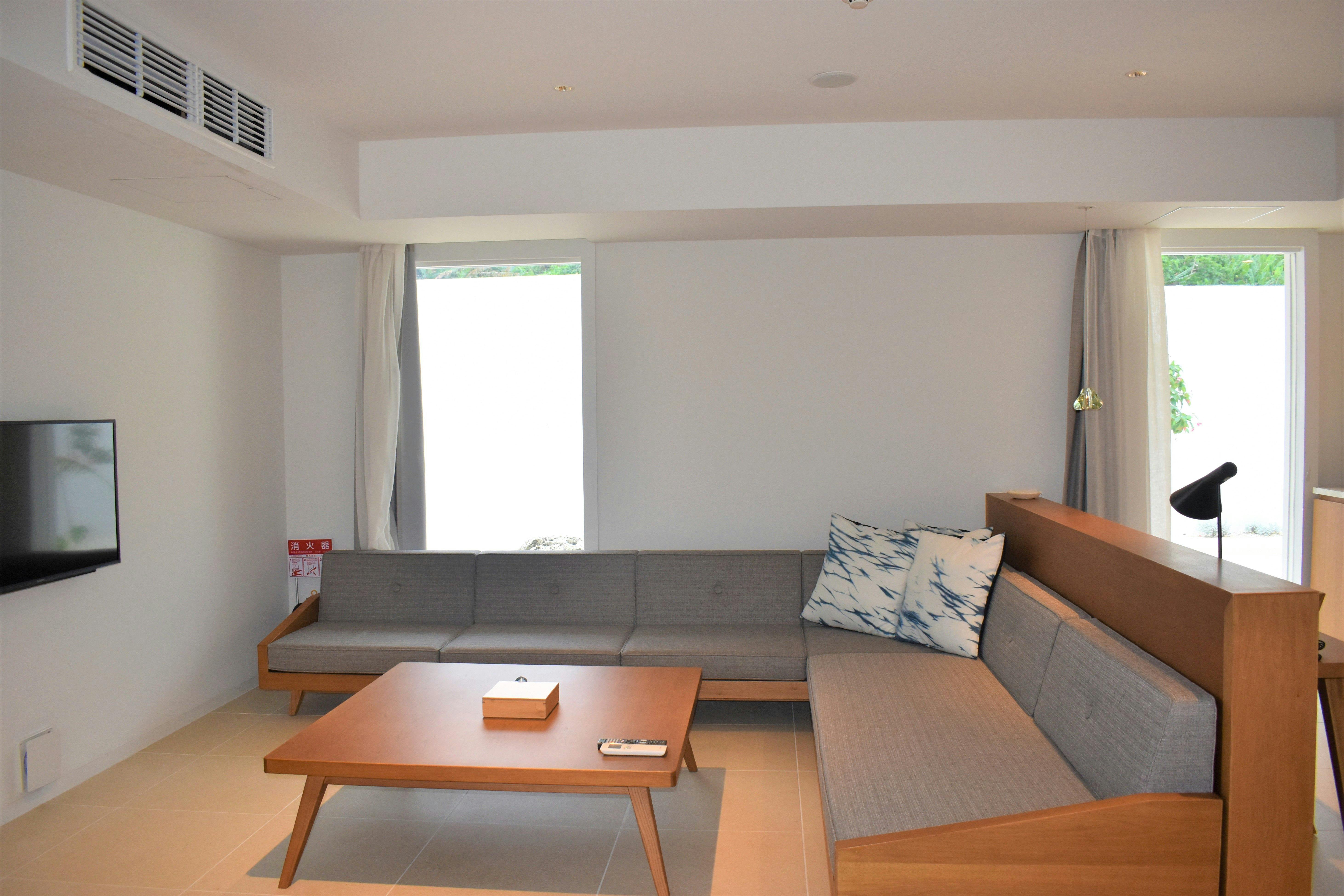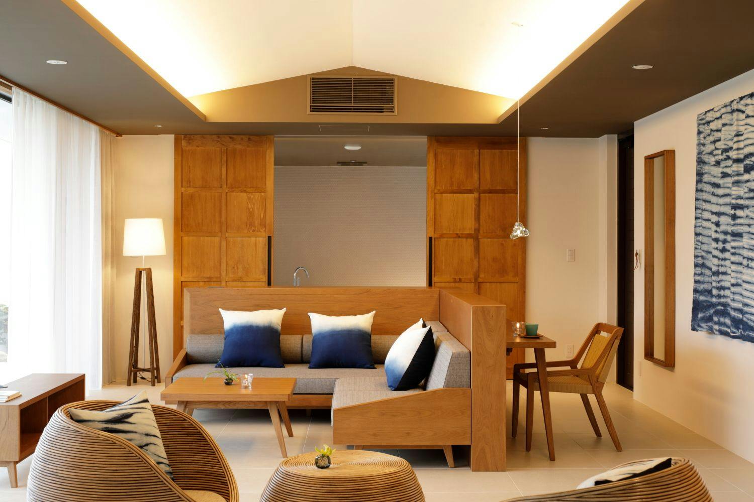 ゆったりと落ち着くリビングスペースが解放感を感じさせる「プレミアスイートヴィラ」。