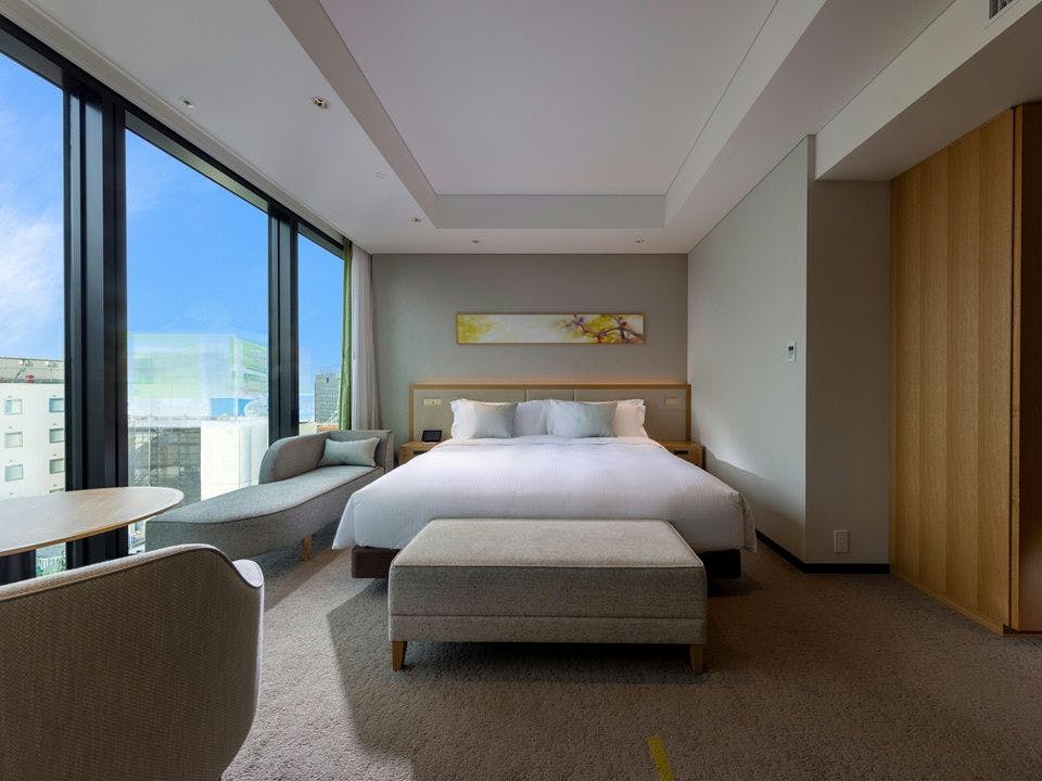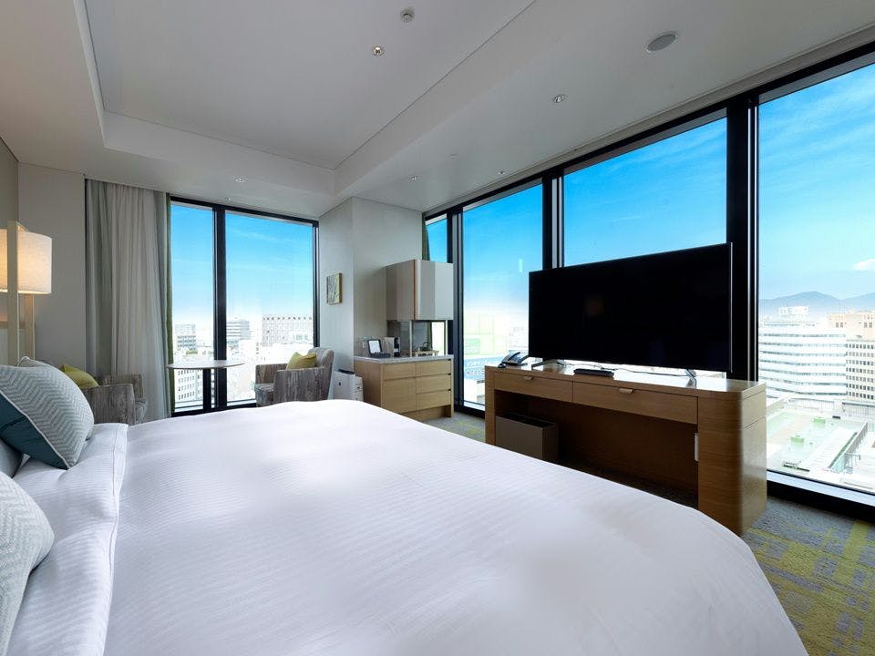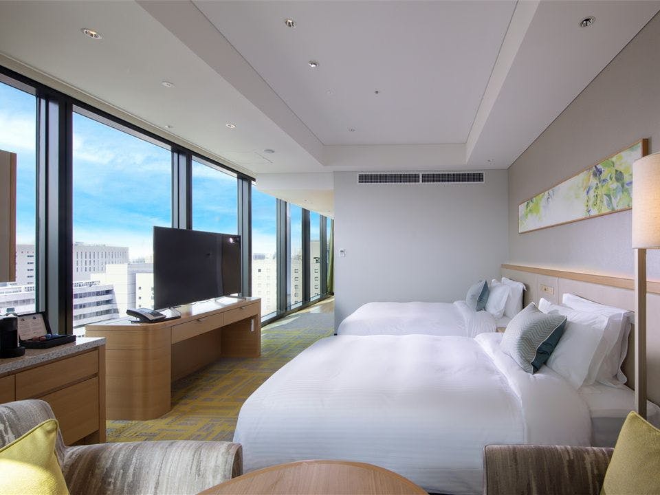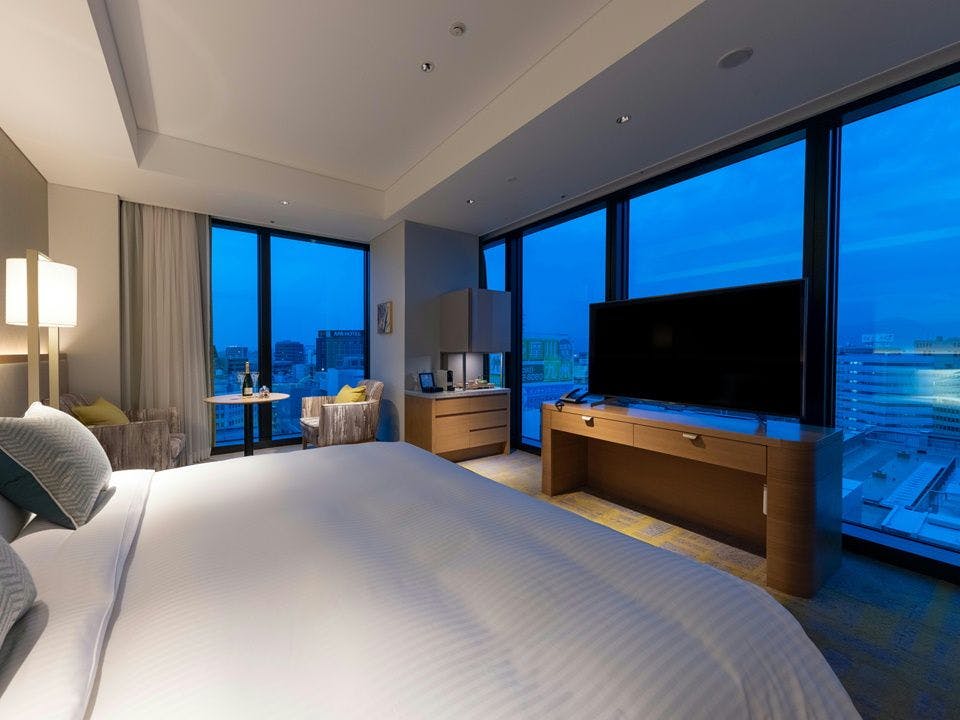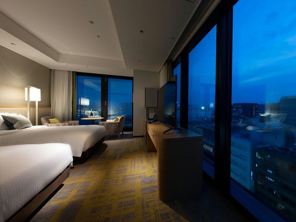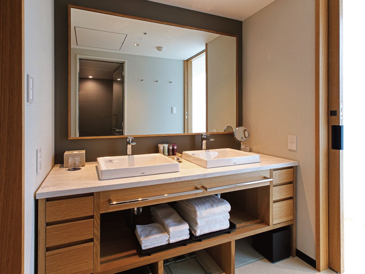 各フロアのコーナーに位置し、角部屋ならではの二面の大きな窓面を設けたラグジュアリータイプの客室です。ゆとりあるクローゼットやダブルベイシンの洗面カウンターなど、快適で心地よいワンランク上の滞在をお楽しみいただけます。ゆったりとしたバスタブに洗い場を設けた広々としたバスルーム、取り出しやすく配置されたミニバー、Wi-Fiインターネット接続などの設備を揃え、心地よい快適な滞在をお約束します。