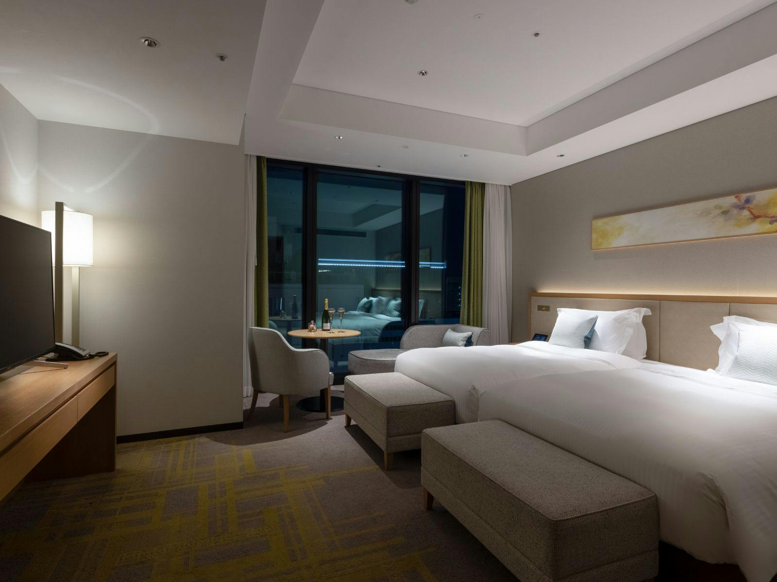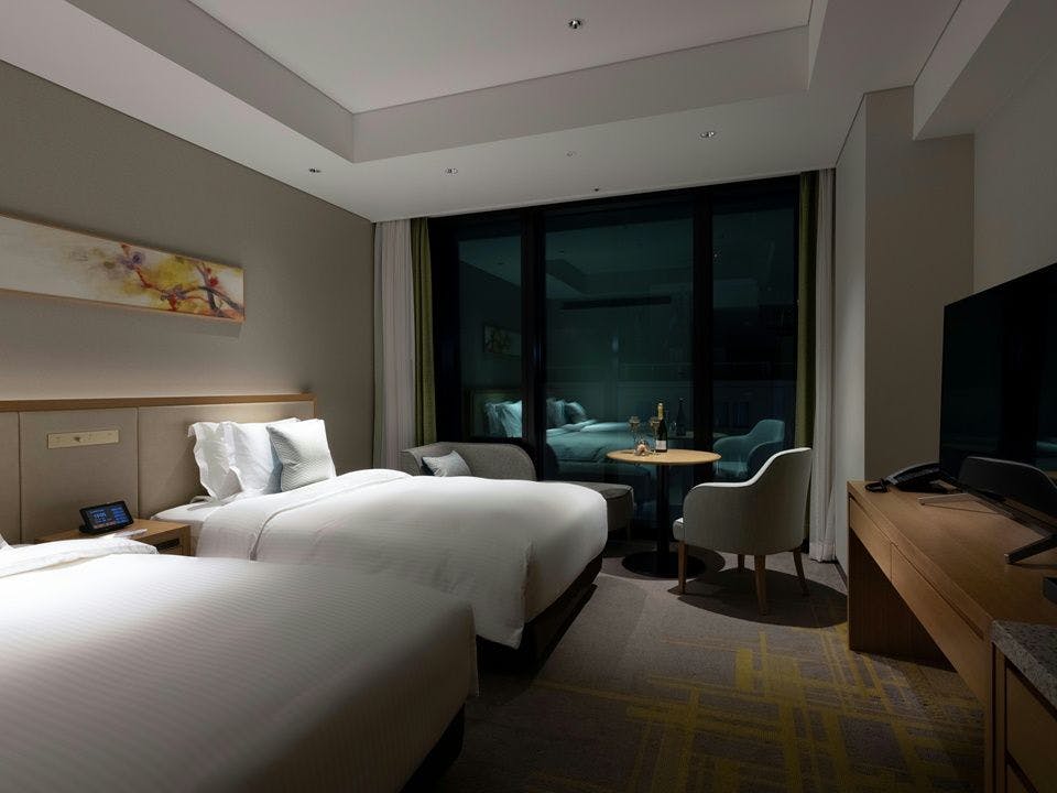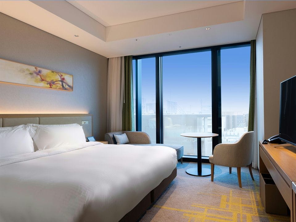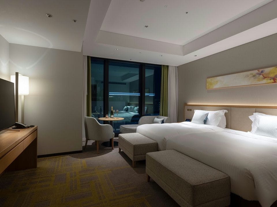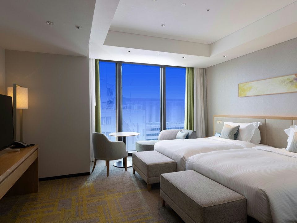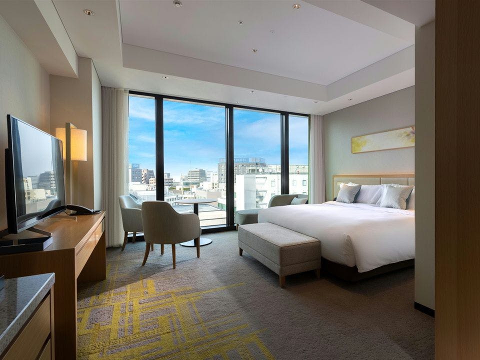 各フロアのコーナーに位置し、角部屋ならではの二面の大きな窓面を設けたラグジュアリータイプの客室です。ゆとりあるクローゼットやダブルベイシンの洗面カウンターなど、快適で心地よいワンランク上の滞在をお楽しみいただけます。ゆったりとしたバスタブに洗い場を設けた広々としたバスルーム、取り出しやすく配置されたミニバー、Wi-Fiインターネット接続などの設備を揃え、心地よい快適な滞在をお約束します。