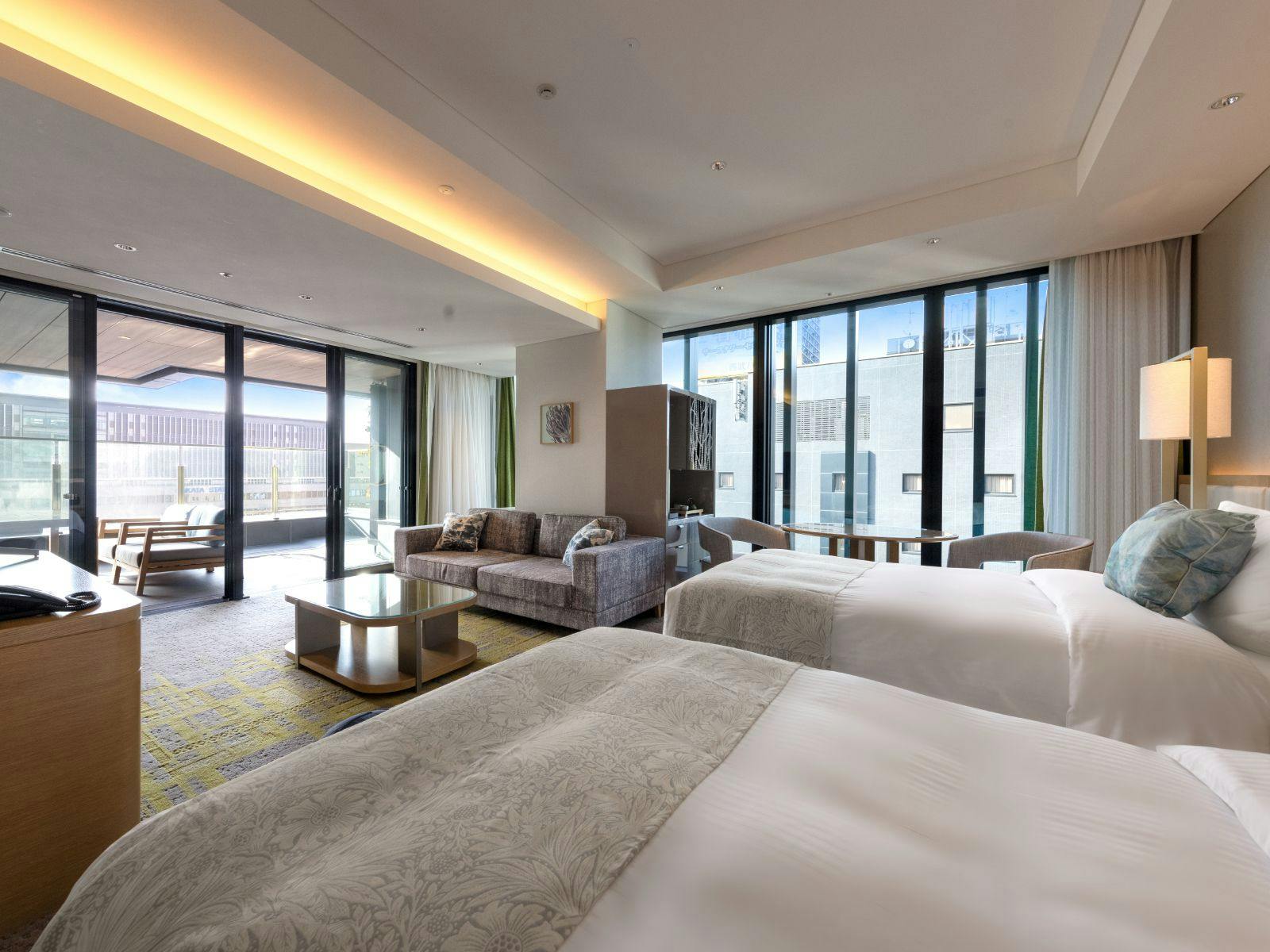 各フロアのコーナーに位置し、角部屋ならではの二面の大きな窓面を設けたラグジュアリータイプの客室です。ゆとりあるクローゼットやダブルベイシンの洗面カウンターなど、快適で心地よいワンランク上の滞在をお楽しみいただけます。ゆったりとしたバスタブに洗い場を設けた広々としたバスルーム、取り出しやすく配置されたミニバー、Wi-Fiインターネット接続などの設備を揃え、心地よい快適な滞在をお約束します。屋上の温泉スパ・プールへは、専用のエレベーターにてリラックスしたまま移動できます。
