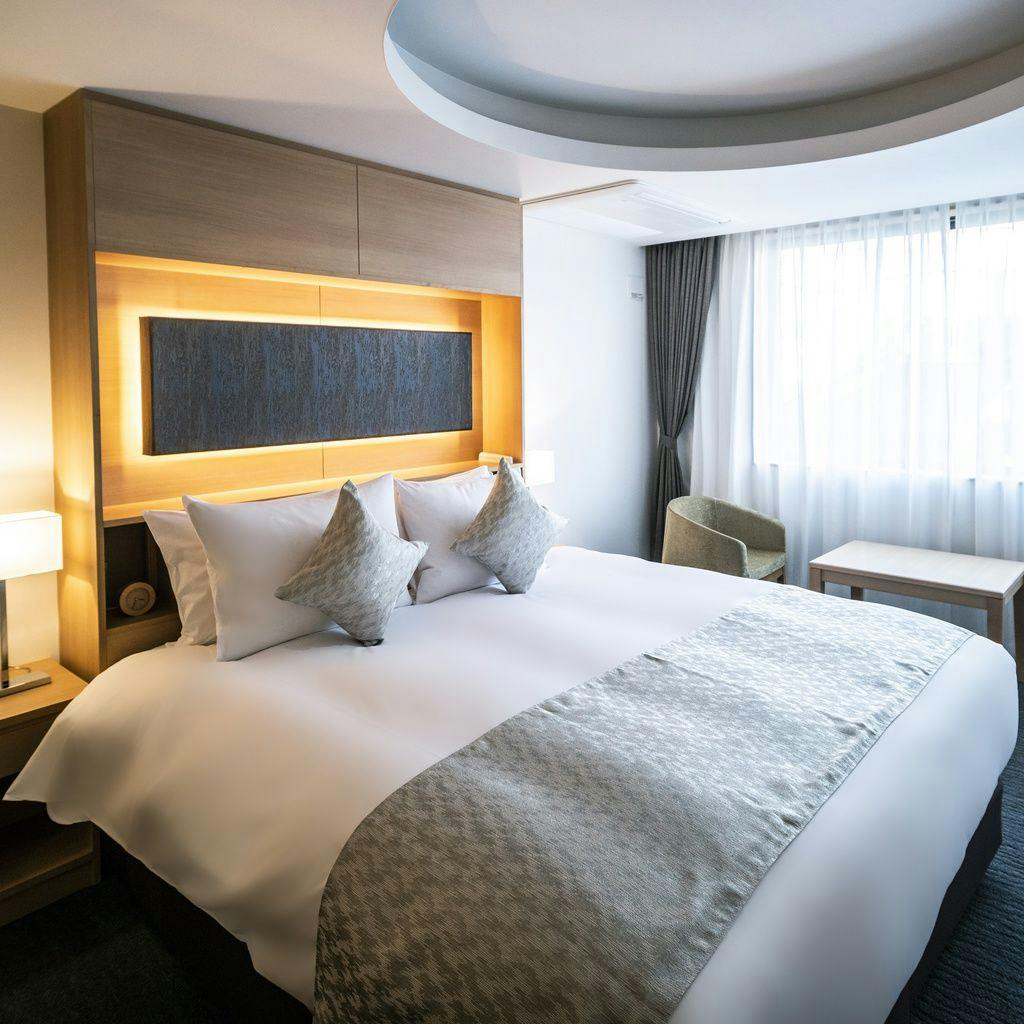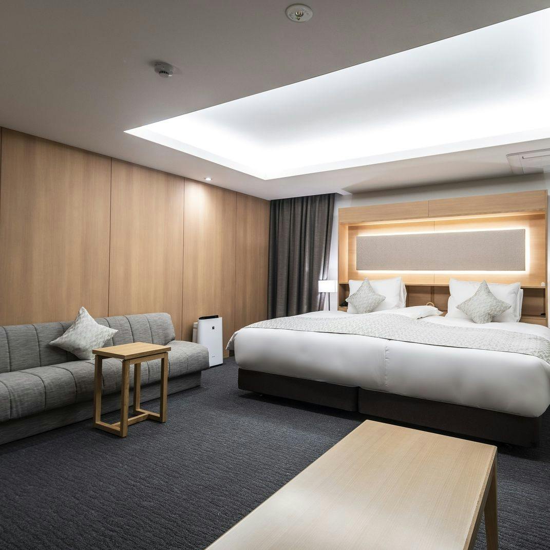 明るく開放的な空間。広々としたベッドとバスルームの客室は快適なホテルライフを満喫いただけます。ソファベッドご利用で最大3名様まで。(窓はすりガラスです)