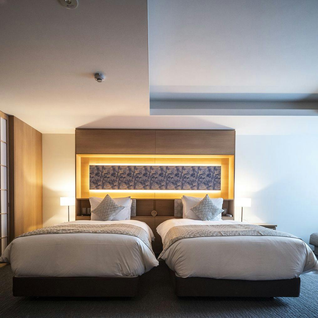 2台のベッドを寄せて並べたハリウッドツインタイプを採用。ゆったりとしたベッドはカップルや小さなお子様連れのご利用に最適です。(窓はすりガラスです)