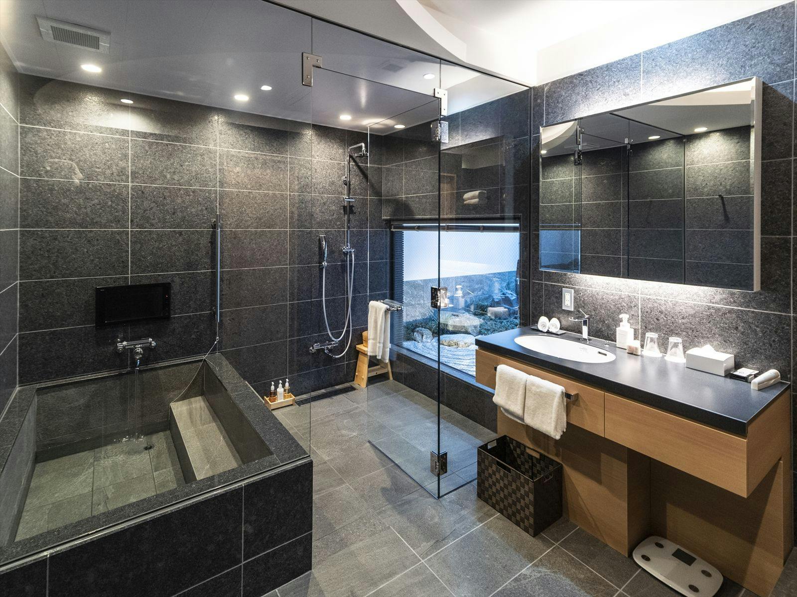 広めの洗面台を設けたメゾネットタイプのお部屋。専用庭をご覧いただきながらご入浴いただけます。(窓はすりガラスです)