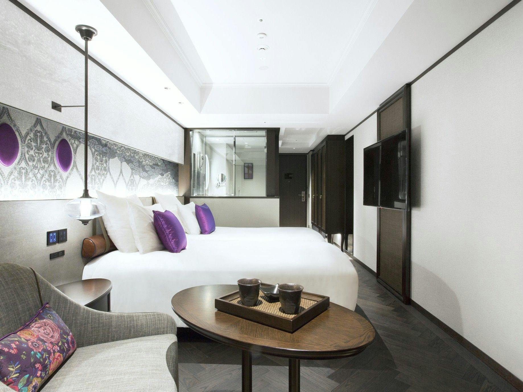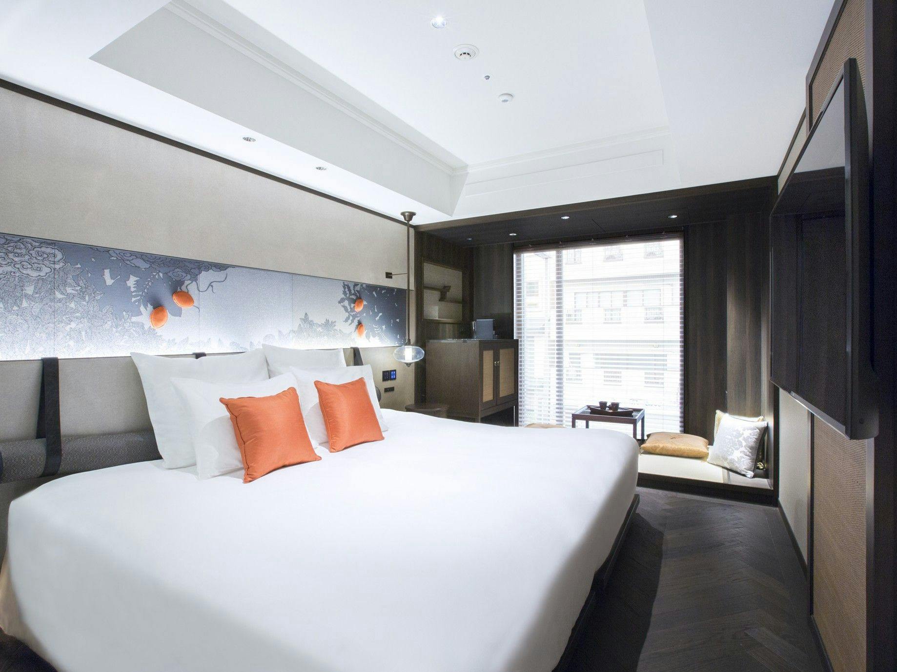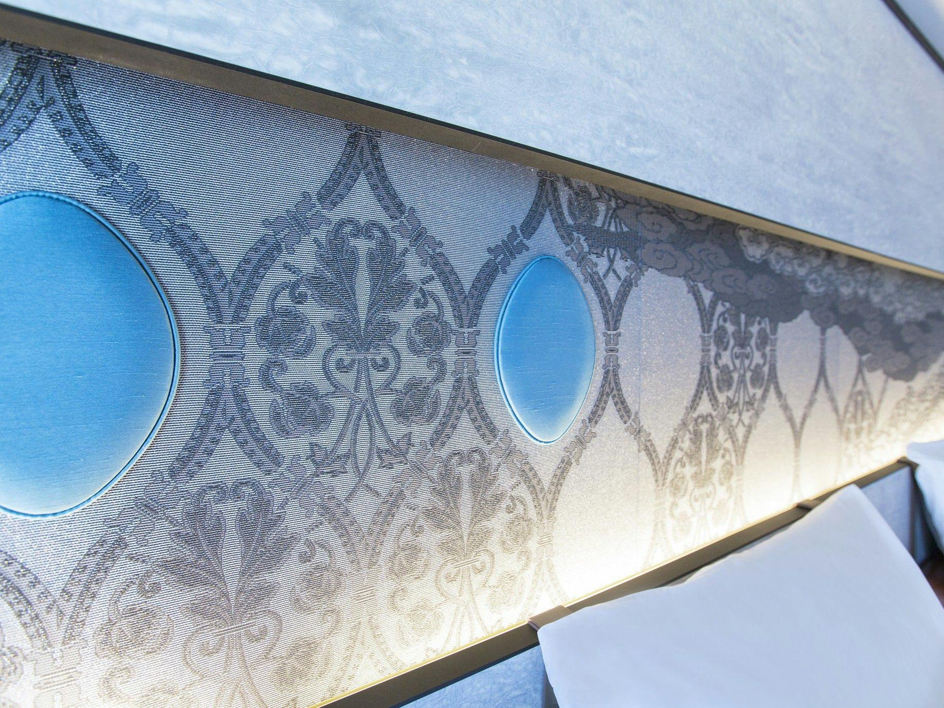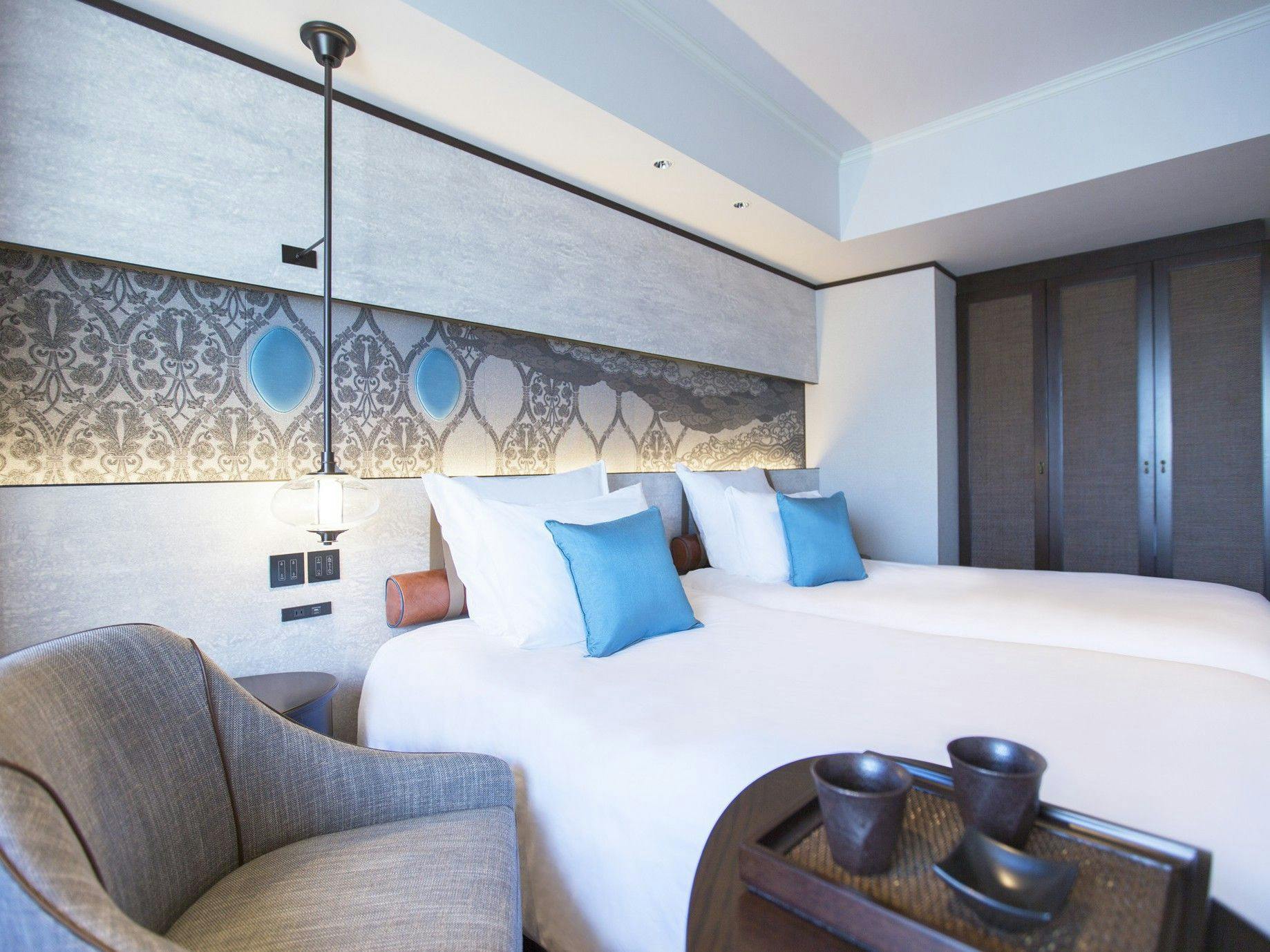 西陣織のヘッドボードや大正ロマン時代を思わせる意匠のペンダントライトなど、レトロとモダン、和と洋を融合させたデザインが特徴。日本の美意識をお感じいただける空間でゆっくりとお寛ぎください。