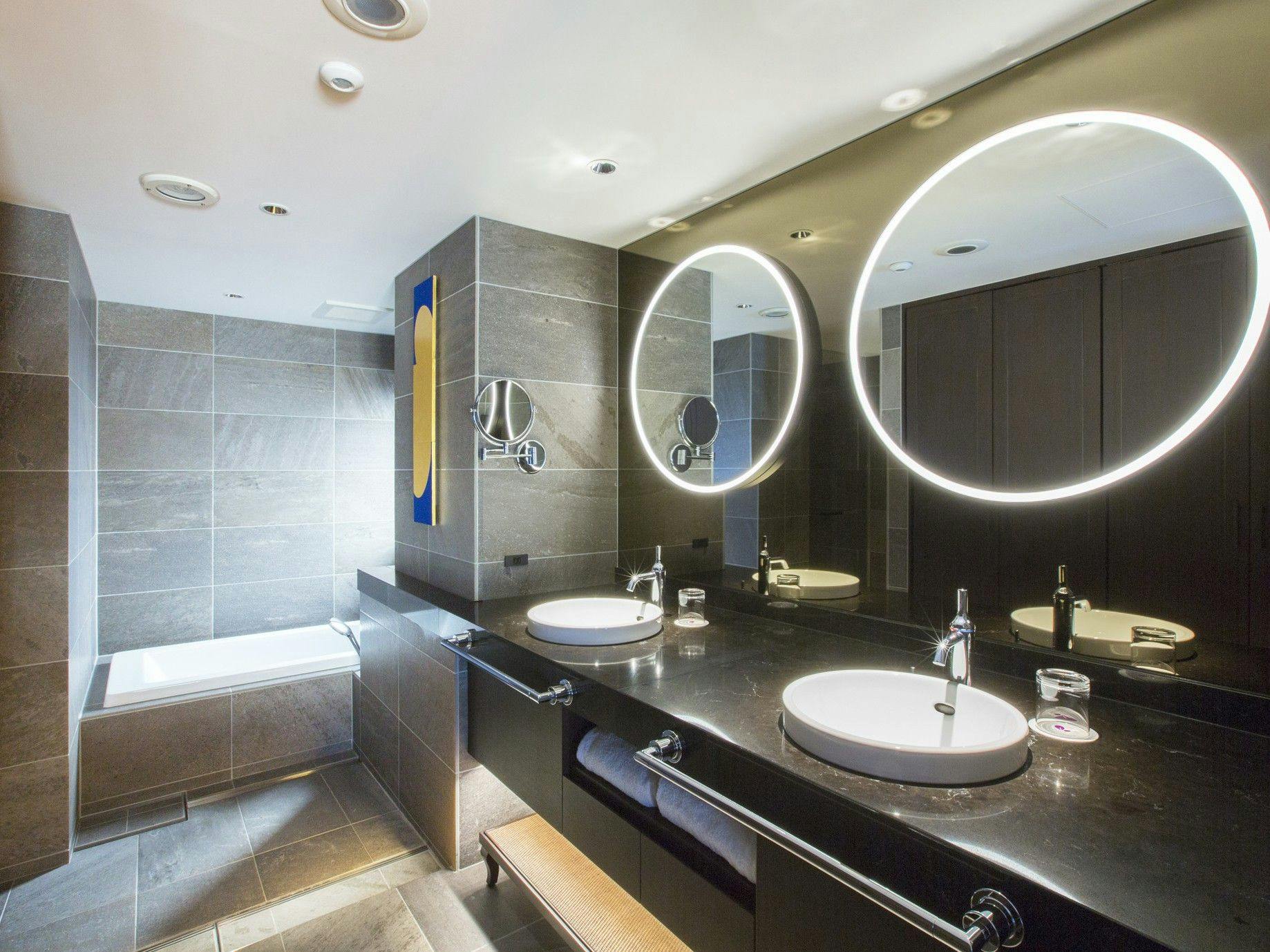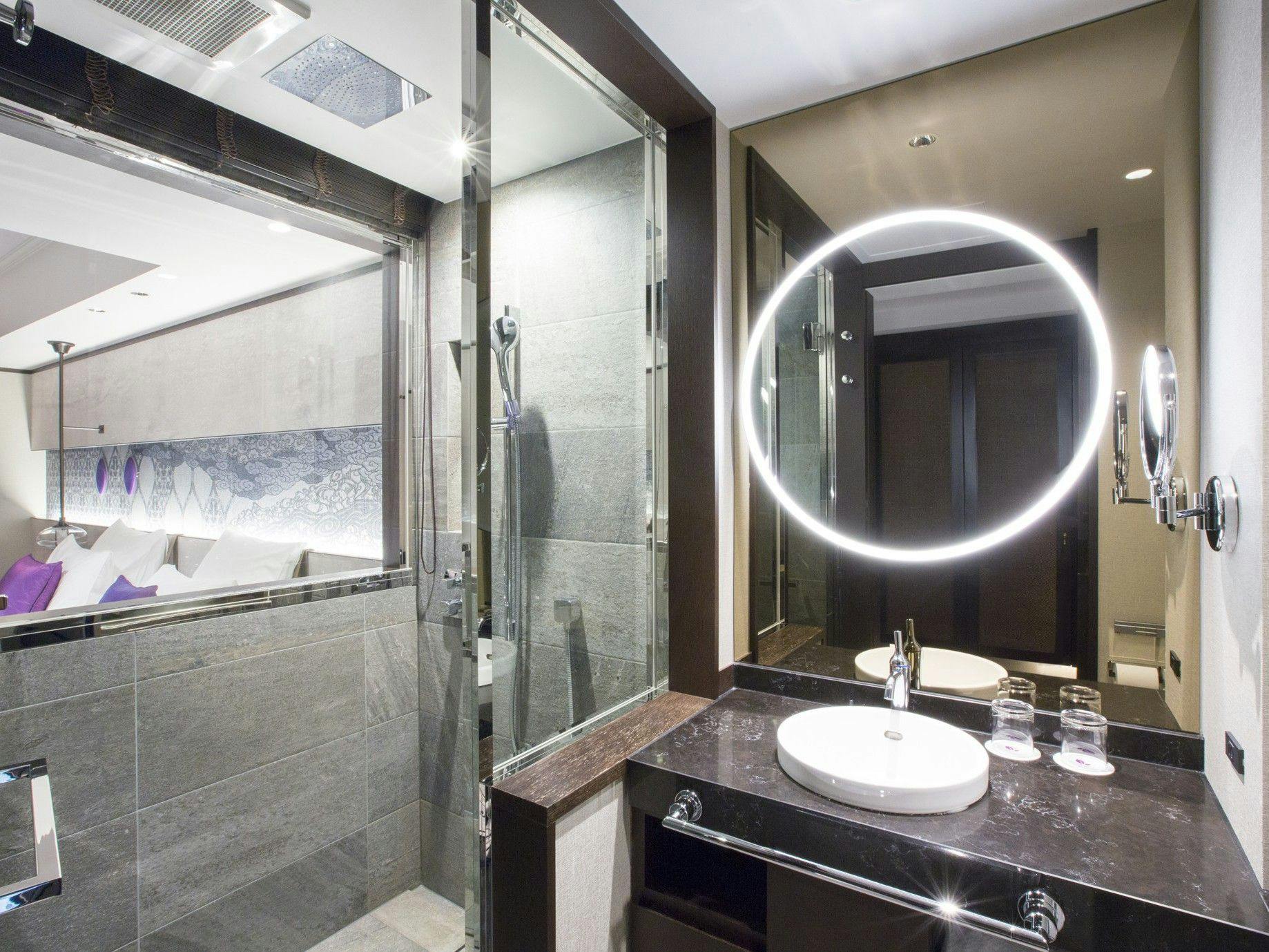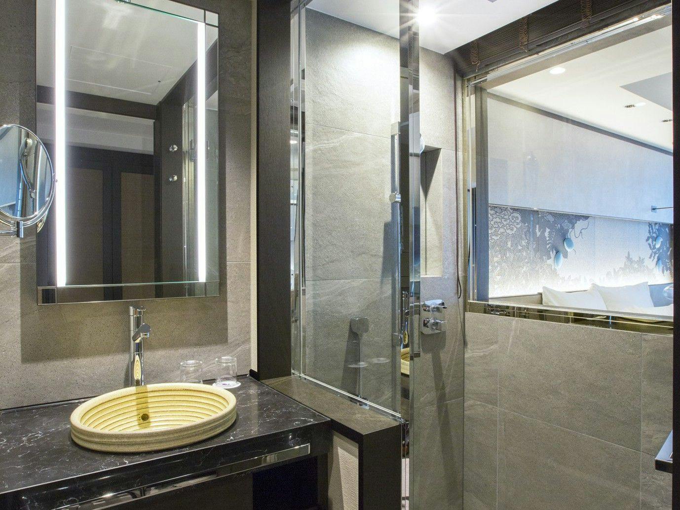 ●総石貼りのバスエリア(バスタブ、レインシャワー付きシャワーブース)