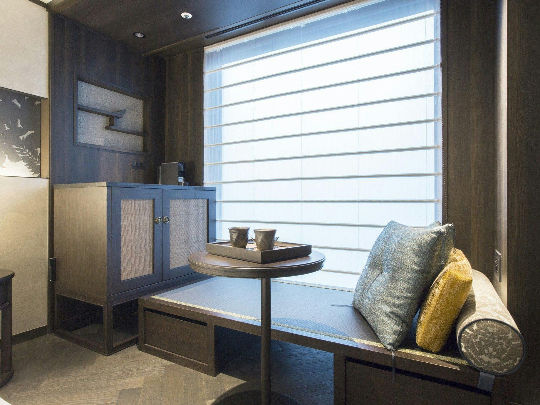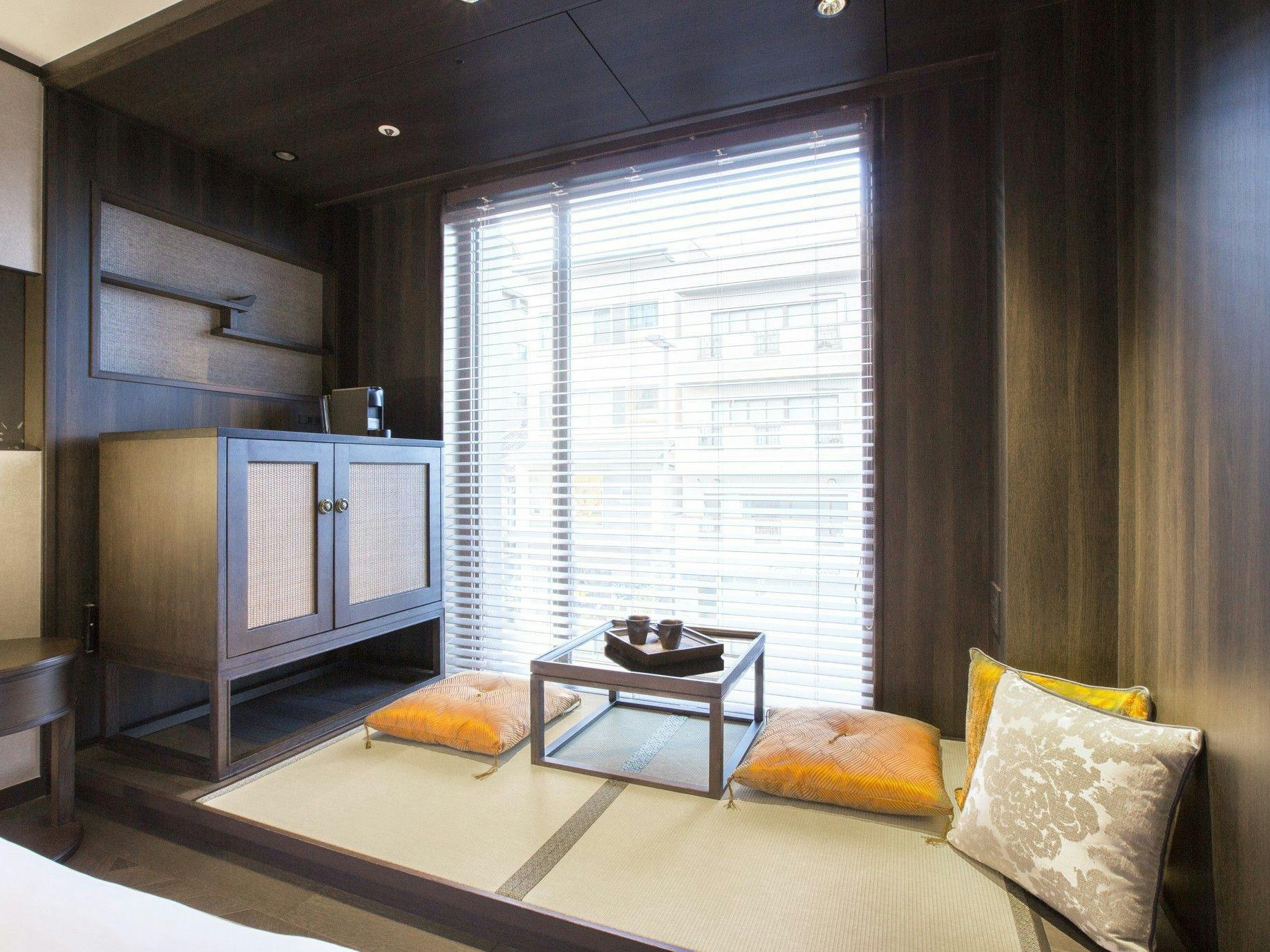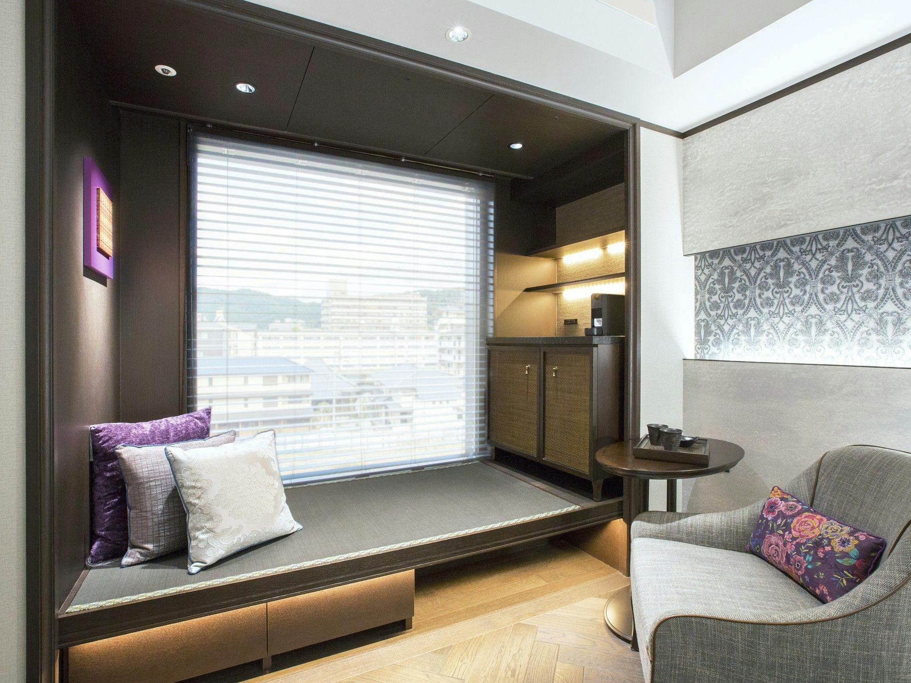 コーナールームです。大正ロマンを感じさせ、窓際にはゆっくりとお過ごしいた西陣織のヘッドボードや大正ロマン時代を思わせる意匠のペンダントライトなど、レトロとモダン、和と洋を融合させたデザイン。窓辺には畳の小上がりを配し、機能美を兼ね備えたお部屋です。