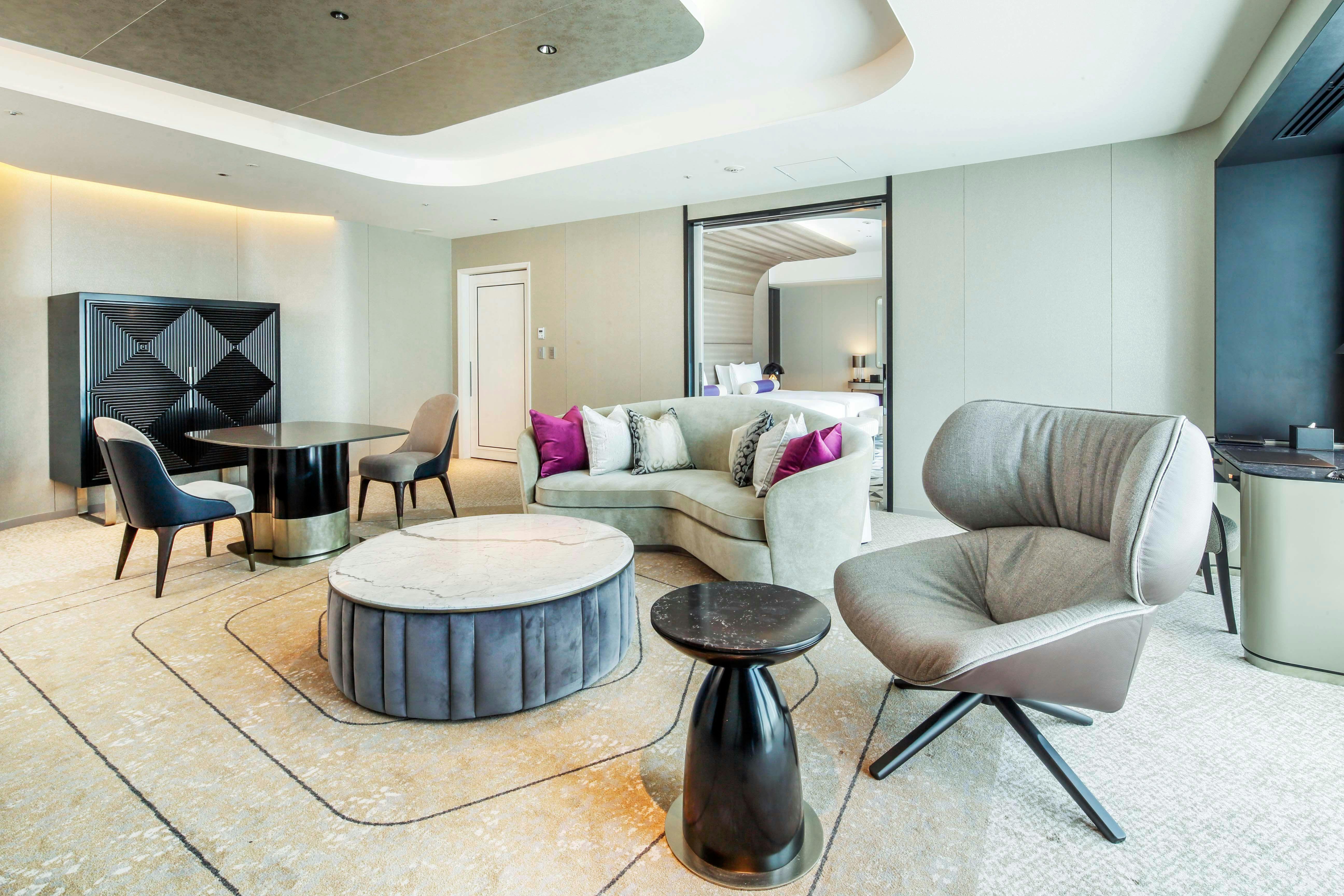 75平米を超えるプレミアムスイートは、ゆったりとしたソファとアームチェアを備えたラグジュアリーなリビングとビューバスが特徴。