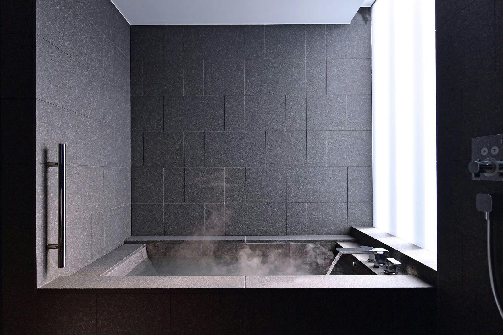 MOGANAの最上階にある、シックな日本瓦の色で統一されたとても人気のお部屋です。黒御影石を用いた深く広々としたバスタブ、湯に浸かりながら坪庭を眺めることができる設計となっております。