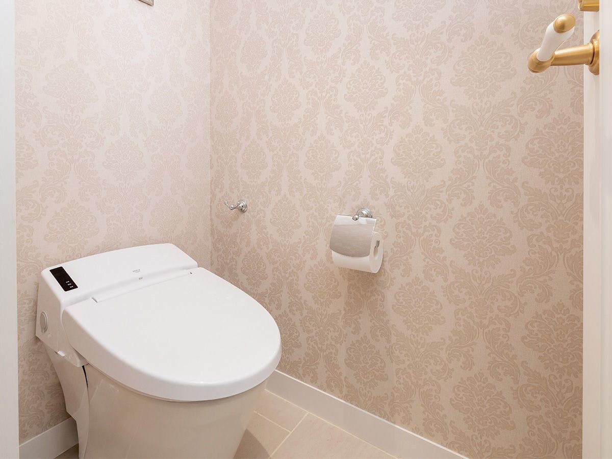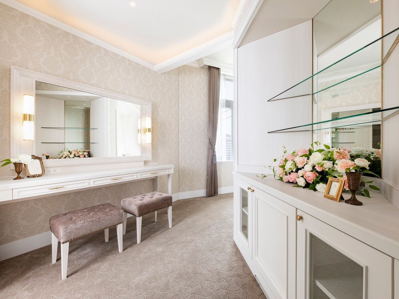 鏡台は外周に照明が付いた“女優ミラー”があり、ベッドの上にはシャンデリアが輝きます。
