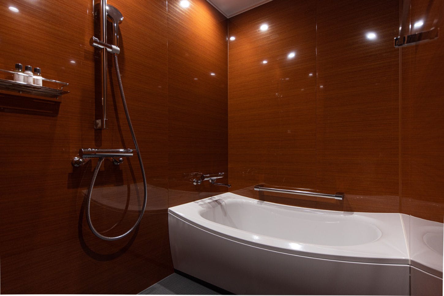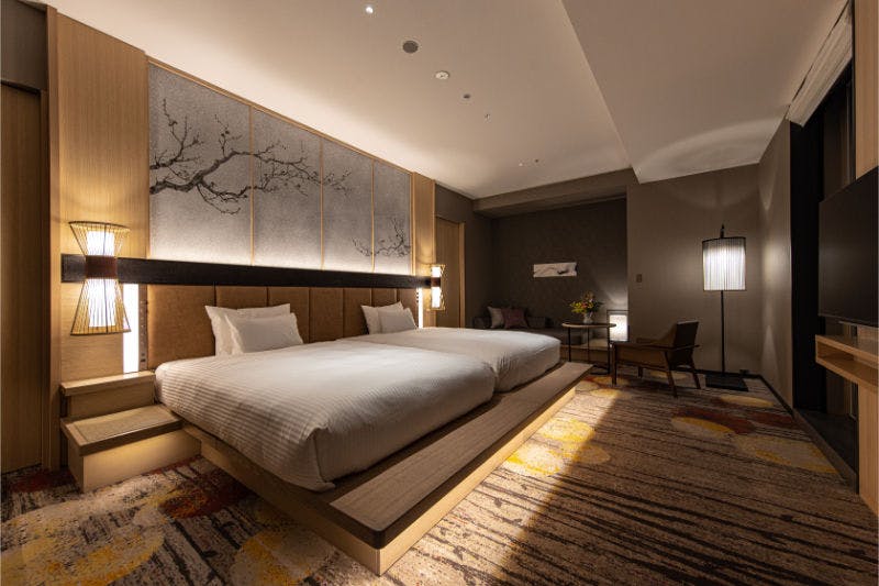 ベッド2台と和風の小上がりが付いたお部屋でございます。小上がりには畳や掛軸、そして柔らかな灯りが日本的でほっこりとしたくつろぎの空間を演出。外国のお客さまにもおすすめです。
