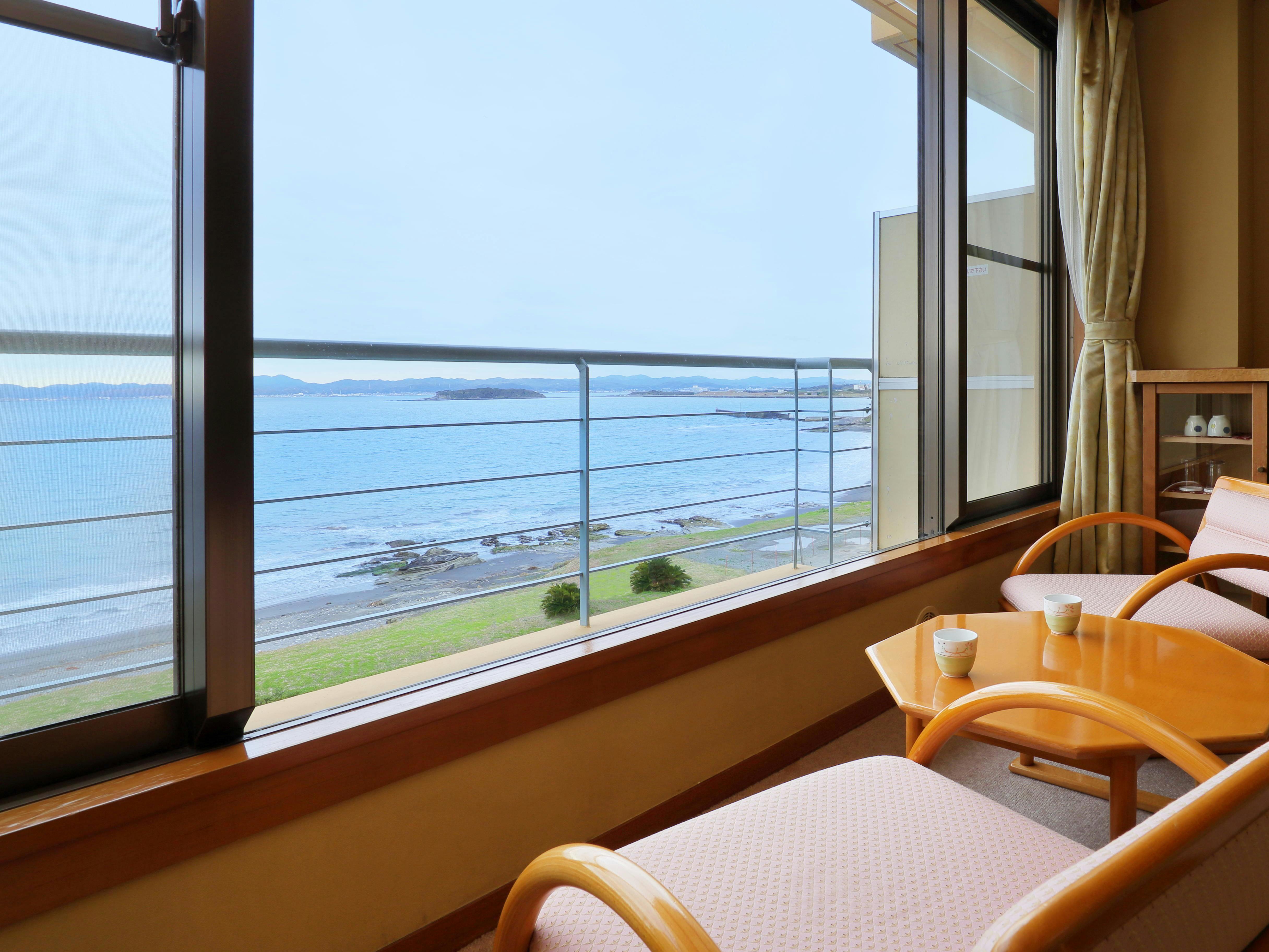 客室からの眺めは内房の穏やかな海を切り取ったかのよう。料理は地元、伊戸漁港で水揚げされた鮮度の高い朝獲れ地魚を使用した会席料理をお楽しみください。