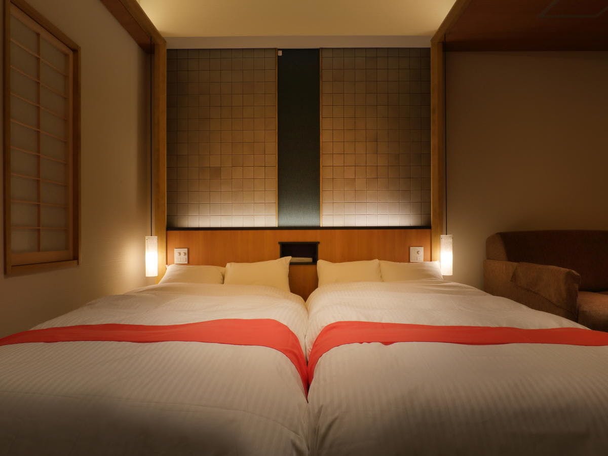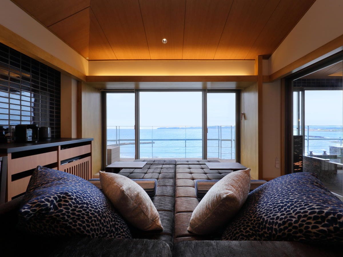 【最上階角の天望露天風呂付き、モダン和室スウィート】広々とした和のリビング(約16畳)に、館山湾一望のデイベッド次の間に寝室ベッドルームツイン完備絶景オーシャンビューを楽しめる展望露天風呂付き(沸かし)モダンな空間と眺望(天望)を活かした特別室です最高の景色と癒しで、ごゆっくりとお過ごしください※冷蔵庫内の飲料は無料です※3名様以上の宿泊は、布団の用意もございます