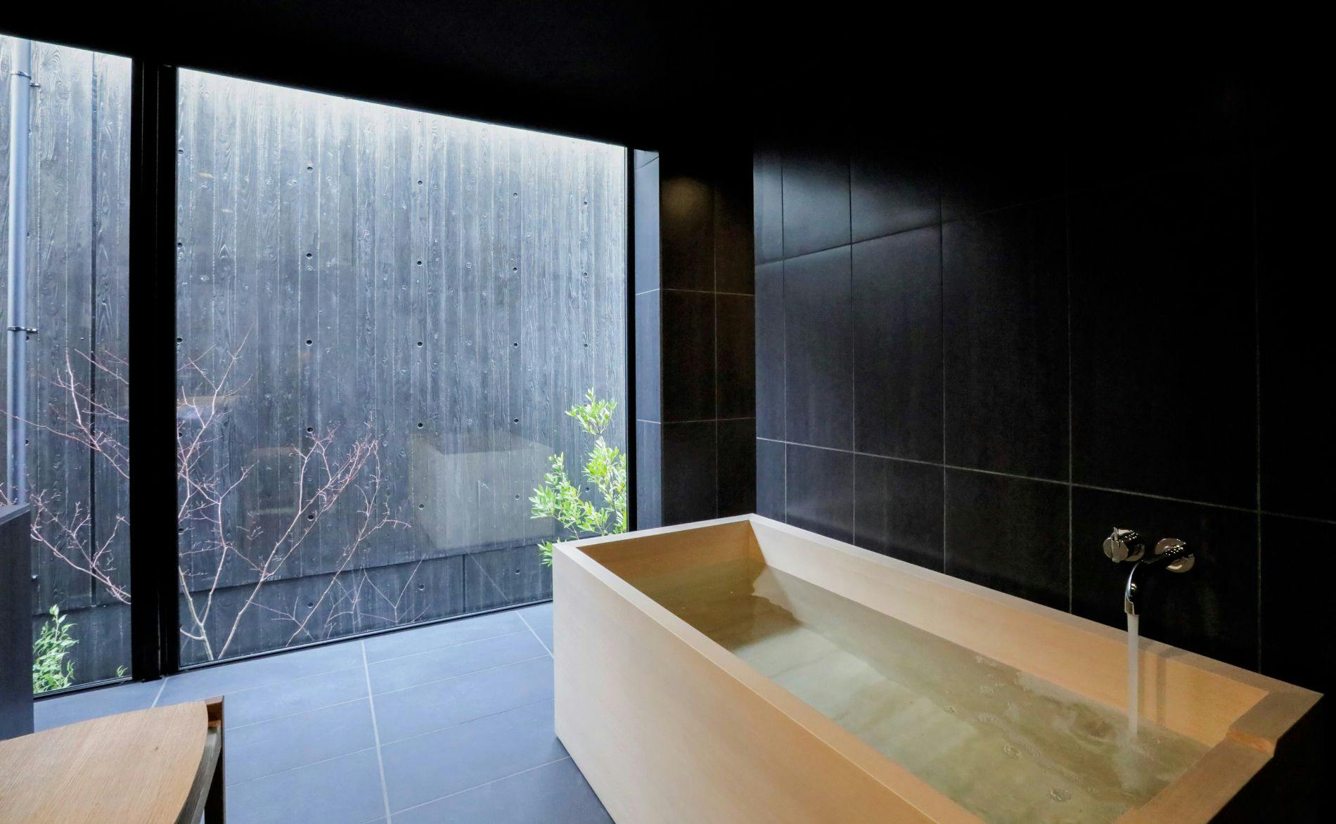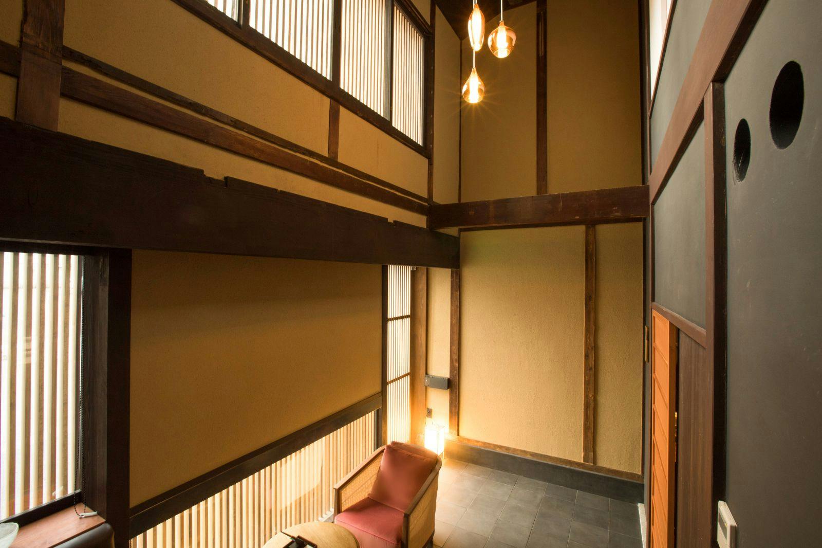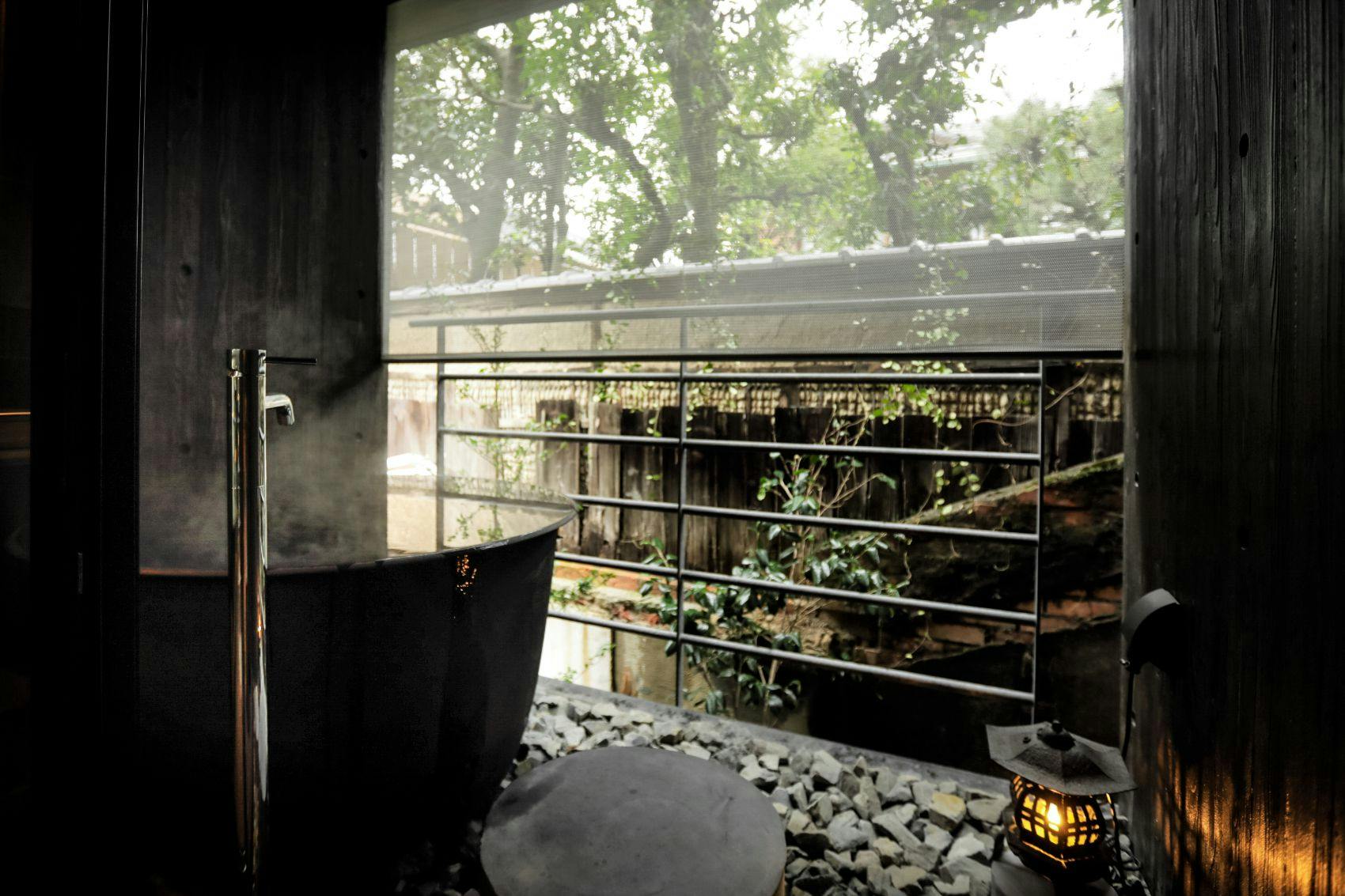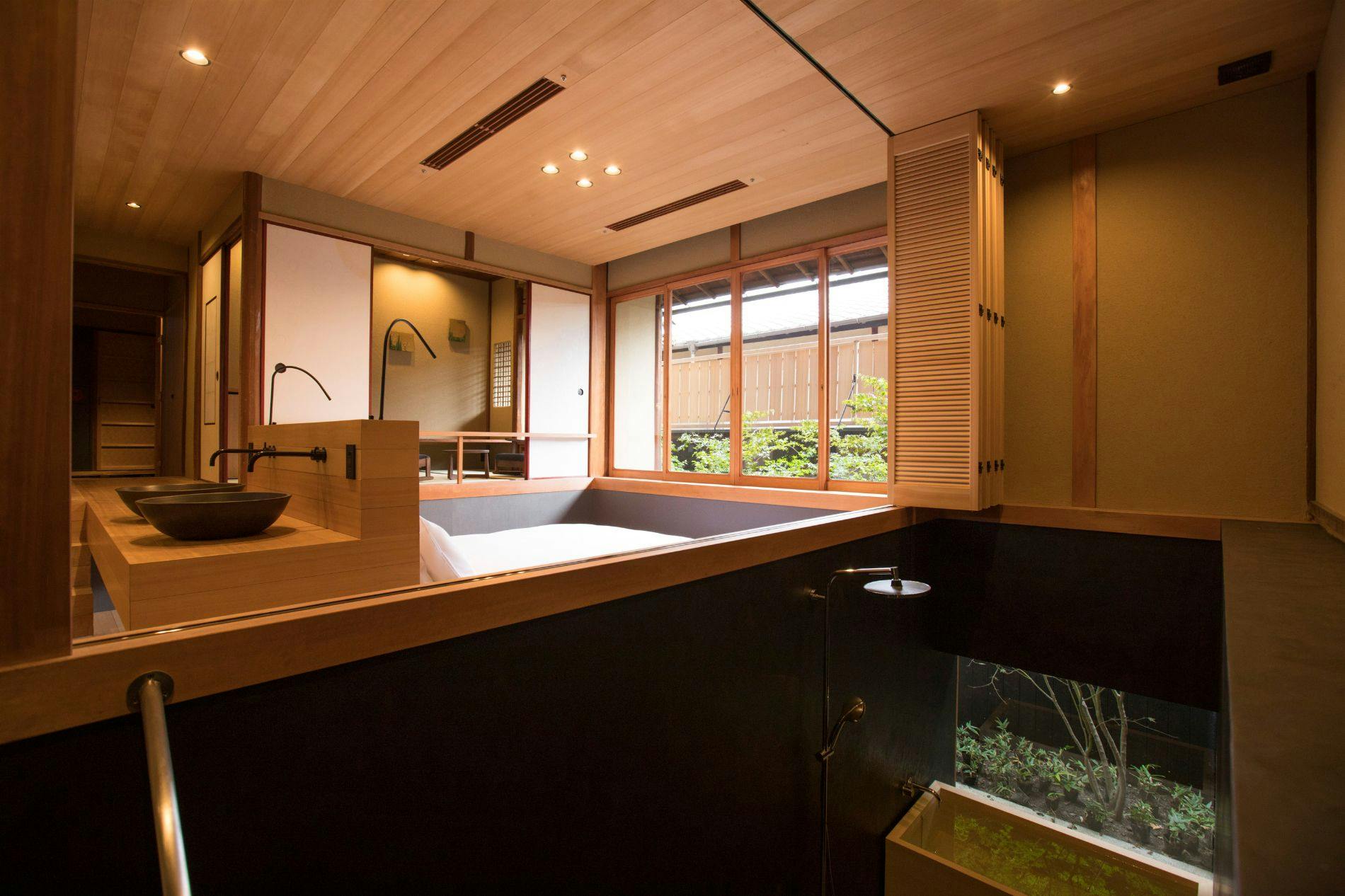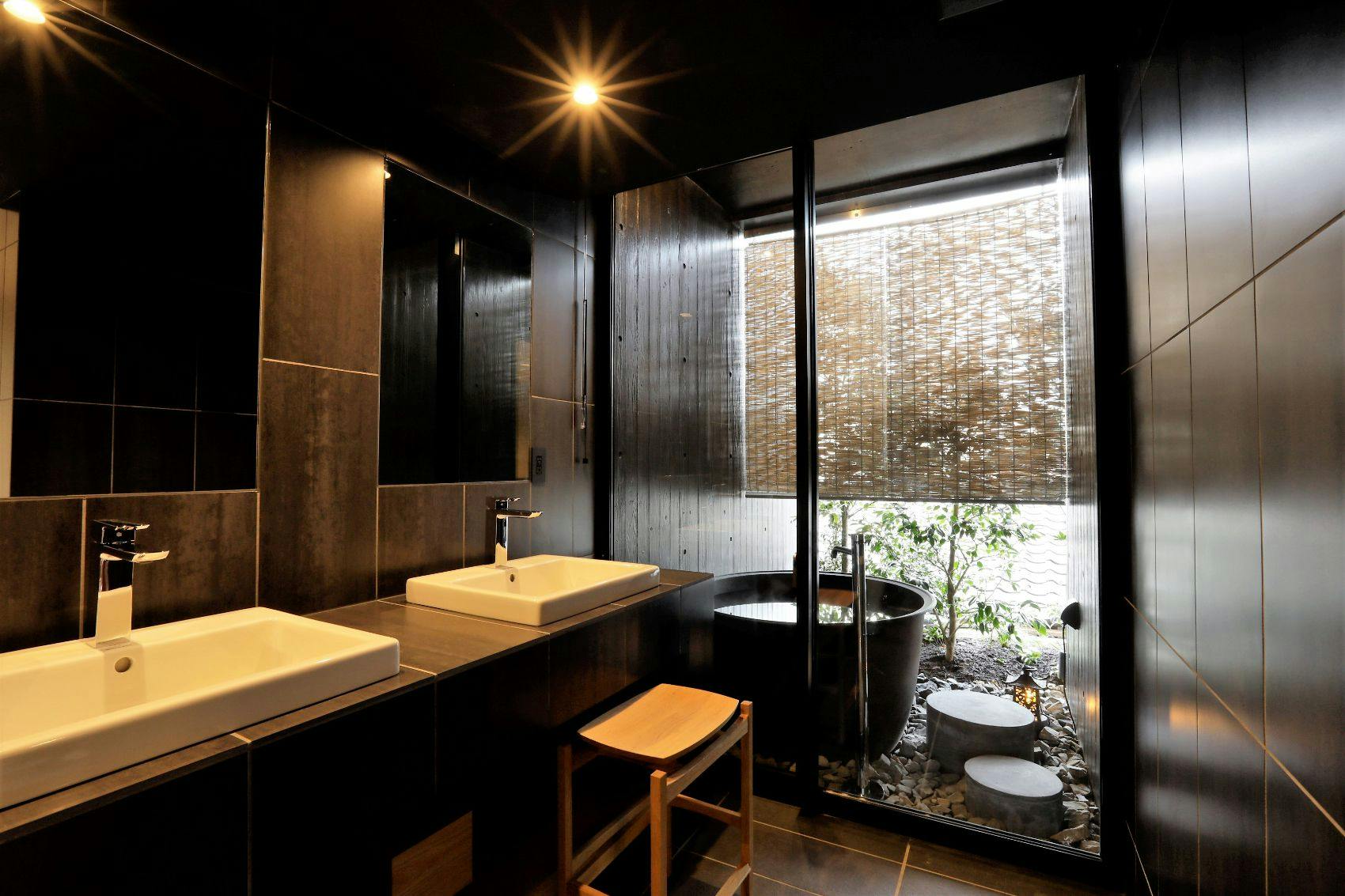 暮らすように滞在できる、町家スタイルの離れ。瓦敷きの土間は吹き抜けになっており、バスルームはシックな黒を基調、庭の緑が爽やかに映えます。二階に上がるとベッドルームとミニバーがあり、喧騒を忘れて心静かに寛ぐことができます。