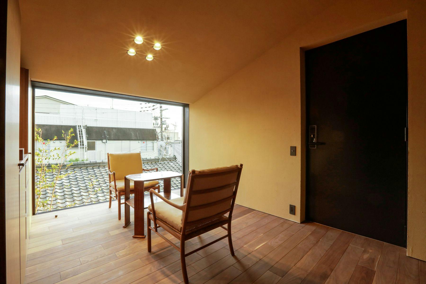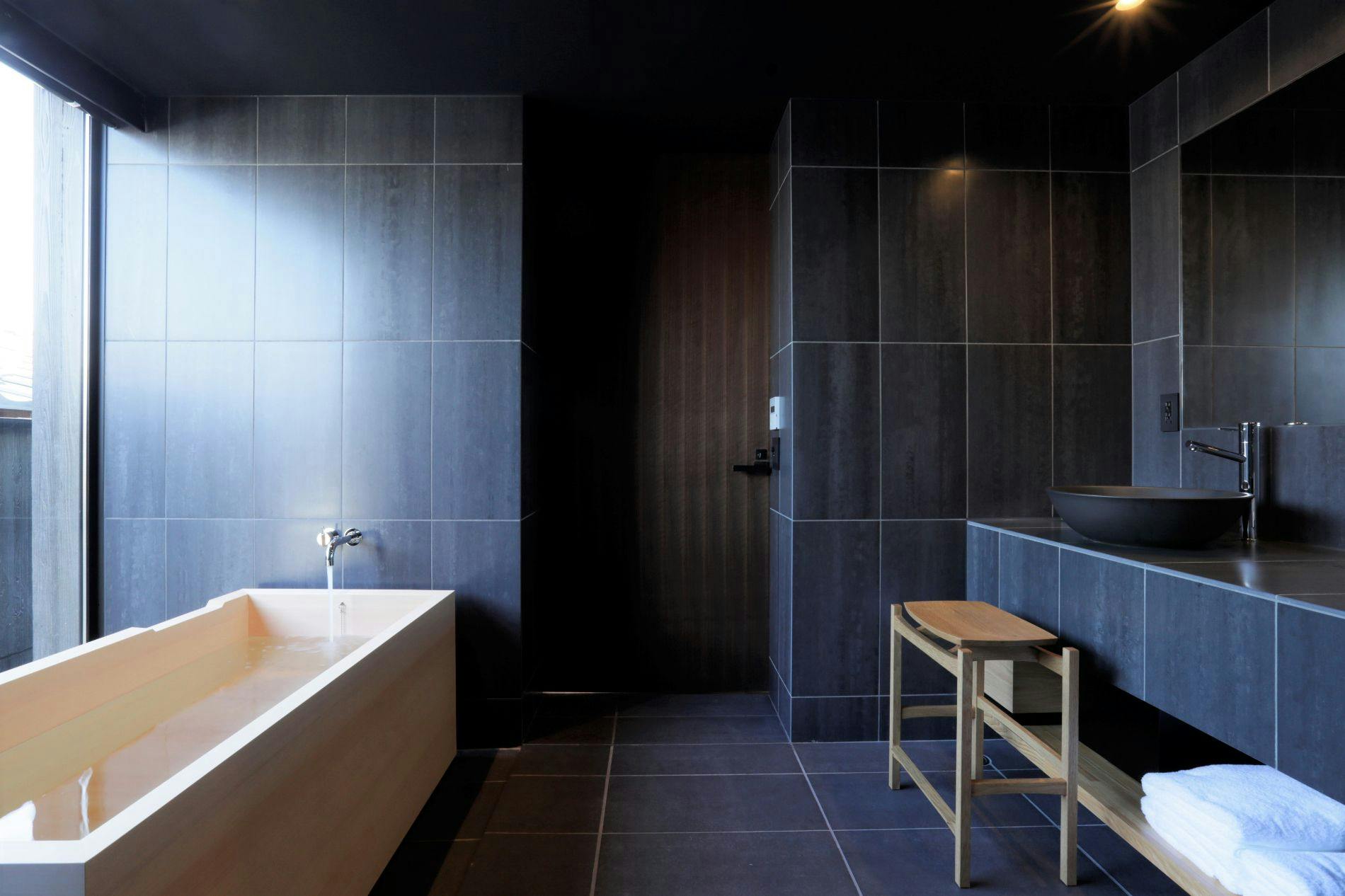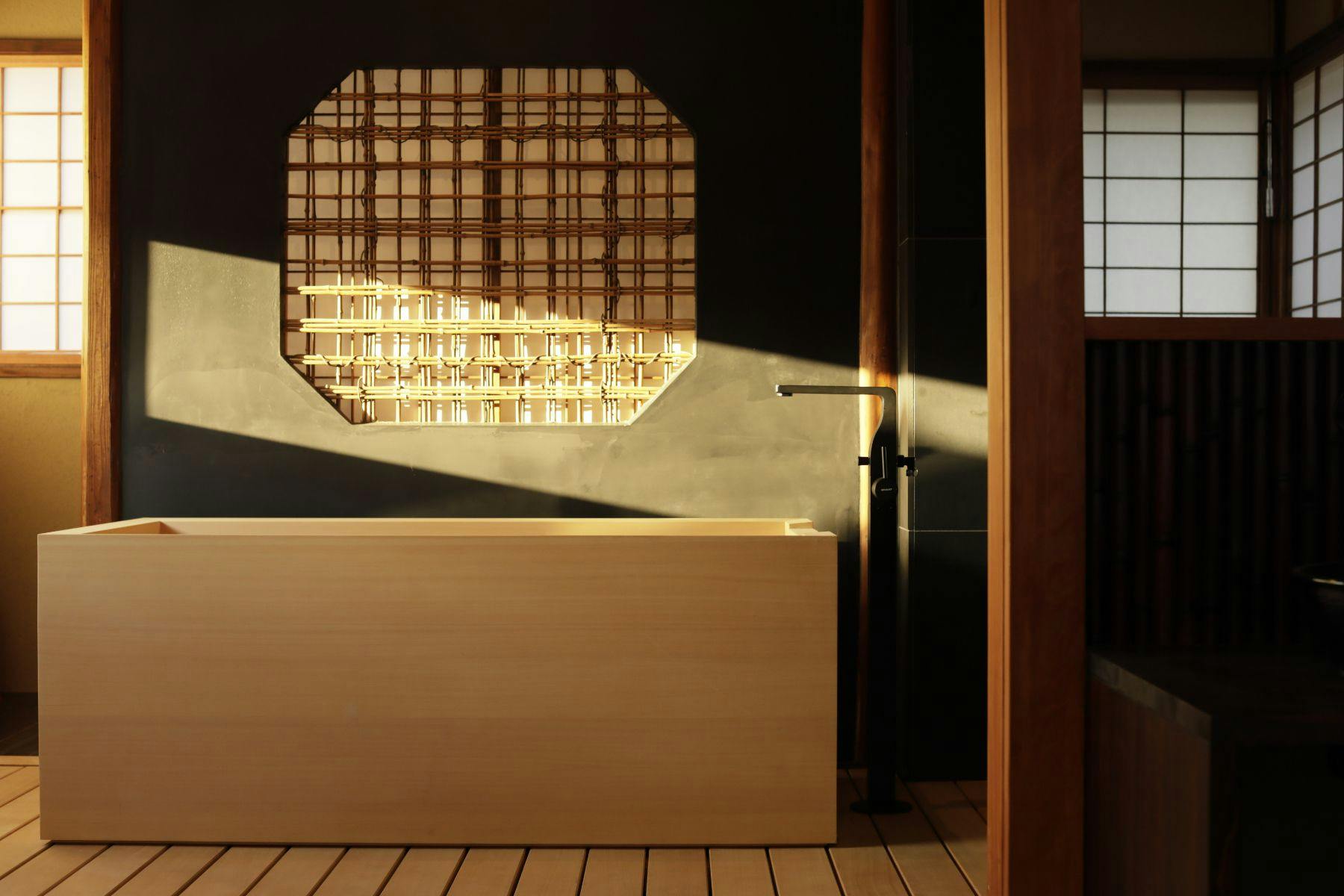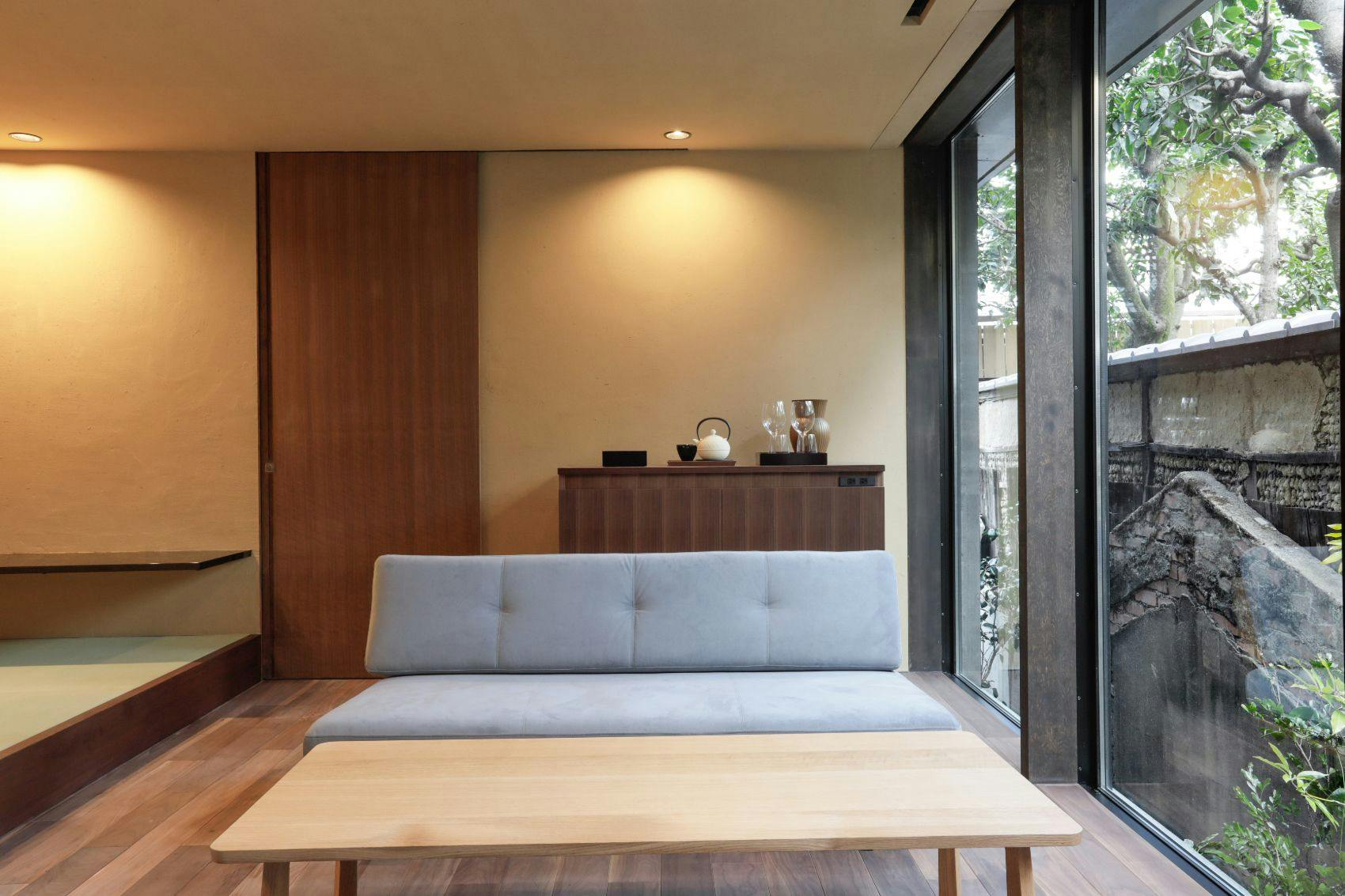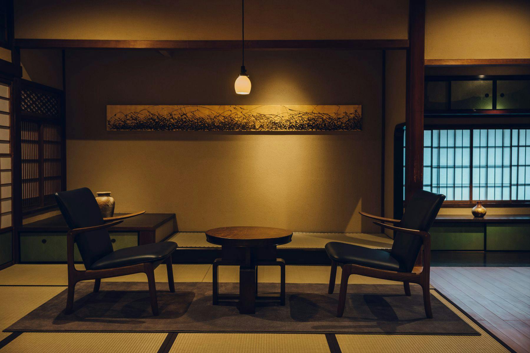 暮らすように滞在できる、町家スタイルの離れ。瓦敷きの土間は吹き抜けになっており、バスルームはシックな黒を基調、庭の緑が爽やかに映えます。二階に上がるとベッドルームとミニバーがあり、喧騒を忘れて心静かに寛ぐことができます。