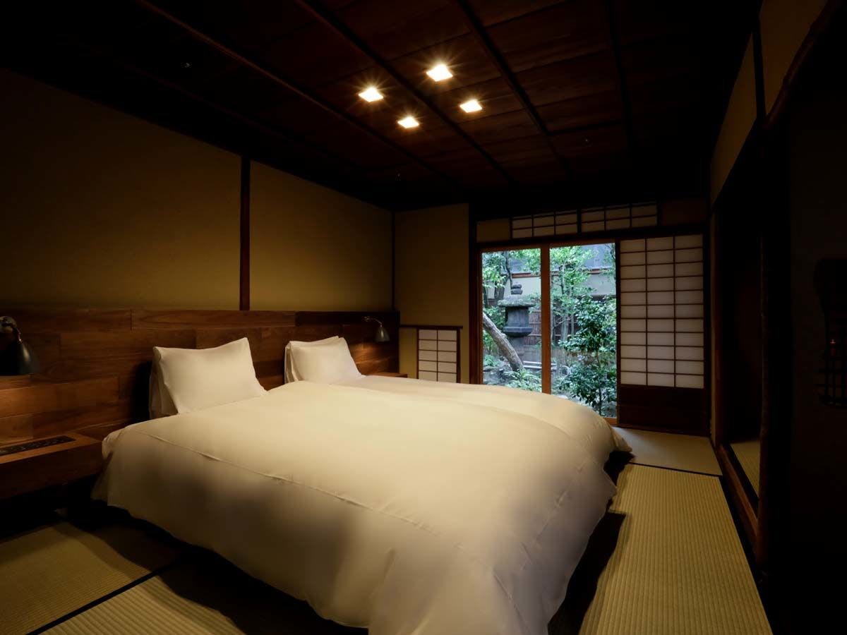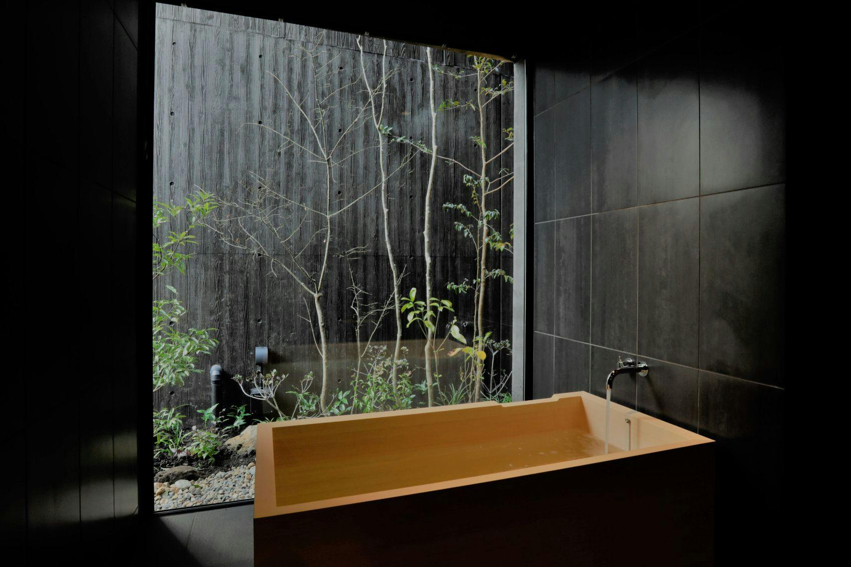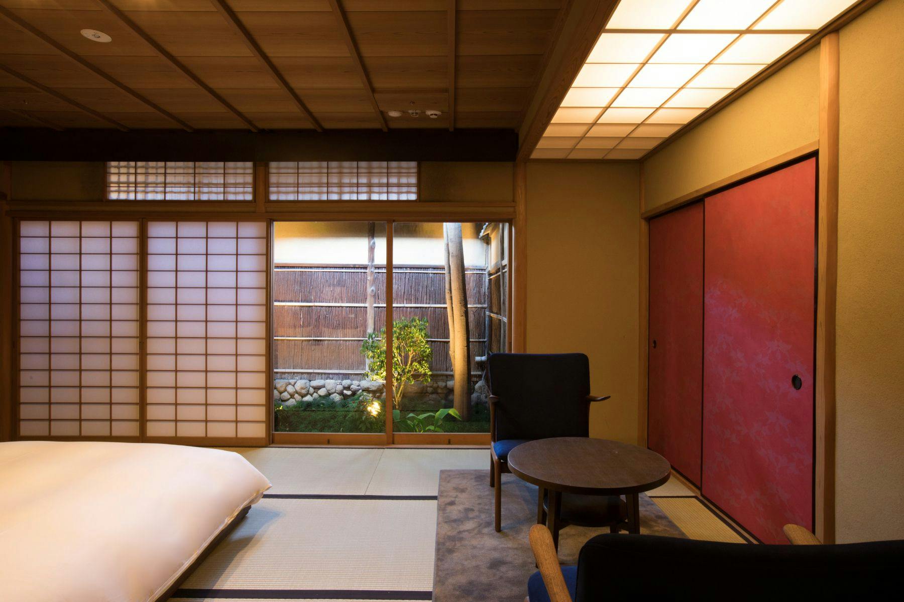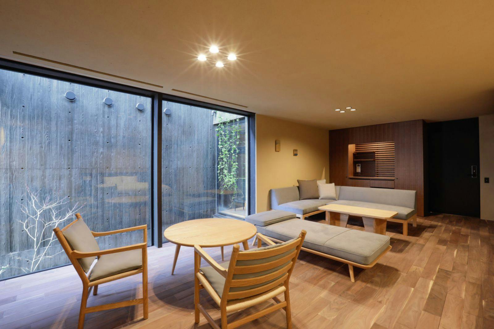 暮らすように滞在できる、町家スタイルの離れ。瓦敷きの土間は吹き抜けになっており、バスルームはシックな黒を基調、庭の緑が爽やかに映えます。二階に上がるとベッドルームとミニバーがあり、喧騒を忘れて心静かに寛ぐことができます。