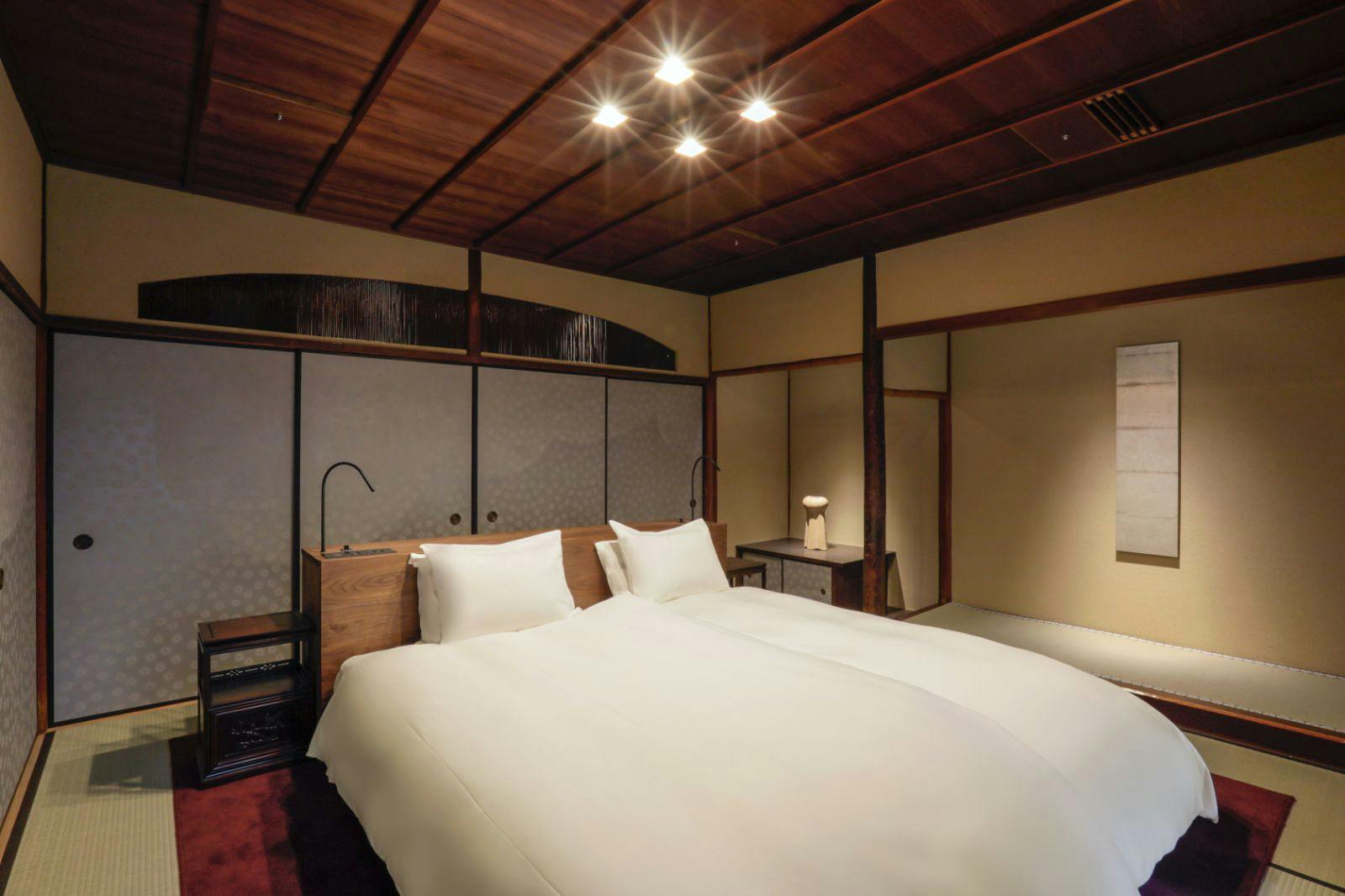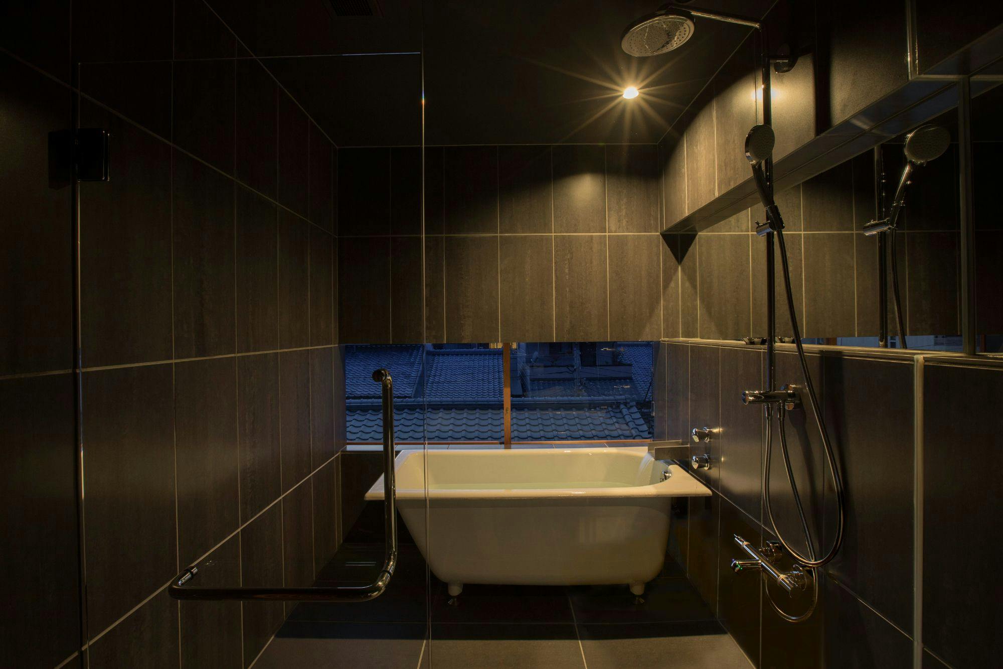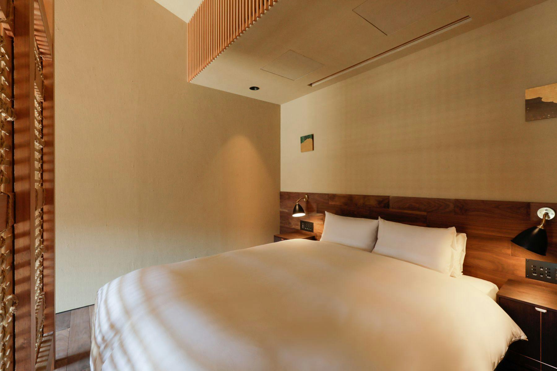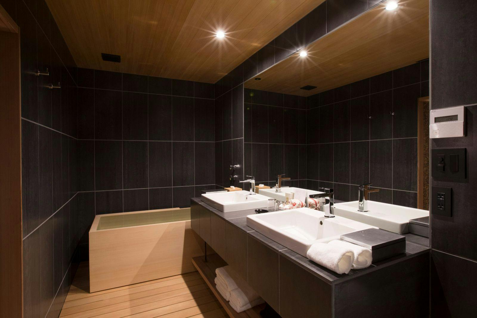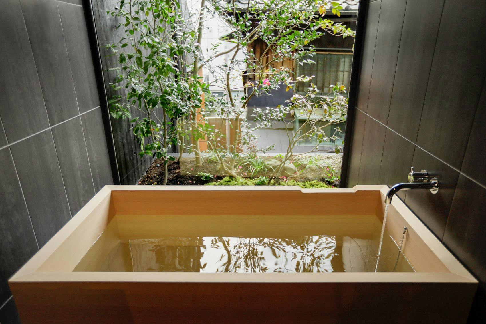 暮らすように滞在できる、町家スタイルの離れ。瓦敷きの土間は吹き抜けになっており、バスルームはシックな黒を基調、庭の緑が爽やかに映えます。二階に上がるとベッドルームとミニバーがあり、喧騒を忘れて心静かに寛ぐことができます。