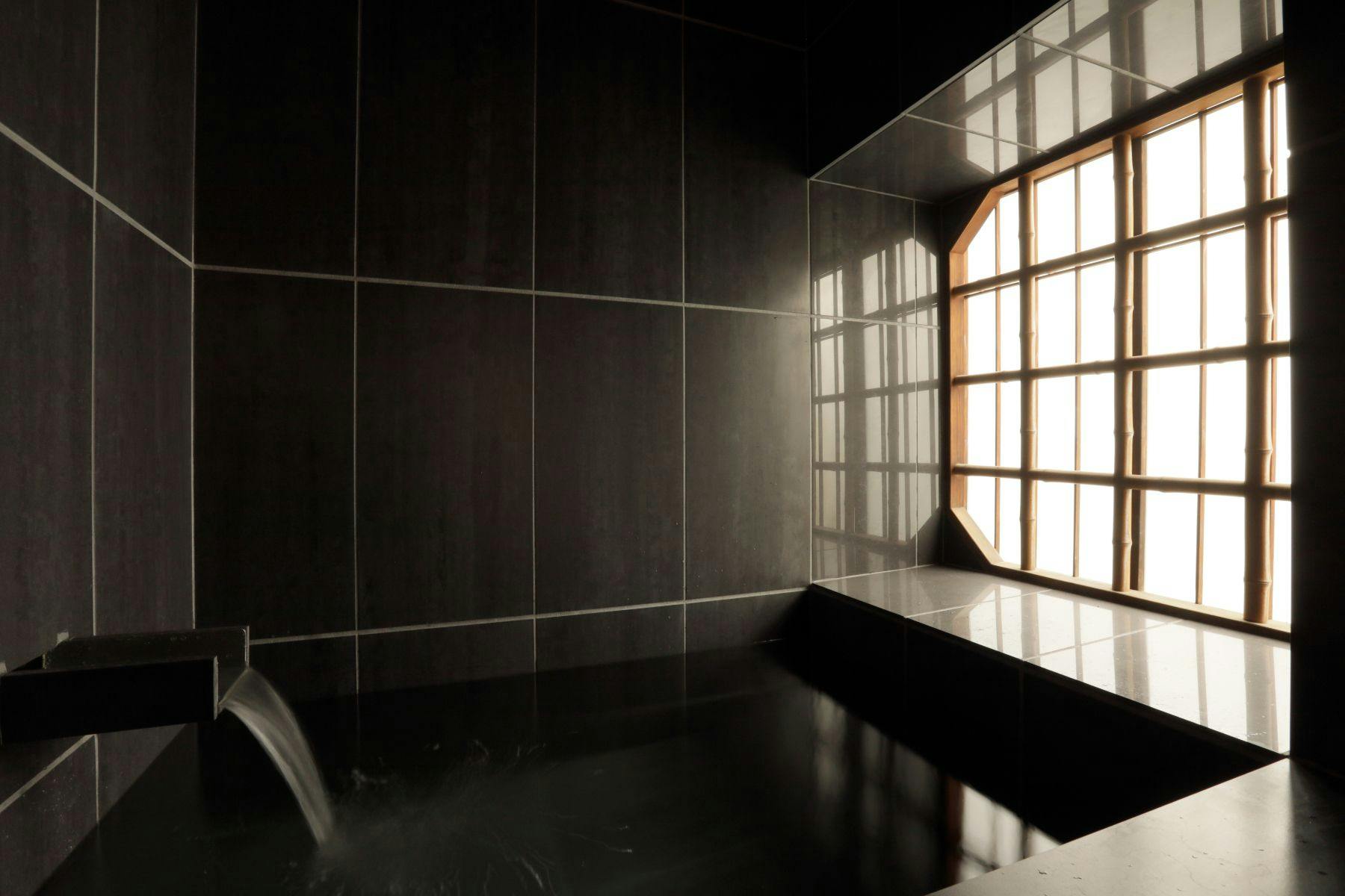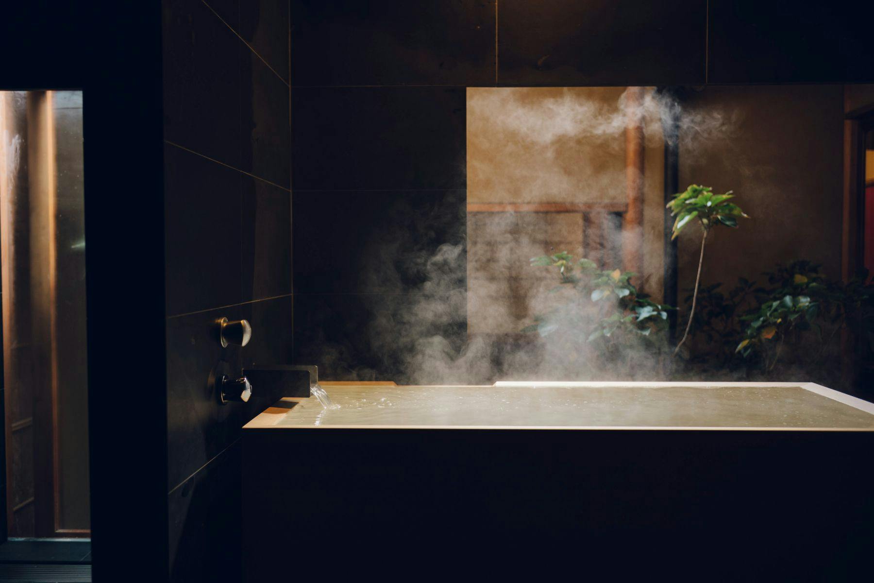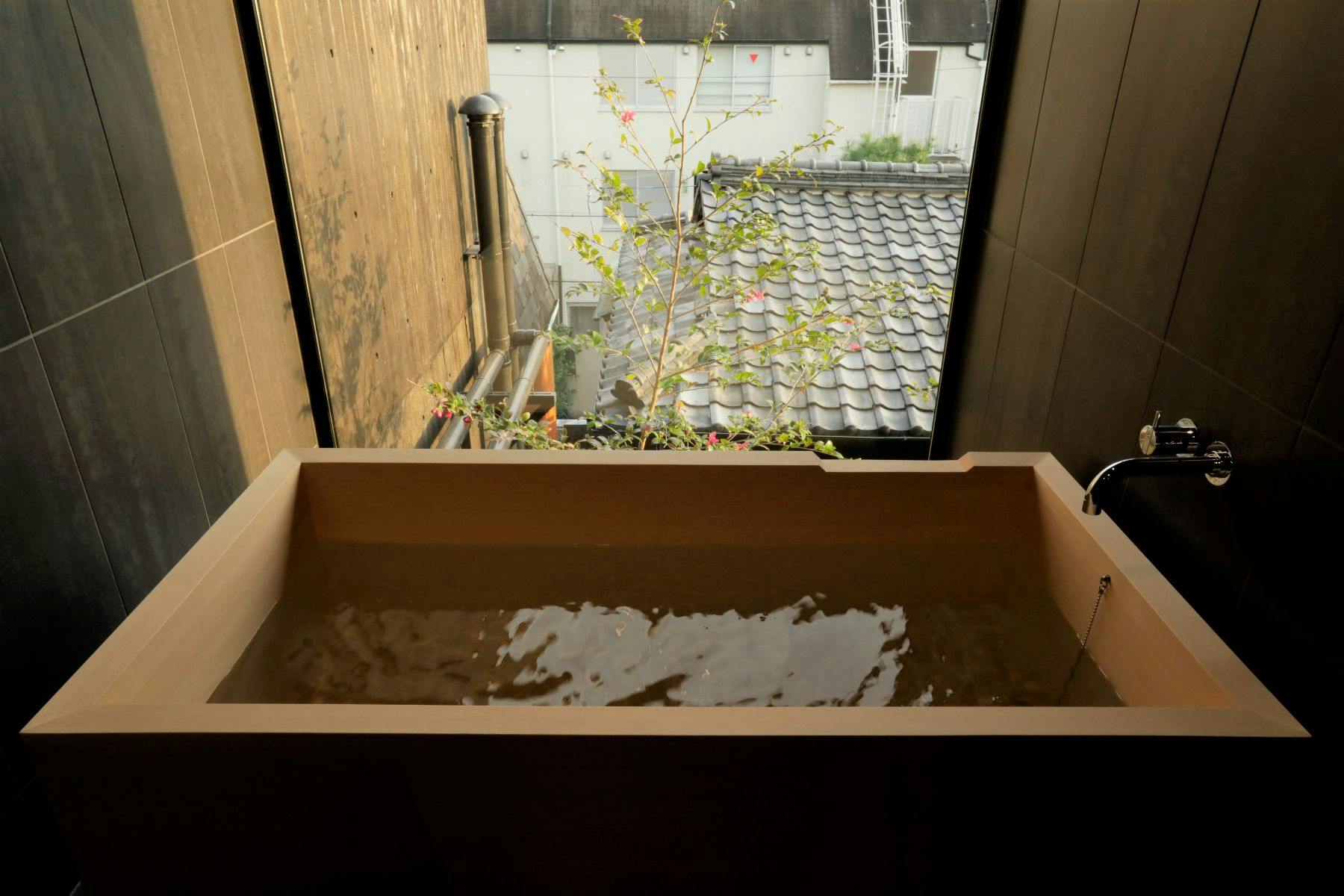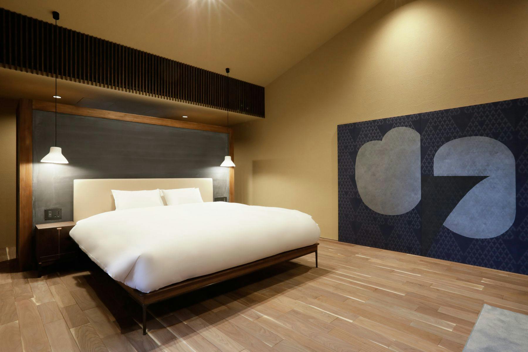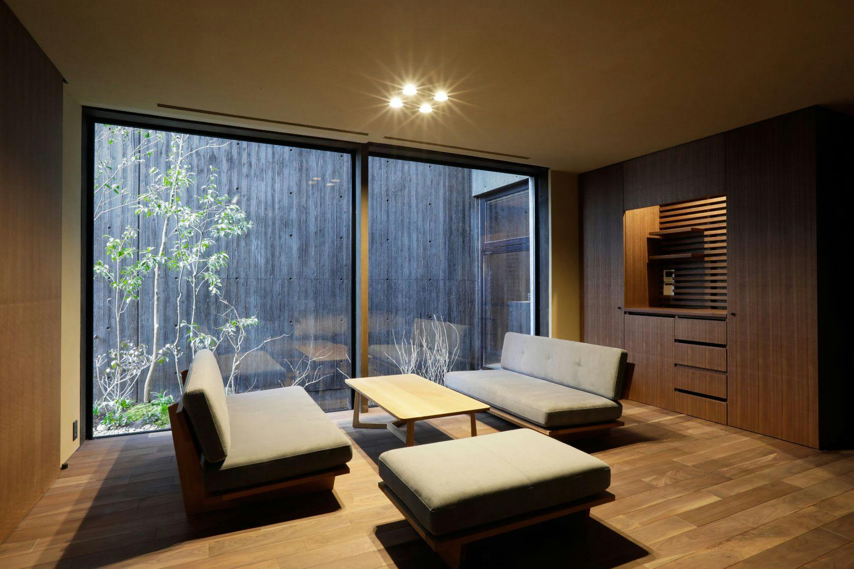 暮らすように滞在できる、町家スタイルの離れ。瓦敷きの土間は吹き抜けになっており、バスルームはシックな黒を基調、庭の緑が爽やかに映えます。二階に上がるとベッドルームとミニバーがあり、喧騒を忘れて心静かに寛ぐことができます。