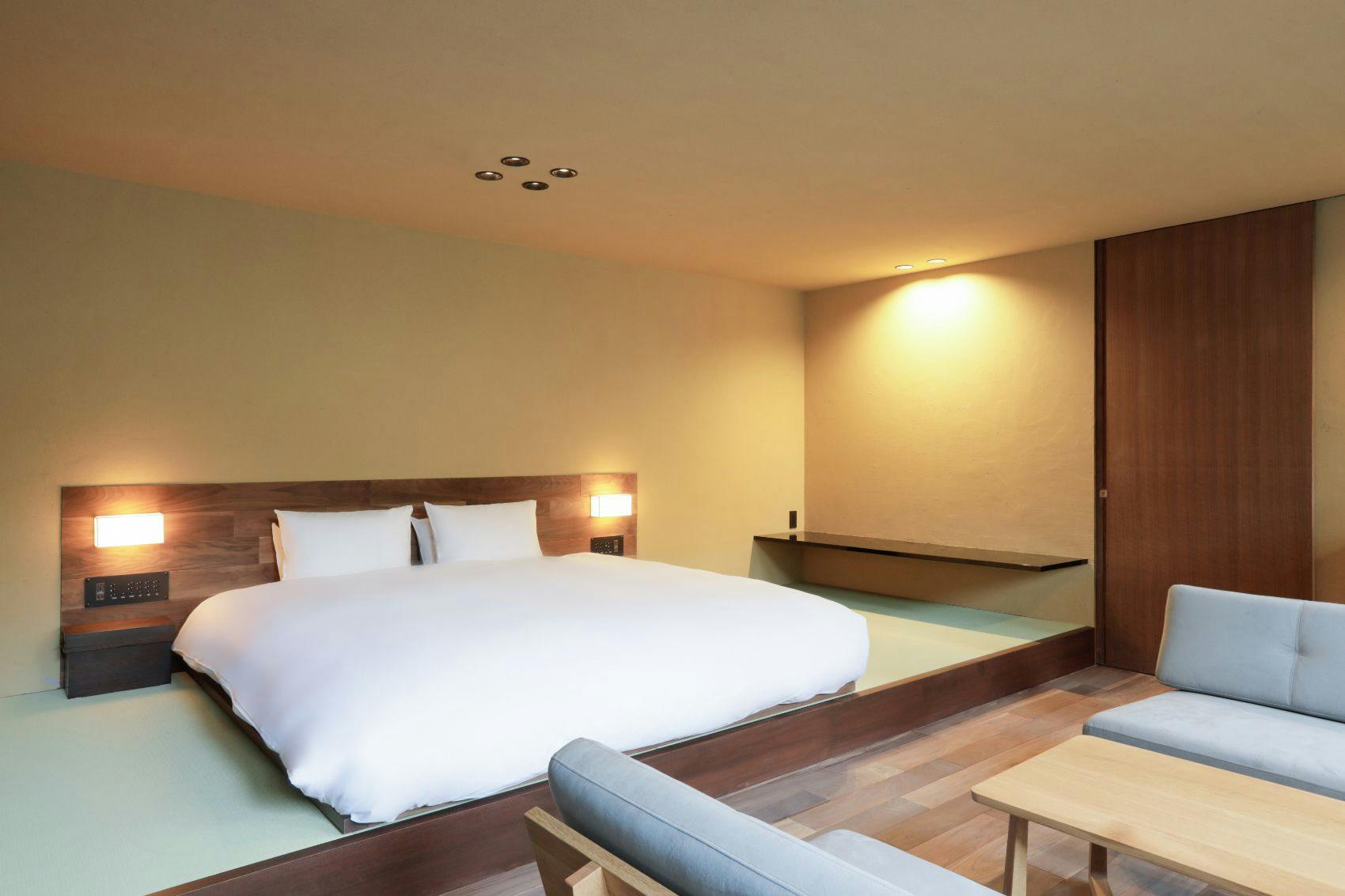 キングサイズのベッドでゆったりとお休みになれる、静かなお部屋です。つややかな黒漆の床の間に、勾玉を思わせる個性的な障子窓。窓の向こうに見える木々がゆかしく、季節の移ろいを光と陰、そして緑に感じながら、和の風情を堪能できます。
