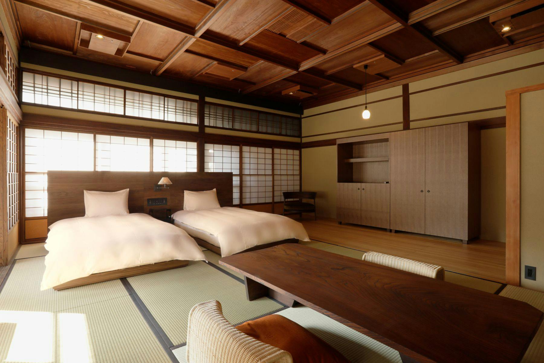 大正時代に建てられて以来、祝いの席に欠かせなかった大広間の一部が、客室に生まれ変わりました。縁側のついた、天井の高いモダンなワンルーム。東と南の大きな窓から、たおやかな緑、そして瓦屋根の向こうに東山の景色が臨めます。