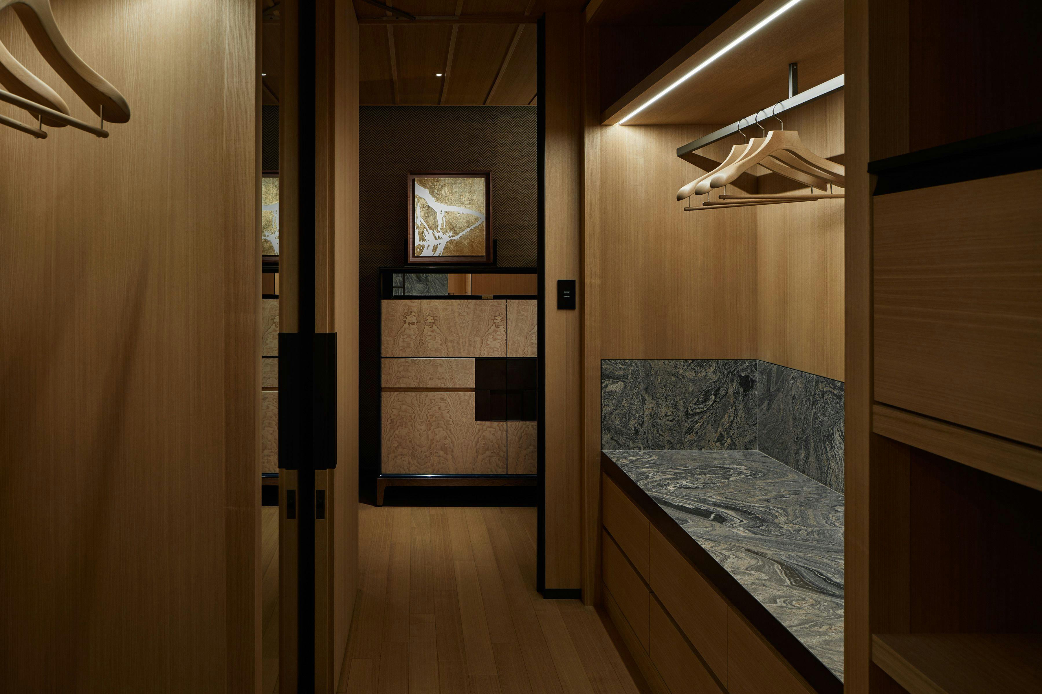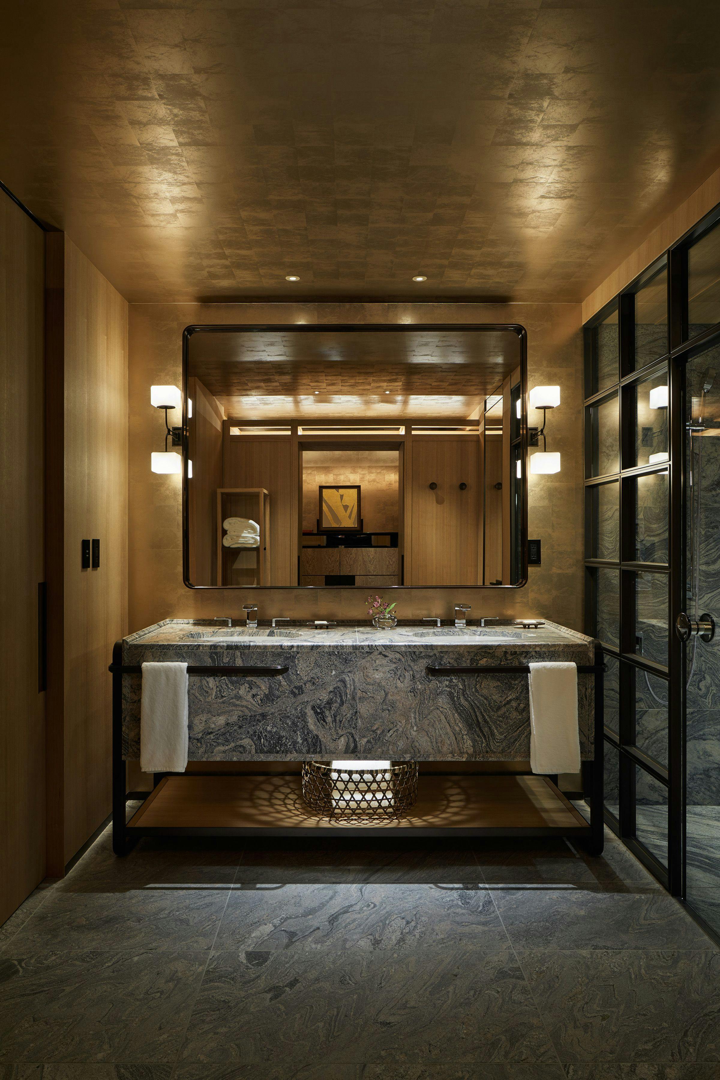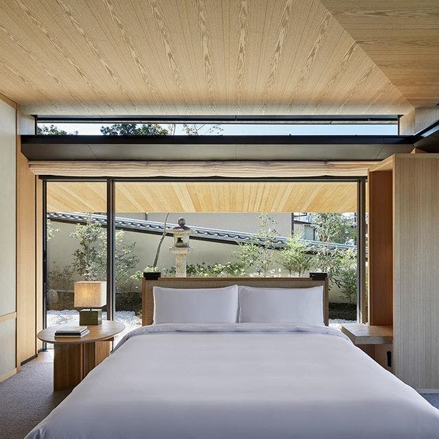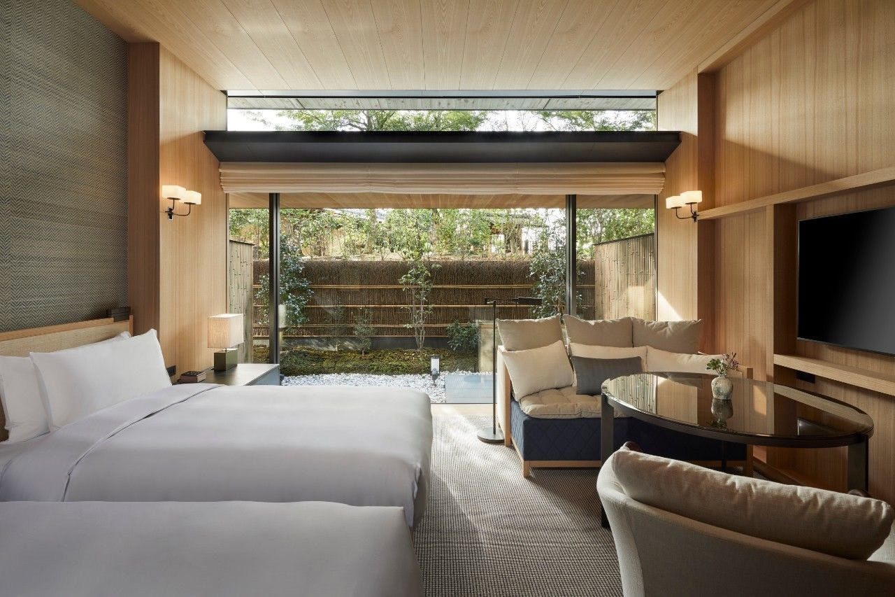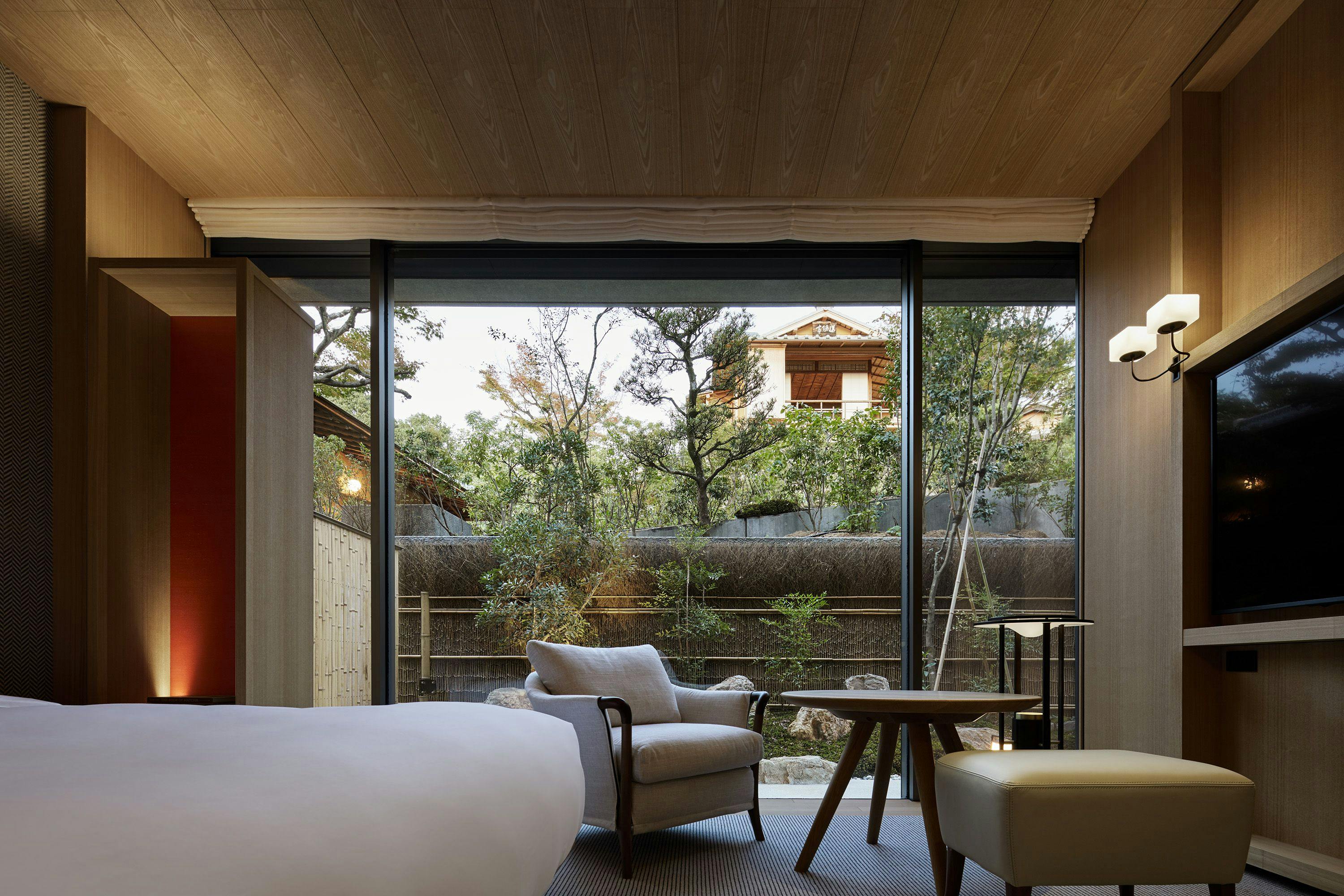 京都の静けさと平穏を感じていただくことができる、坪庭やプライベートの日本庭園付きの45平米のお部屋です。京都の山々をコンセプトにしたインテリアは、芳しいタモ材や地元の素材が取り入れられ、心地のいい空間を作り出しています。ツインベッド、ワーキングエリアとデイベッドが備えられ、東山での寛ぎのひと時をお過ごしいただくことができます。