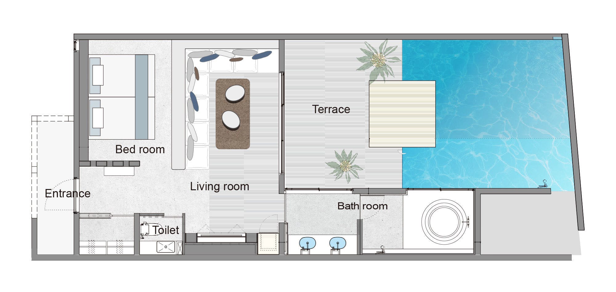 ベッドルーム&リビング&プールがひとつの流れで設計された、グランブルーギャマンのコンセプトルーム。プールからそのままバスルームに入れる空間も開放感満点。上質を極めた空間で至福のひとときをどうぞお楽しみください。
