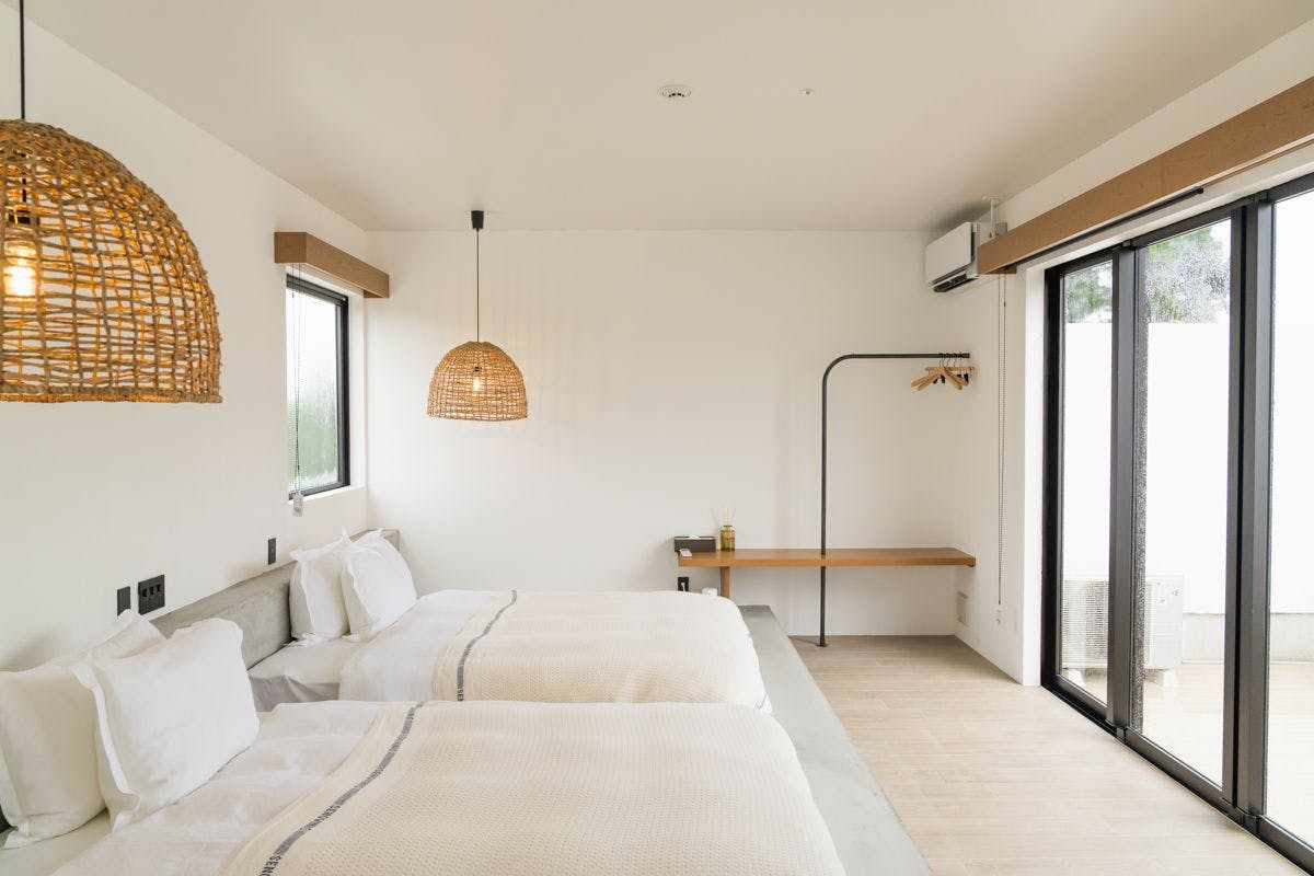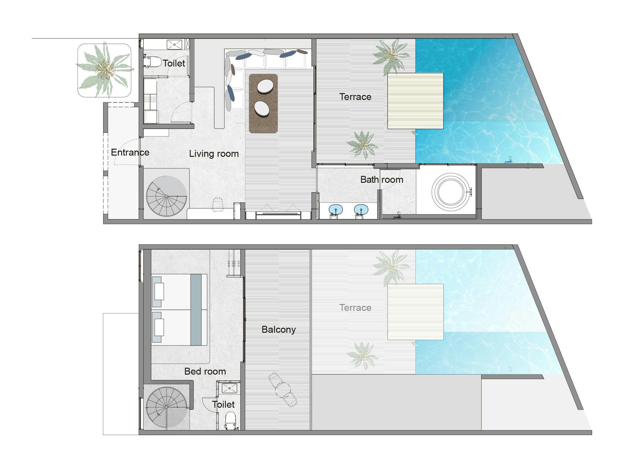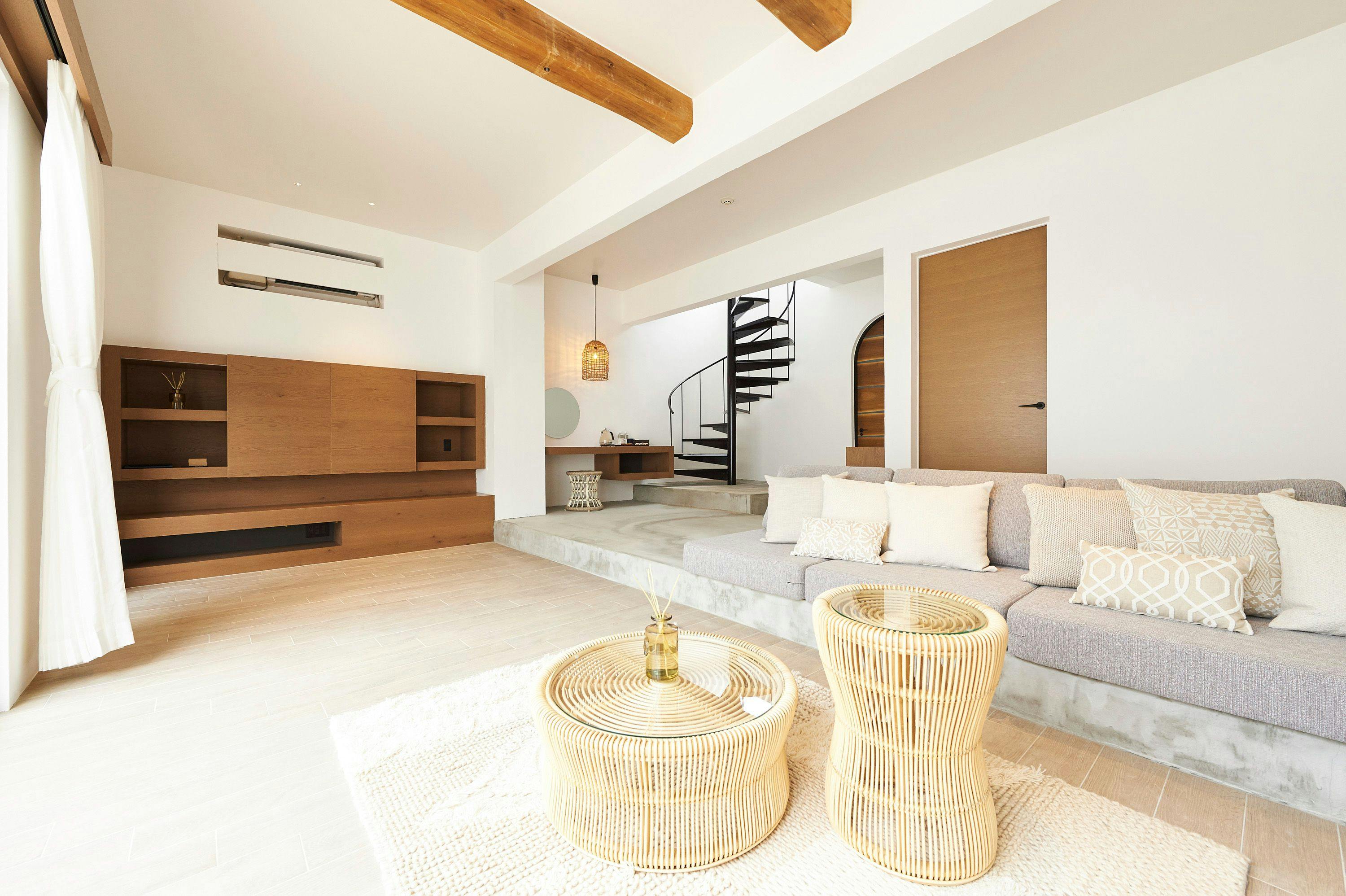 リビングとベッドルームが独立したメゾネットタイプ。客室の広さは93平米とゆったりサイズ。お天気の良い朝はプールサイドや2階のテラスで透き通った南の風を感じてください。