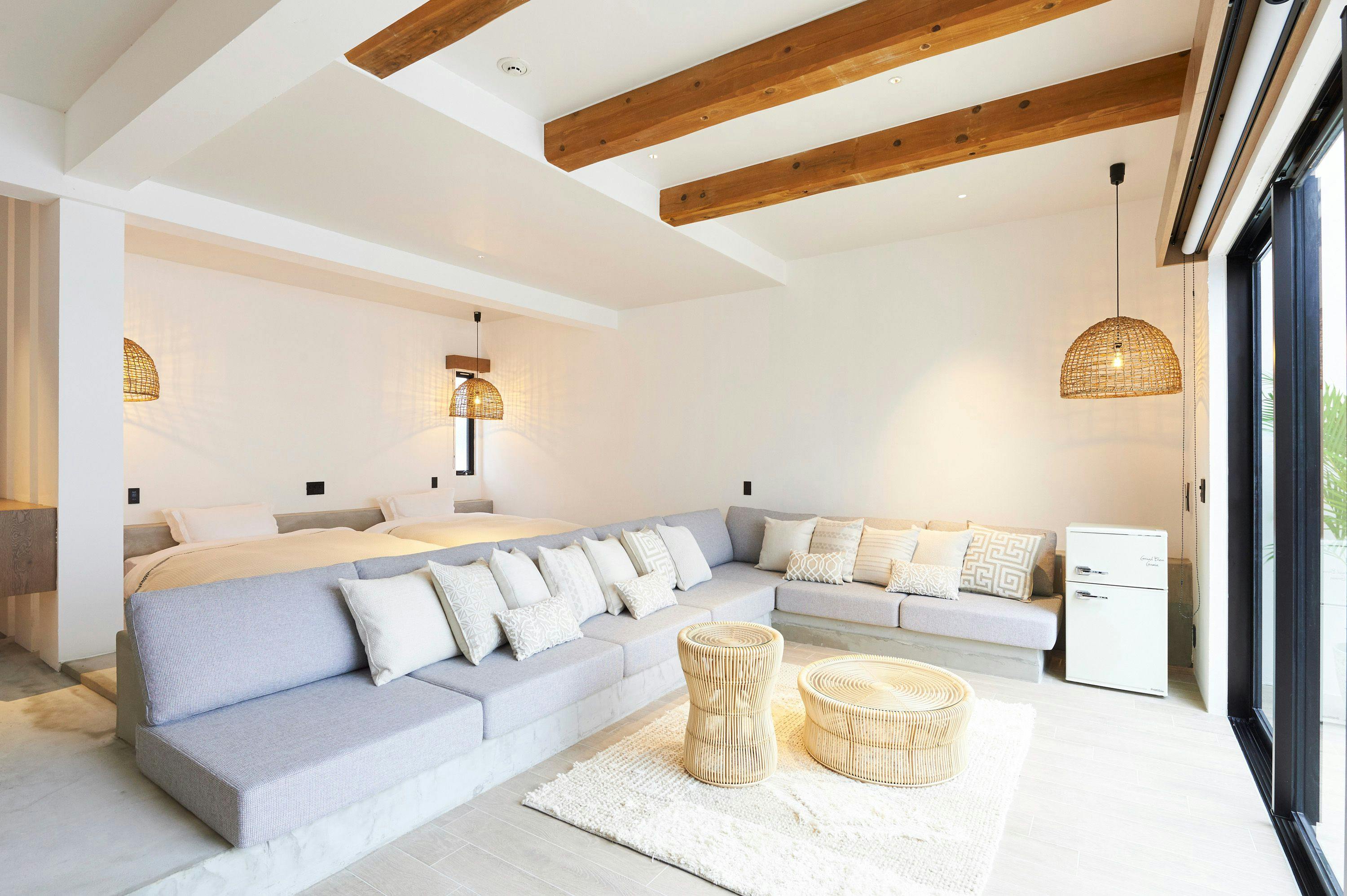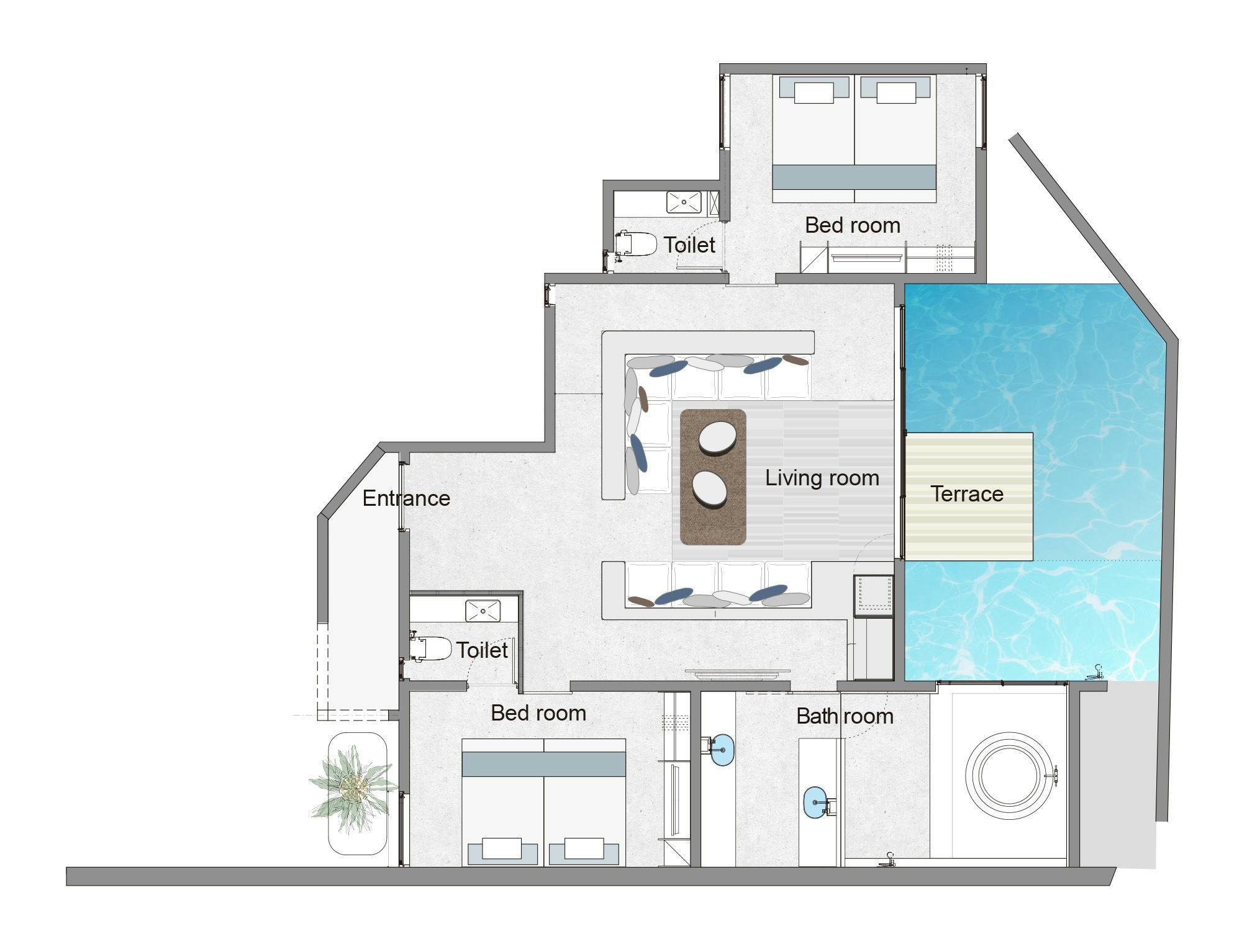 リビングと独立した2ベッドルームを備えた3ルームタイプのお部屋です。客室スペースはゆとりの107.29平米。ファミリーにもお友達同士にも最適なバカンス空間。プライベートプールと一体感のあるゆったりしたリビングで極上の居心地をご堪能ください。