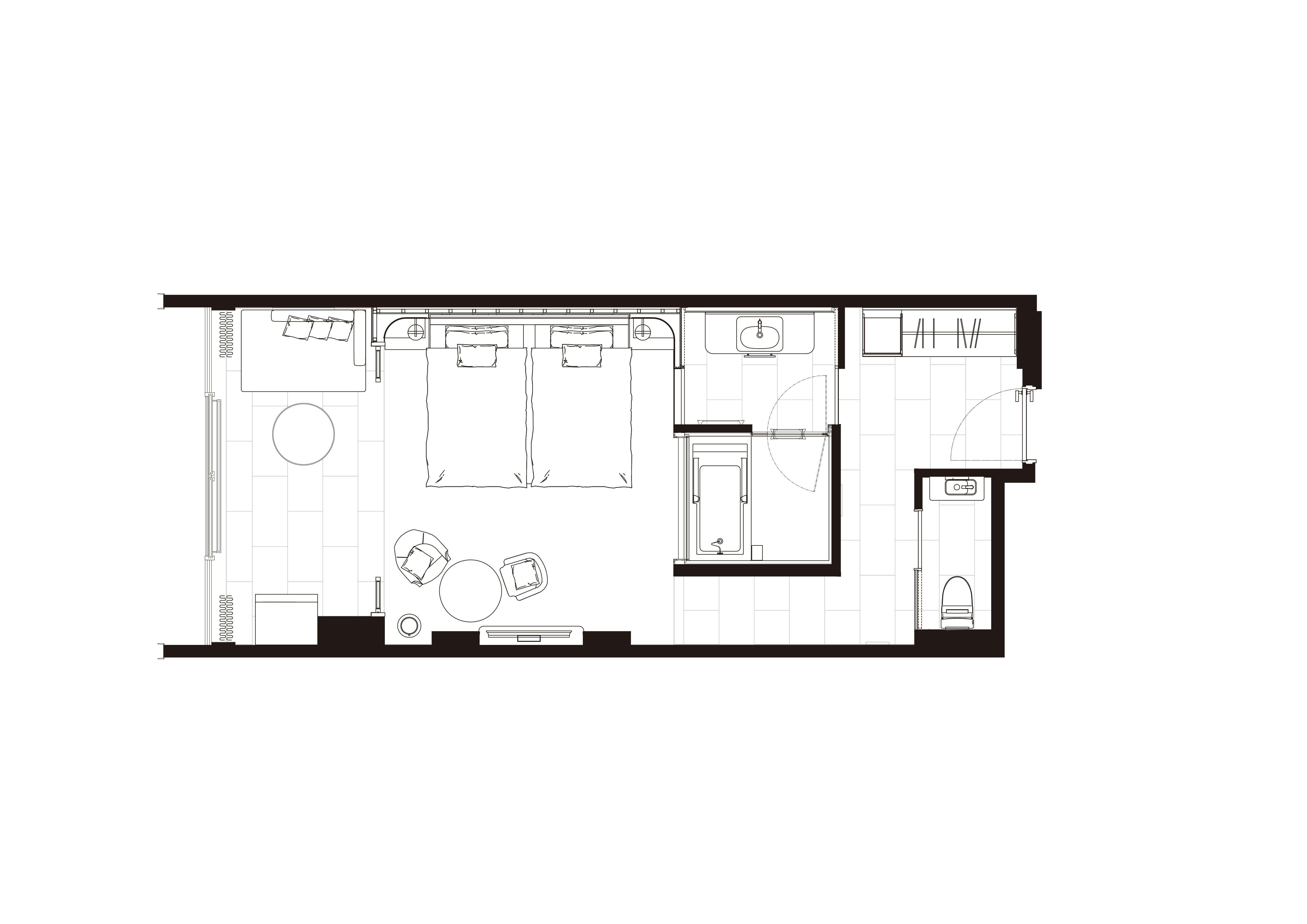 バスタブ、シャワー、トイレ(温水洗浄便座)、インターネット接続(Wi-Fi・有線LAN)、HDMI端子、朝刊(要事前リクエスト)、地上波・BSデジタル対応液晶テレビ、冷蔵庫、ミニバー、エスプレッソマシーン、湯沸かしポット、セーフティーボックス、電話、アイロン&アイロン台、ヘルスメーター、ヘアドライヤー、ナイトウエア、バスローブ、バスタオル、ハンドタオル、ウォッシュタオル