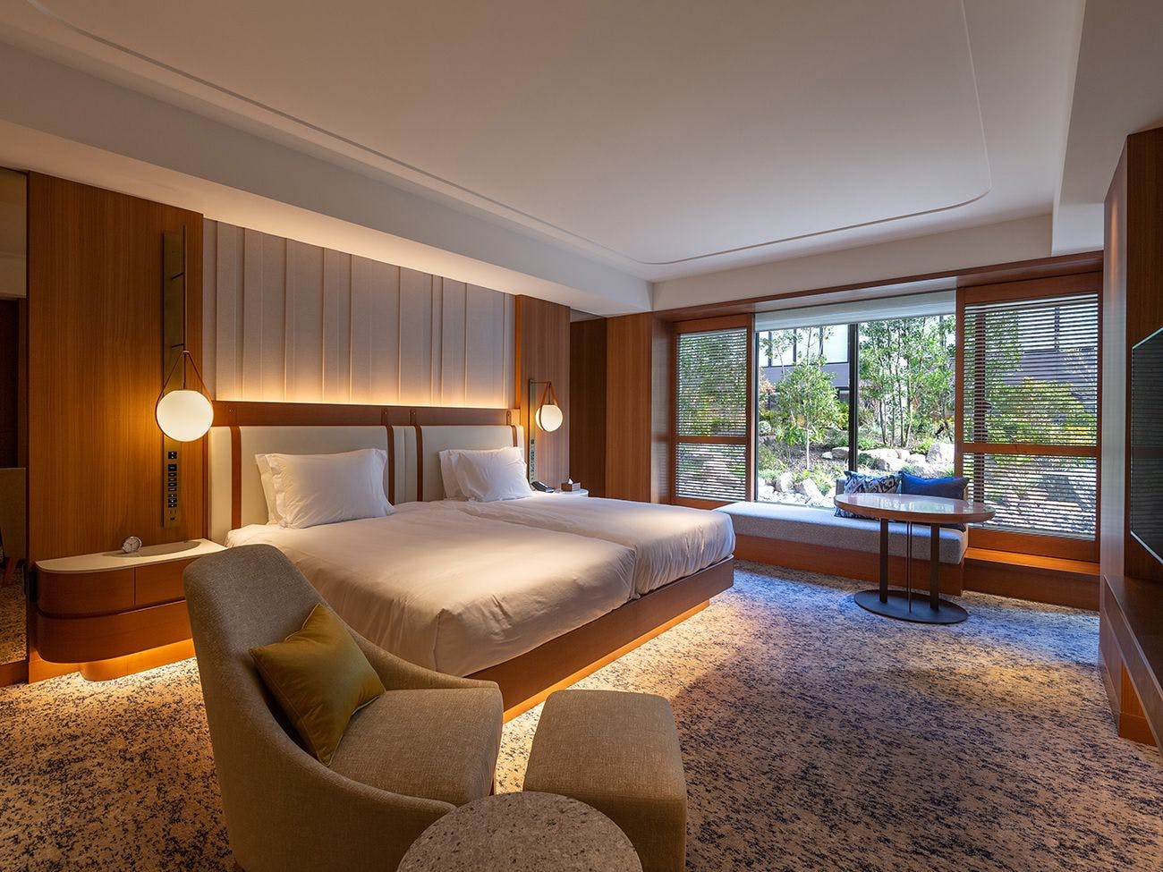 窓越しに感じる中庭の緑で、季節をお楽しみいただけます。広々としたバスルームでは、優雅なバスタイムを。