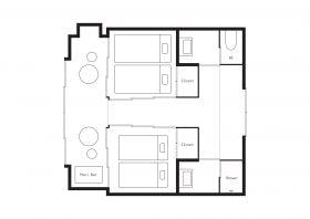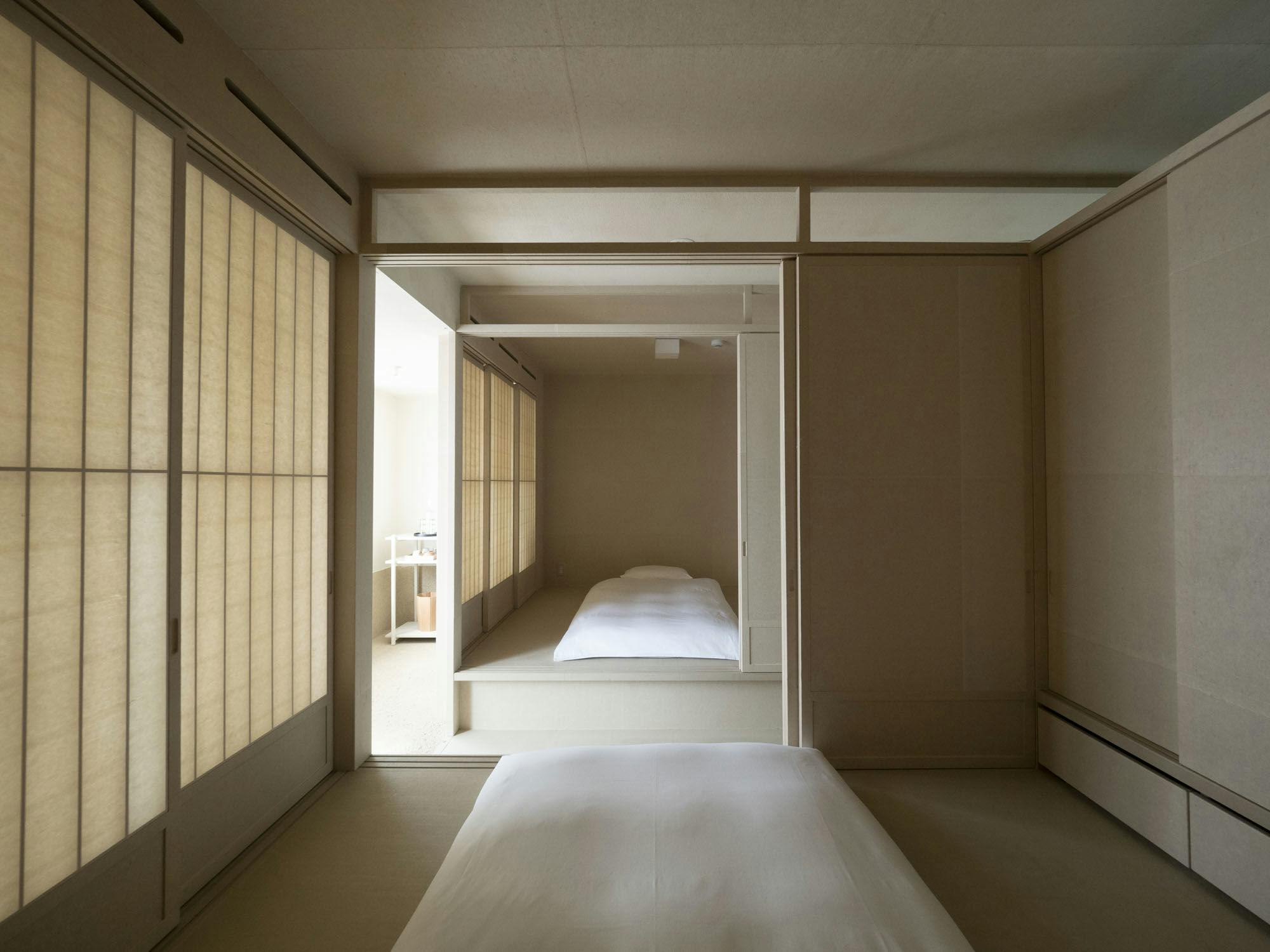 障子で区切った小上がりのベットスペースが、お部屋の左右に2つあります。それぞれのスペースには、シングルサイズのお布団を2組ずつ敷くことができます。3階にある6室のお部屋は、ビジョイ氏の”be gentle(優しくあれ)”という言葉にならい、床、壁、天井に和紙を張り繭に優しく包み込まれるようなイメージで、できるだけ人の感覚にソフトに伝わるよう設えています。窓から届く光も柔らかく、静かで平穏な時間が流れます。宿泊のお客様は、同フロアのライブラリーをご利用いただけます。