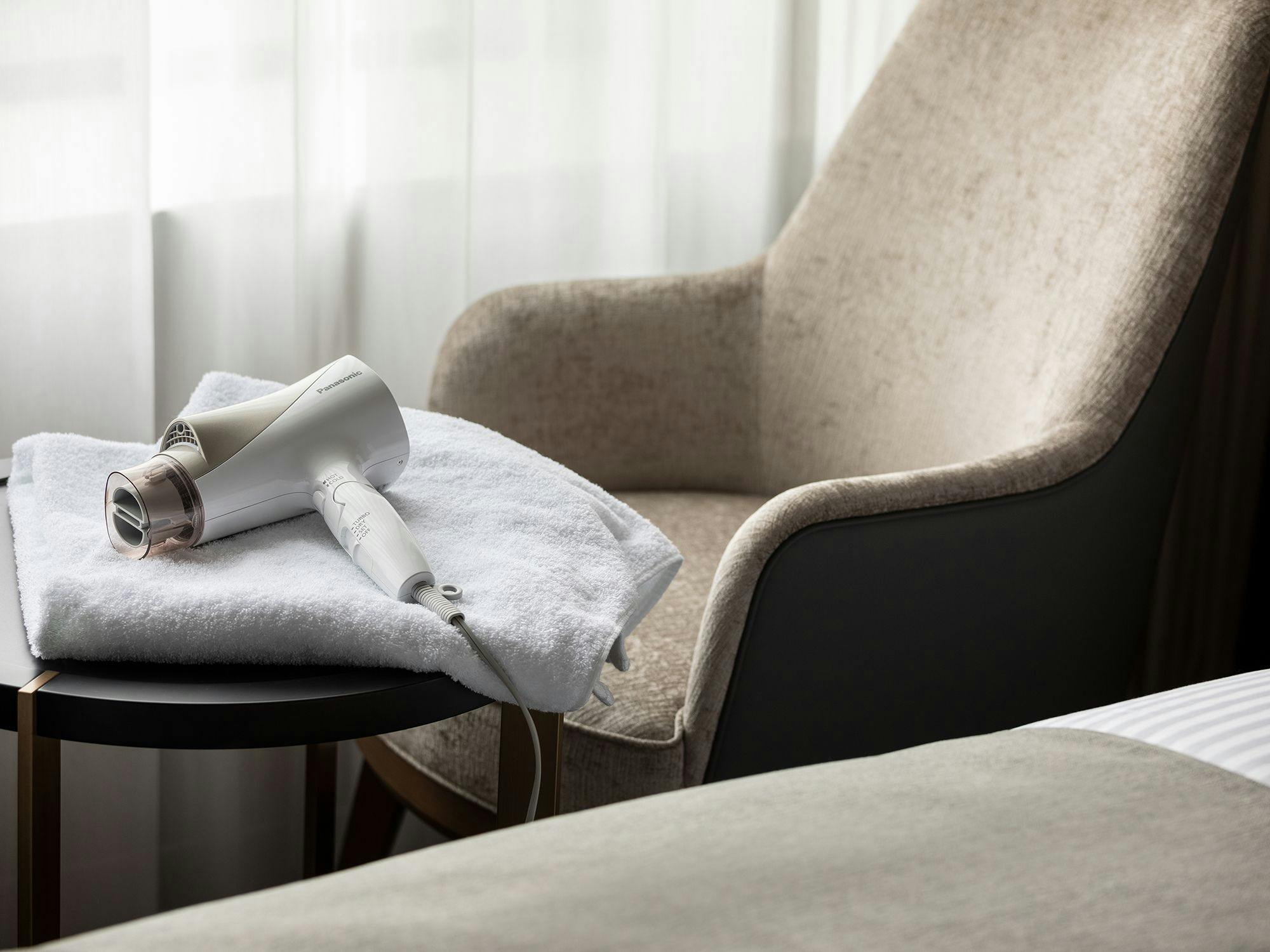 窓を二面に配し、各階のコーナーに位置したお部屋です。プライバシー性の高い落ち着いた空間でお寛ぎください。・リファビューテック ドライヤープロ、リファファインバブル S設置