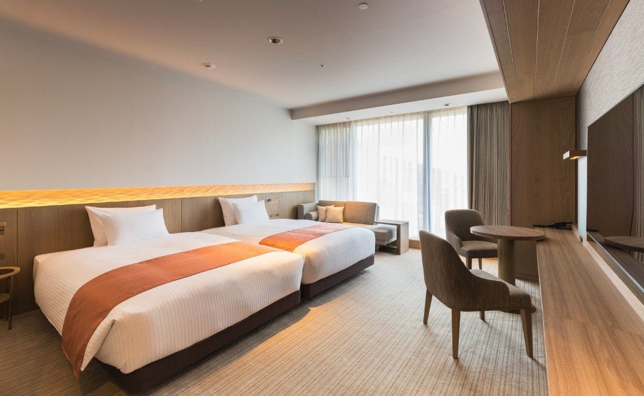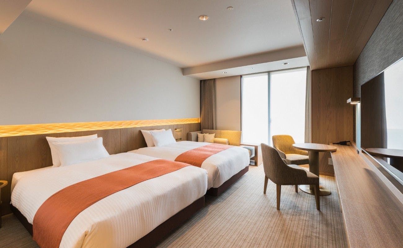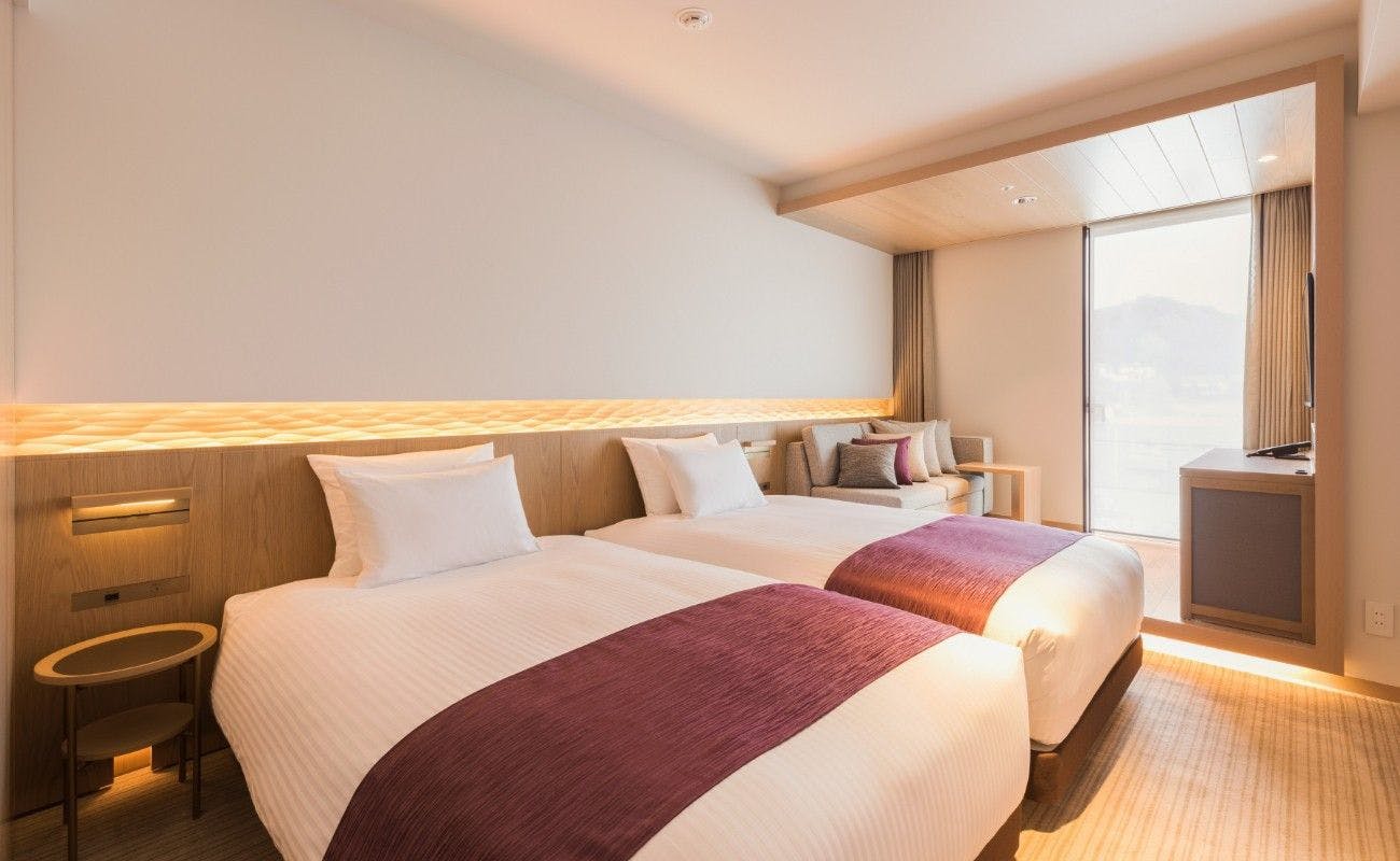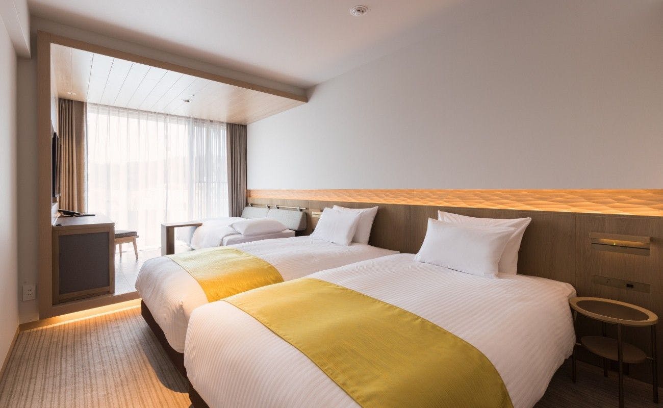 大きな窓から陽光の射し込む明るいスペースに、140cm幅のダブルサイズベッドを2台配置。