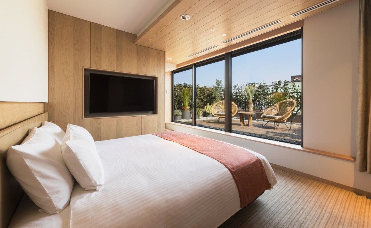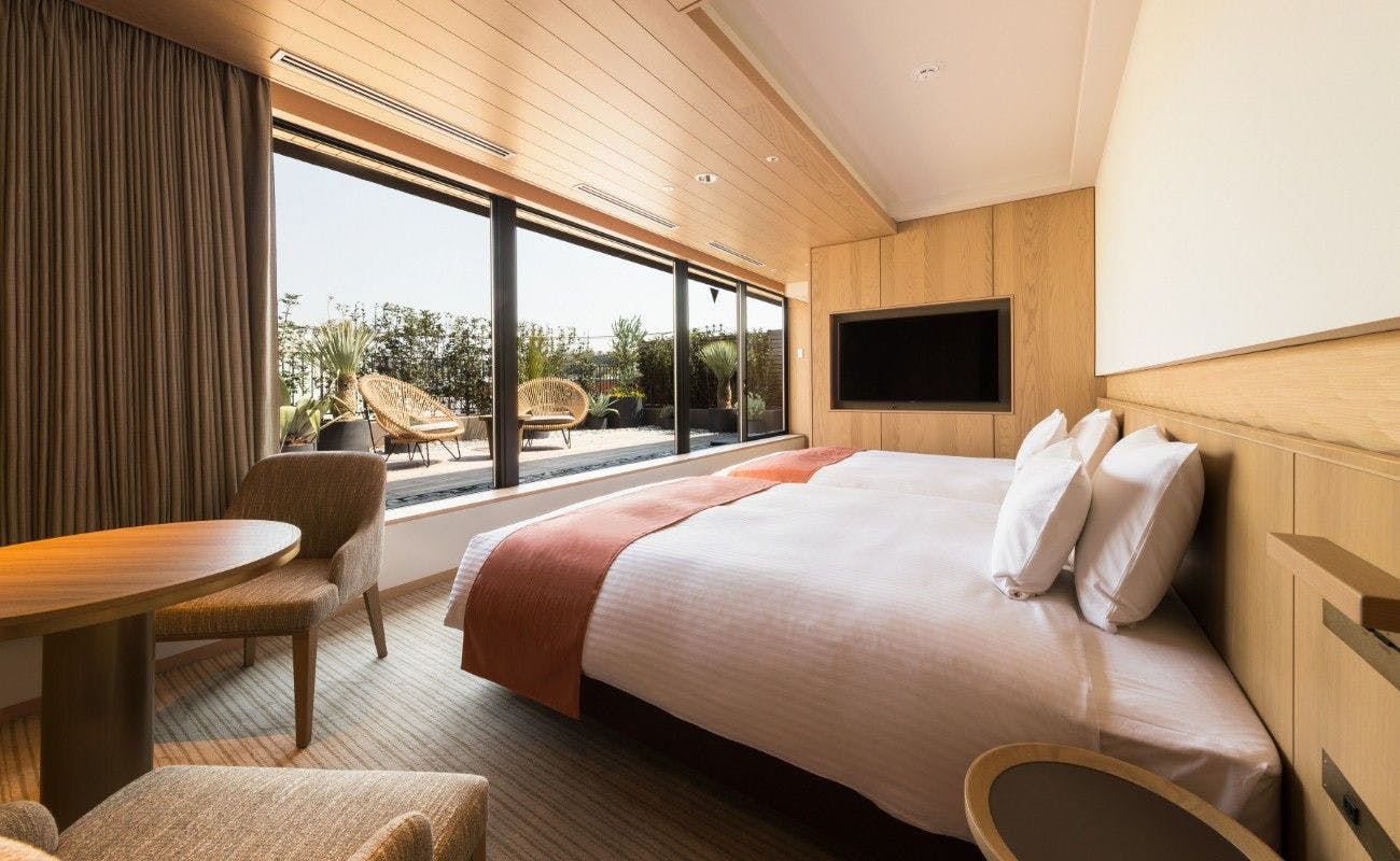 開放的な大きな窓と屋外テラスがついた1室限定のガーデンツイン。